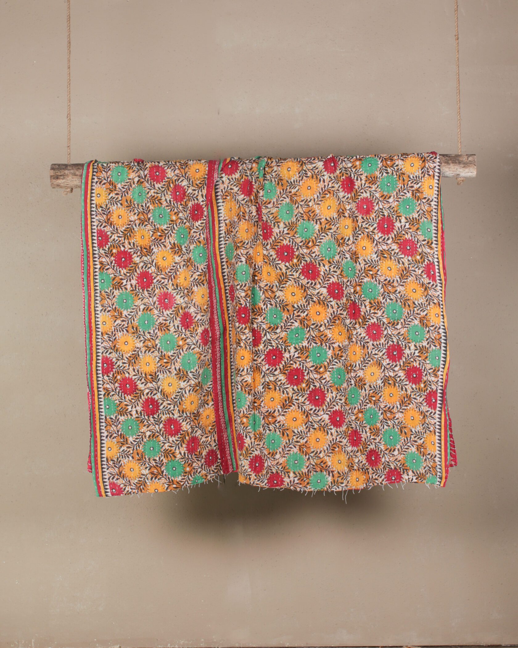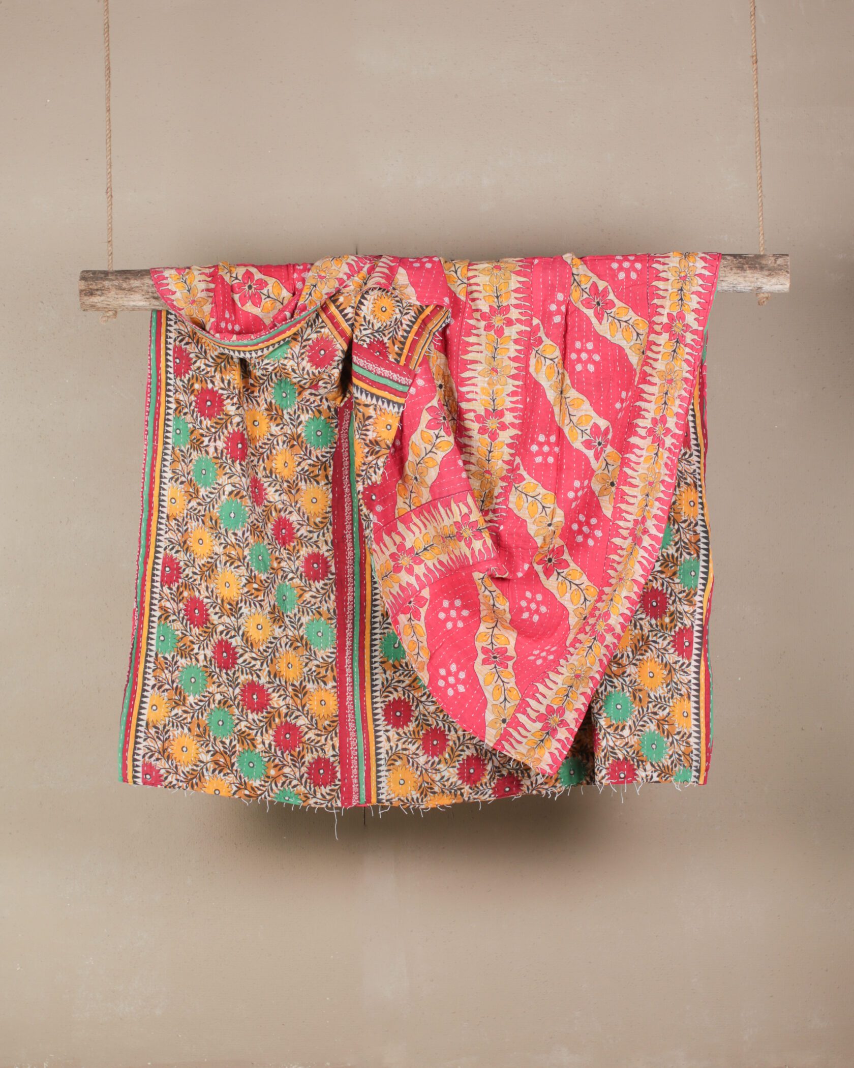 Double-sided Kantha throw featuring bold red, orange, & green florals.