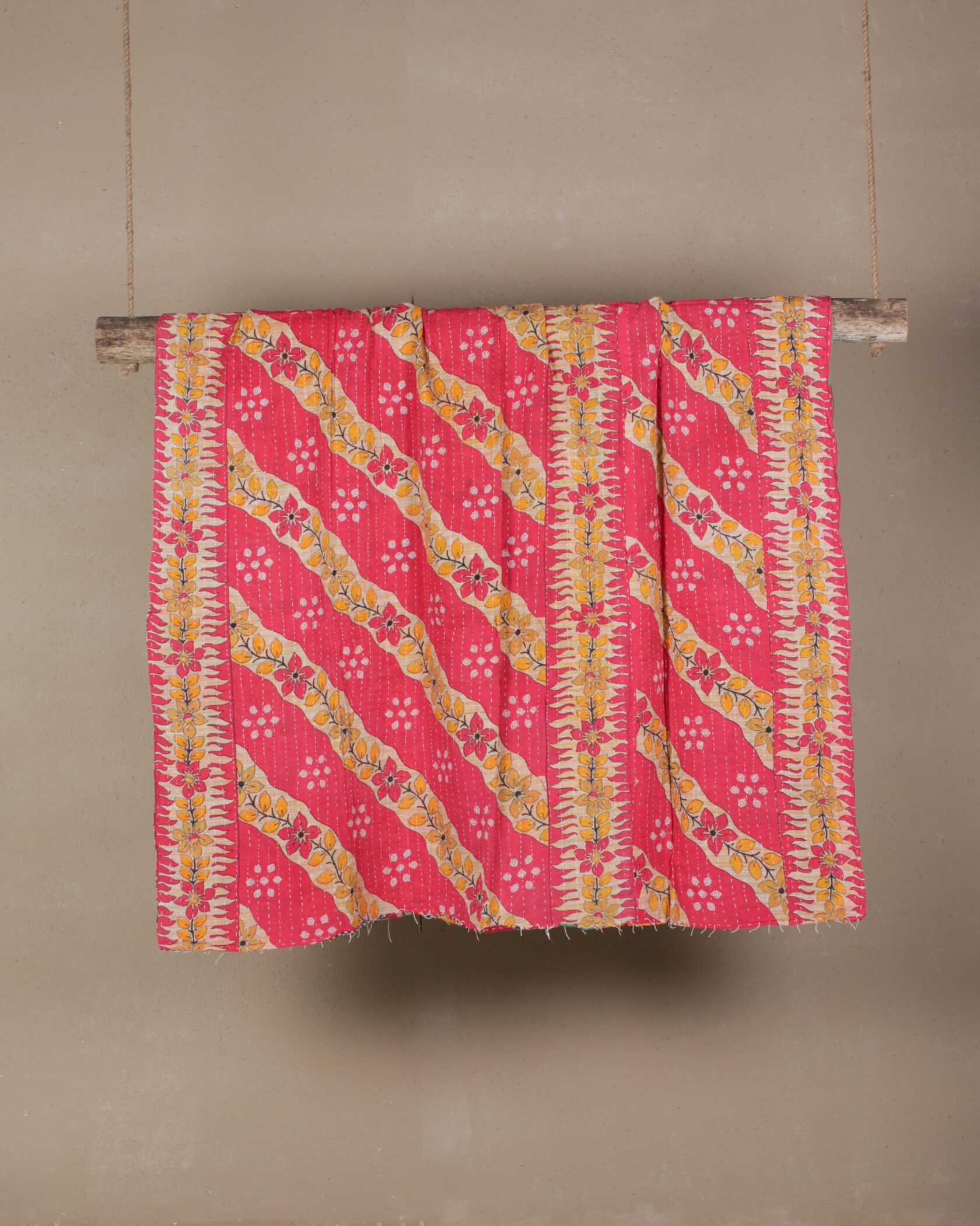 Handcrafted by artisans, this piece showcases intricate Kantha stitching, a traditional Indian technique that involves layering fabric and using running stitches to create a unique, quilted texture. Made from soft, reclaimed fabric, it is both eco-friendly and versatile, ideal for draping over a sofa or bed, or for use as a picnic blanket.