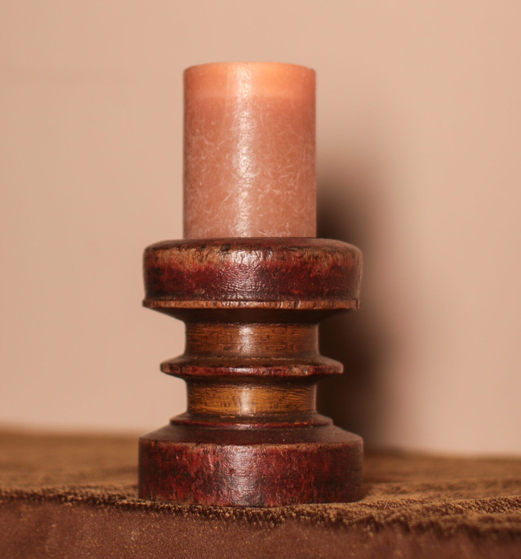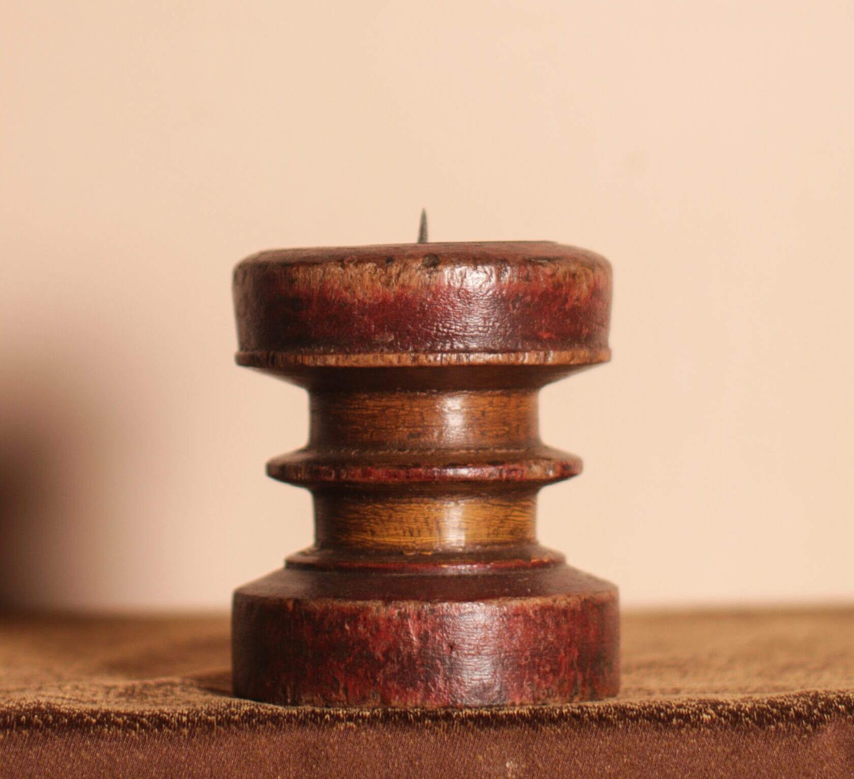 Showcase timeless elegance with this Antique Painted Wooden Candle Stand, featuring a weathered patina & curved shape.