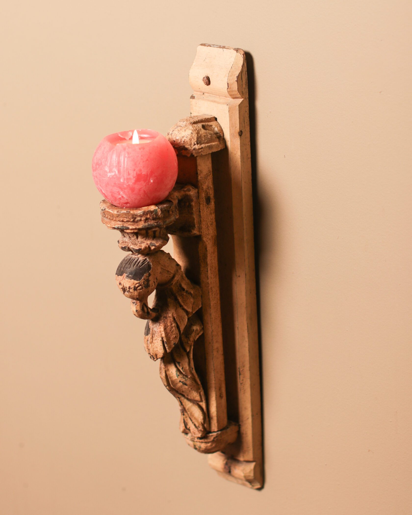 Exquisitely hand-carved parrot bracket, originally used as an oil lamp for illuminating home entrances. Featuring a beautifully detailed parrot, a sacred bird in India, its distressed finish enhances its vintage charm, making it a captivating decorative piece.