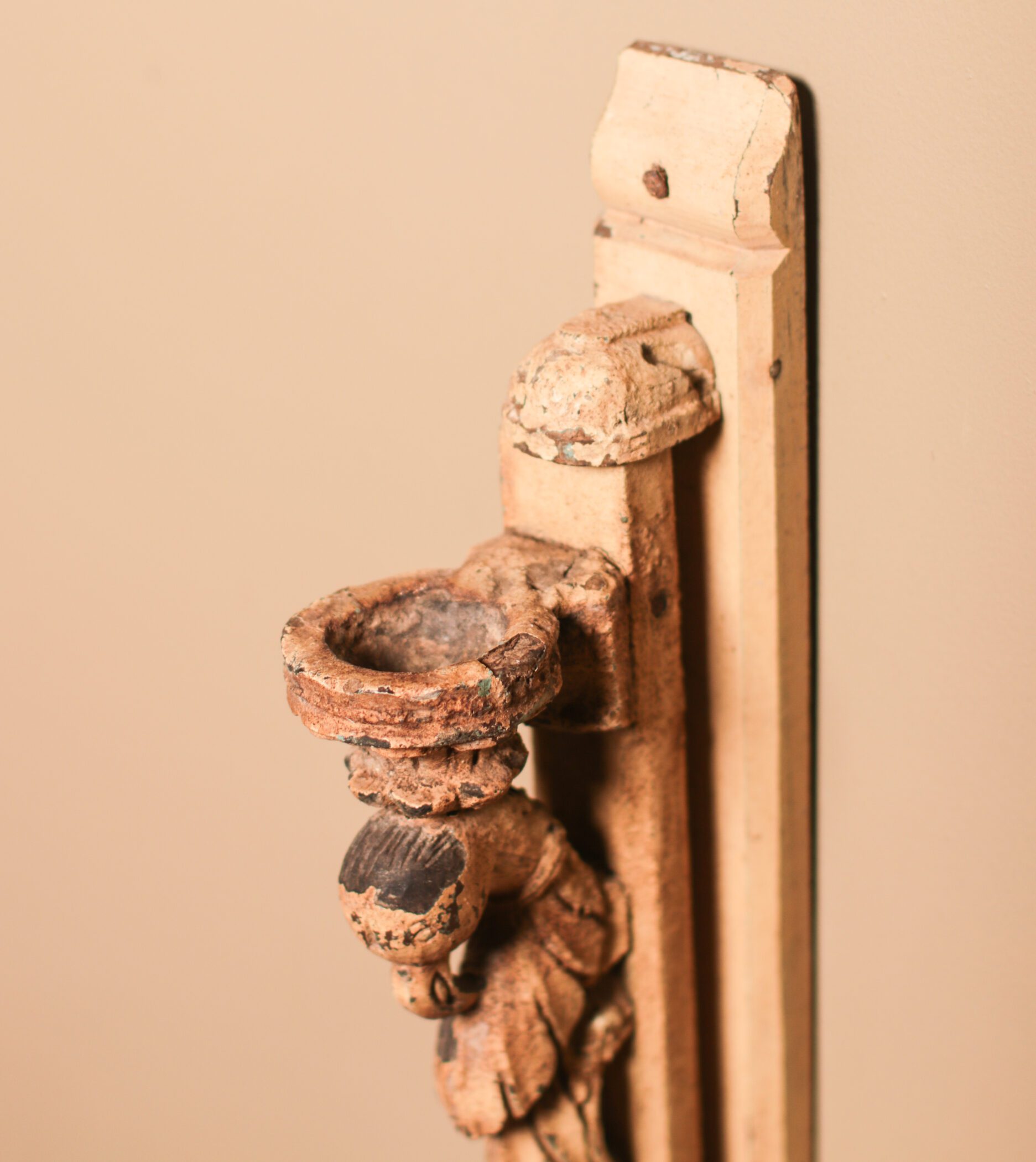 Hand-carved parrot bracket with a distressed finish, originally used as an oil lamp.