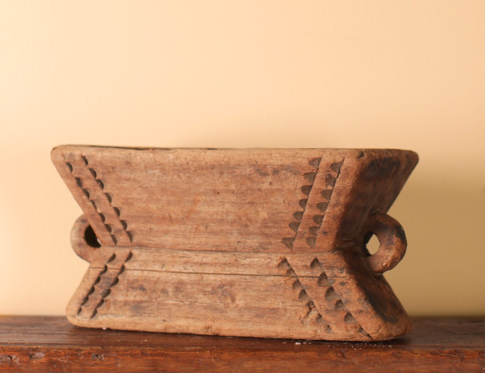 Add a touch of history to your home with this Large Antique Seed Spreader Candle Holder. Originally used in traditional Indian agriculture for sowing seeds, this piece has been repurposed into a practical and attractive candle holder. The rough-aged wood finish and small, hand-carved details emphasise its rustic charm and craftsmanship. Its unique and unusual double-sided design allows for versatility, displaying two candles or decorative pieces.