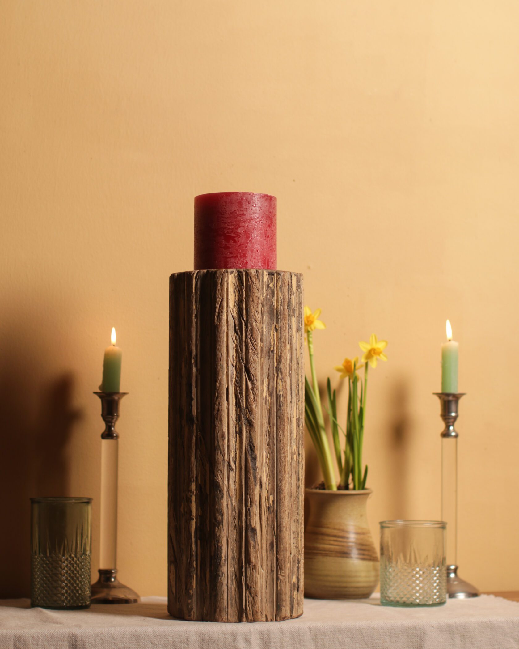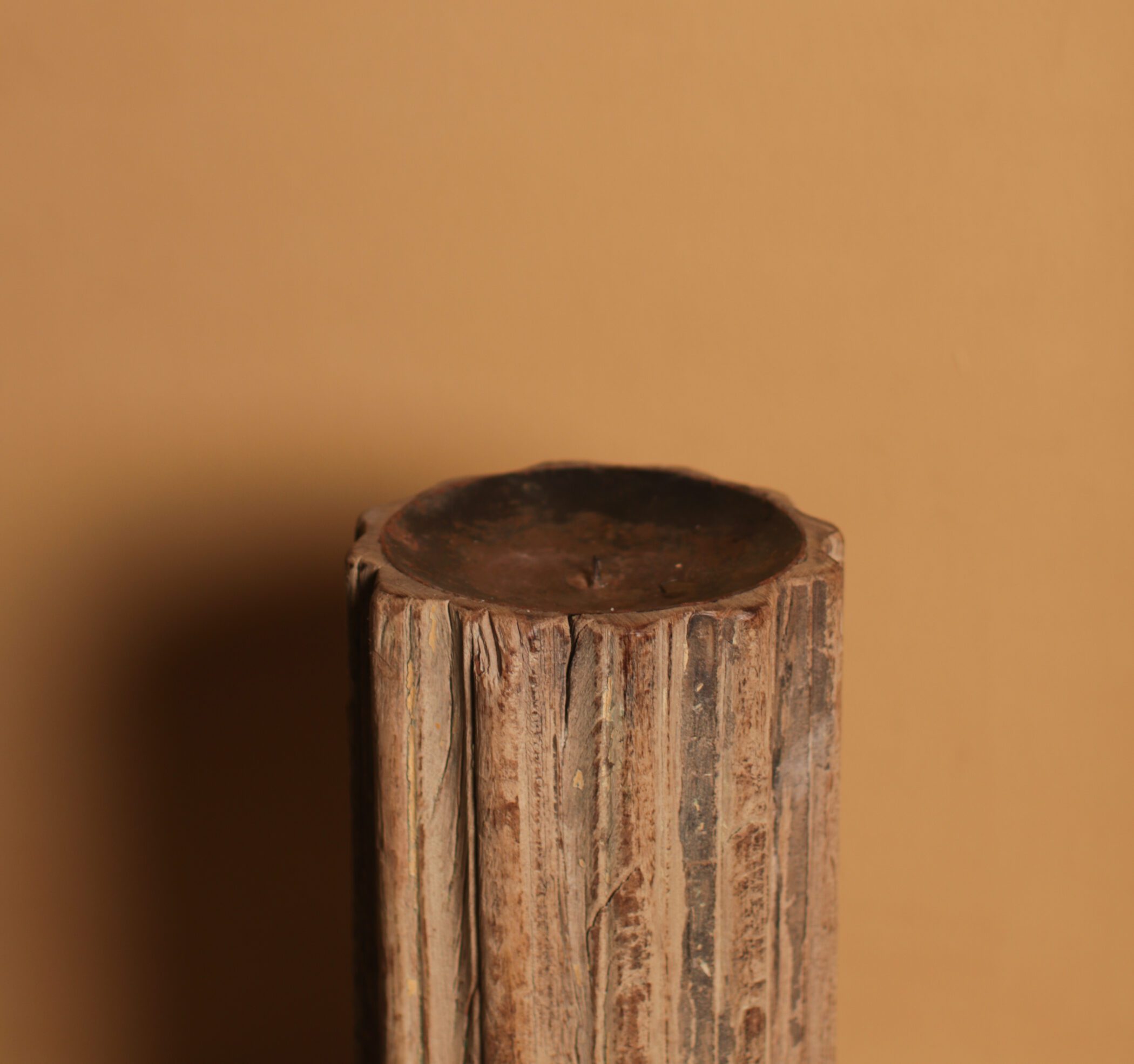 A piece of history, this Antique White Wooden Pillar Candle Stand has been crafted from an Indian pillar cross-section, boasting a beautifully aged patina.