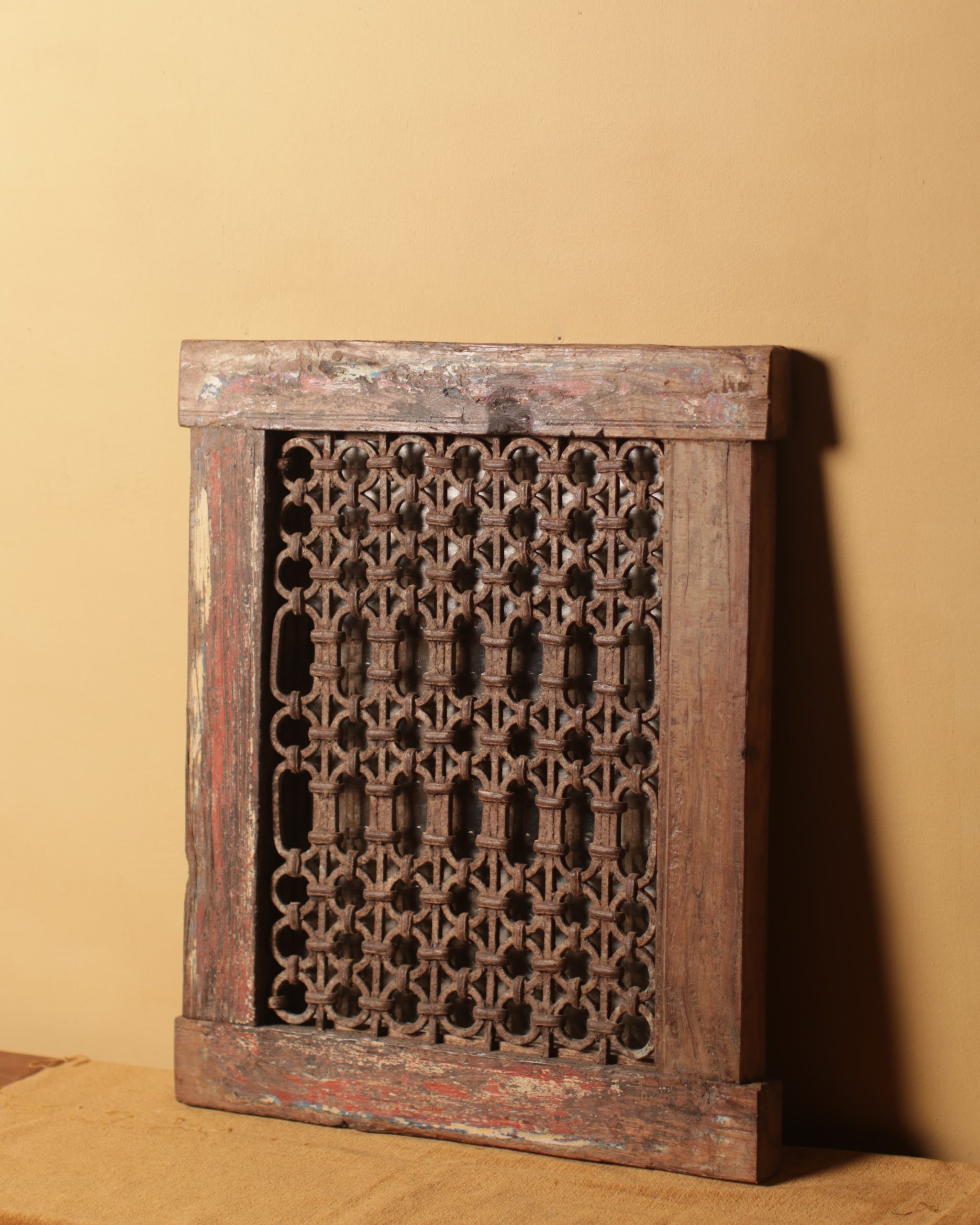 Embrace the heritage of traditional Indian craftsmanship with this Antique Wooden Jali Mirror, repurposed from an old window.