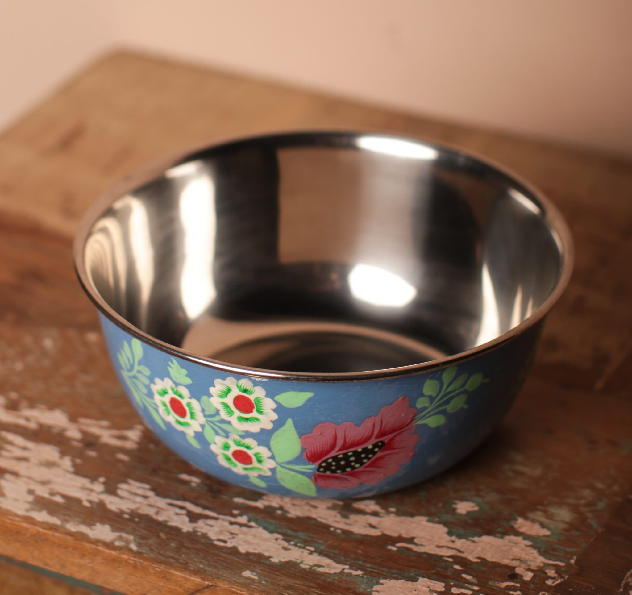 Hand-painted bowl from Kashmir showcasing traditional craftsmanship with vibrant floral patterns that reflect the region’s artistic skills. The bowl features a vivid blue background with a charming hand-painted design of large pink and white flowers. Whether used to serve snacks or as a decorative storage piece, this bowl will add charm to any setting.