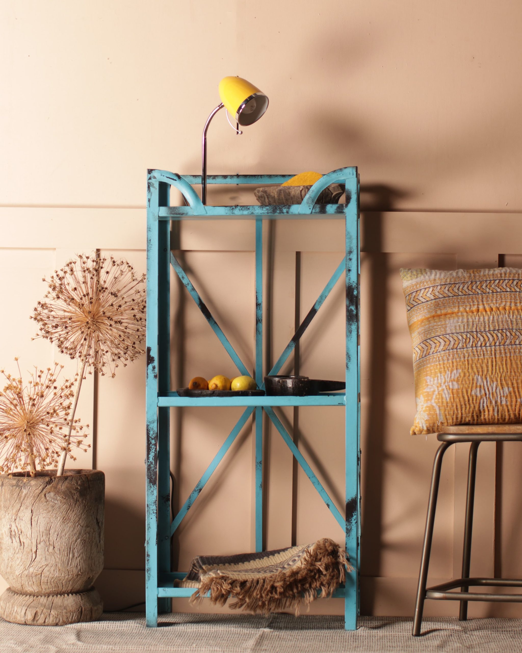 Blending vibrant charm & artisan craftsmanship these Blue Metal Shelves, feature three levels of rustic, durable storage.