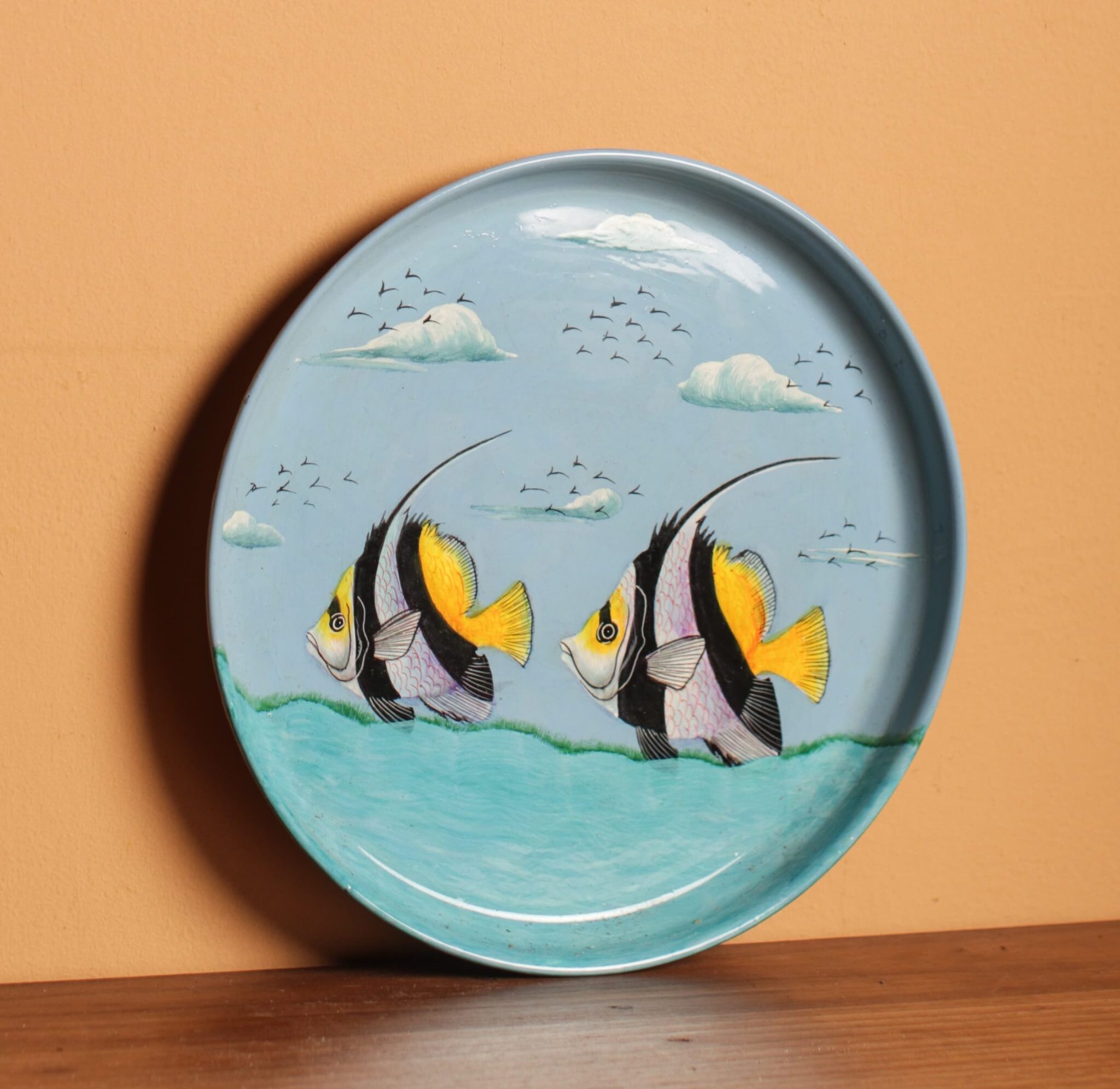 Dive into the beauty of this Blue Oval Tray, a splendid piece of hand-painted enamel work straight from the skilled artisans of Kashmir. This metal tray features a tranquil blue backdrop that sets the stage for two tropical fish gliding through calm waters. Medium in size, this tray is ideal for serving refreshments or as a decorative piece to enhance any room.Ê