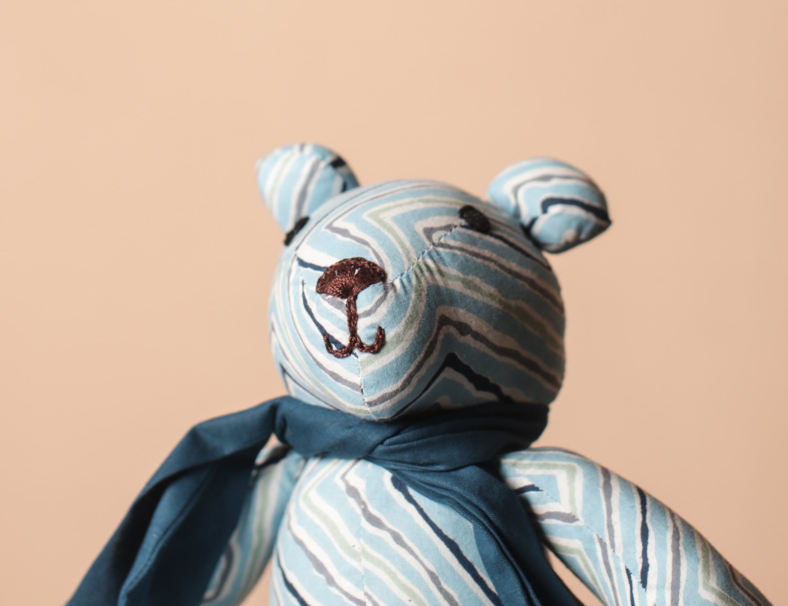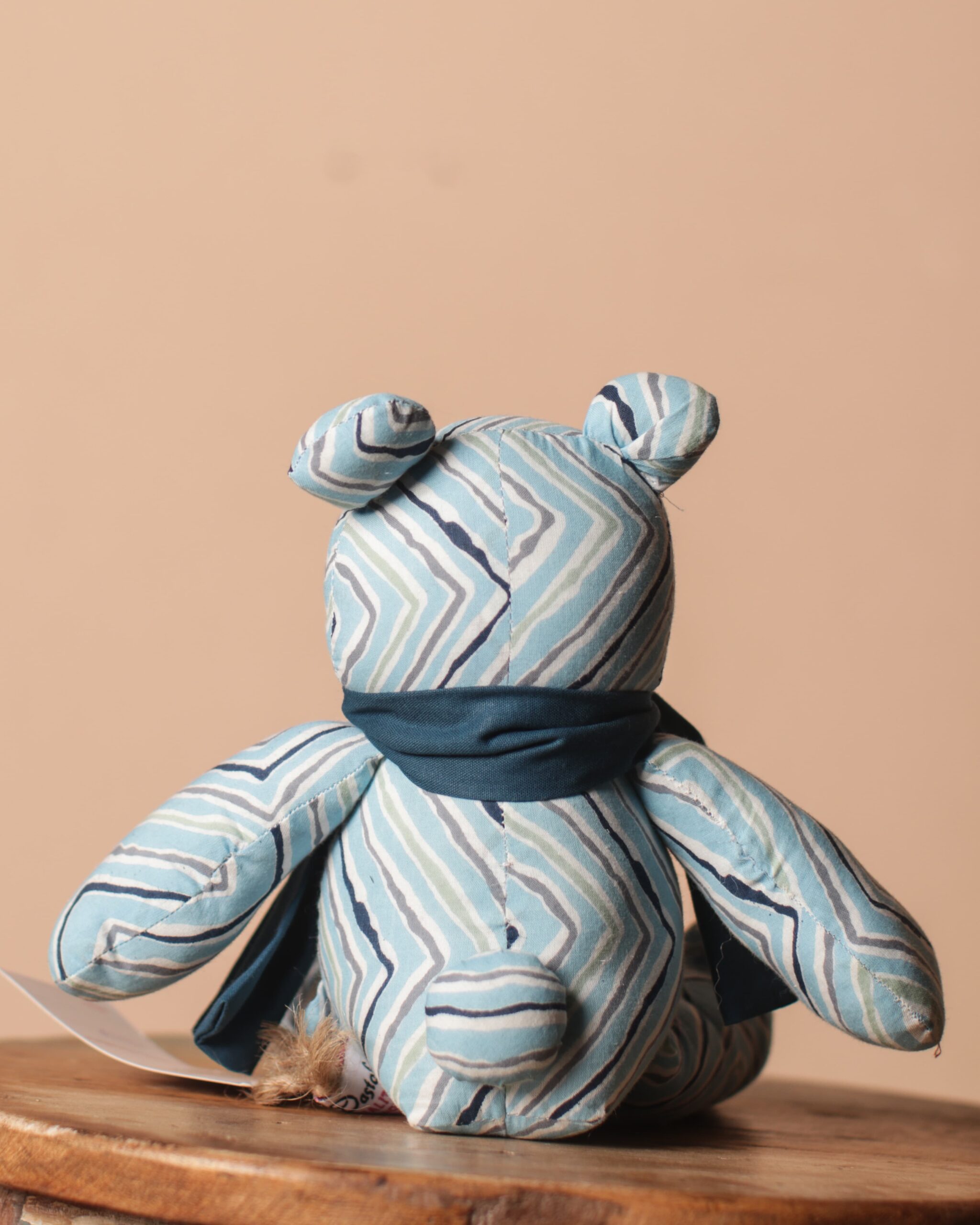Made from bright and cheerful blue fabric, this Toy Teddy is uniquely special. The fabric, hand-chosen from local markets, features an eye-catching stripes pattern in warm orange and white, completed with an adorable navy-coloured scarf.