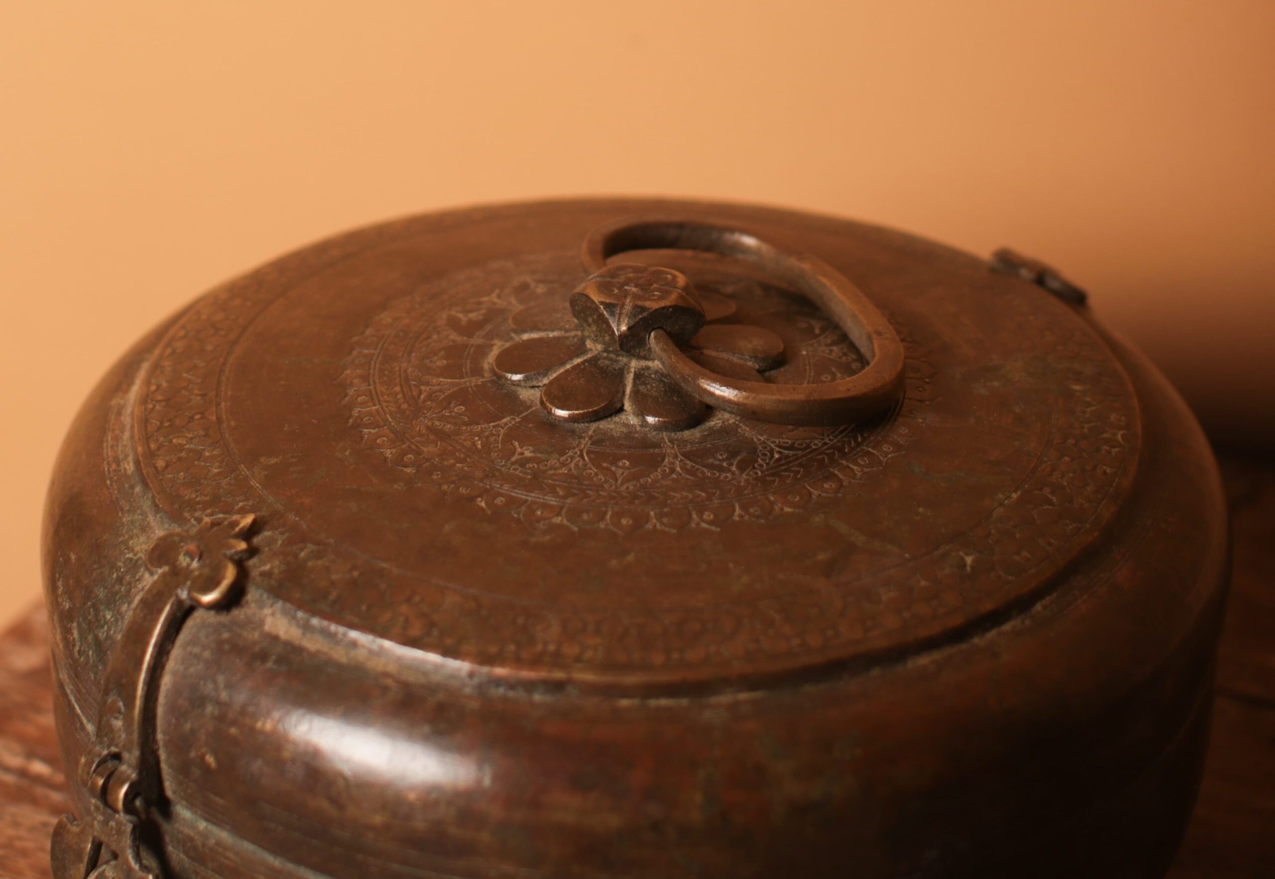 Beautifully crafted brass chapati tin with exquisite carvings, ideal for storage & decoration.