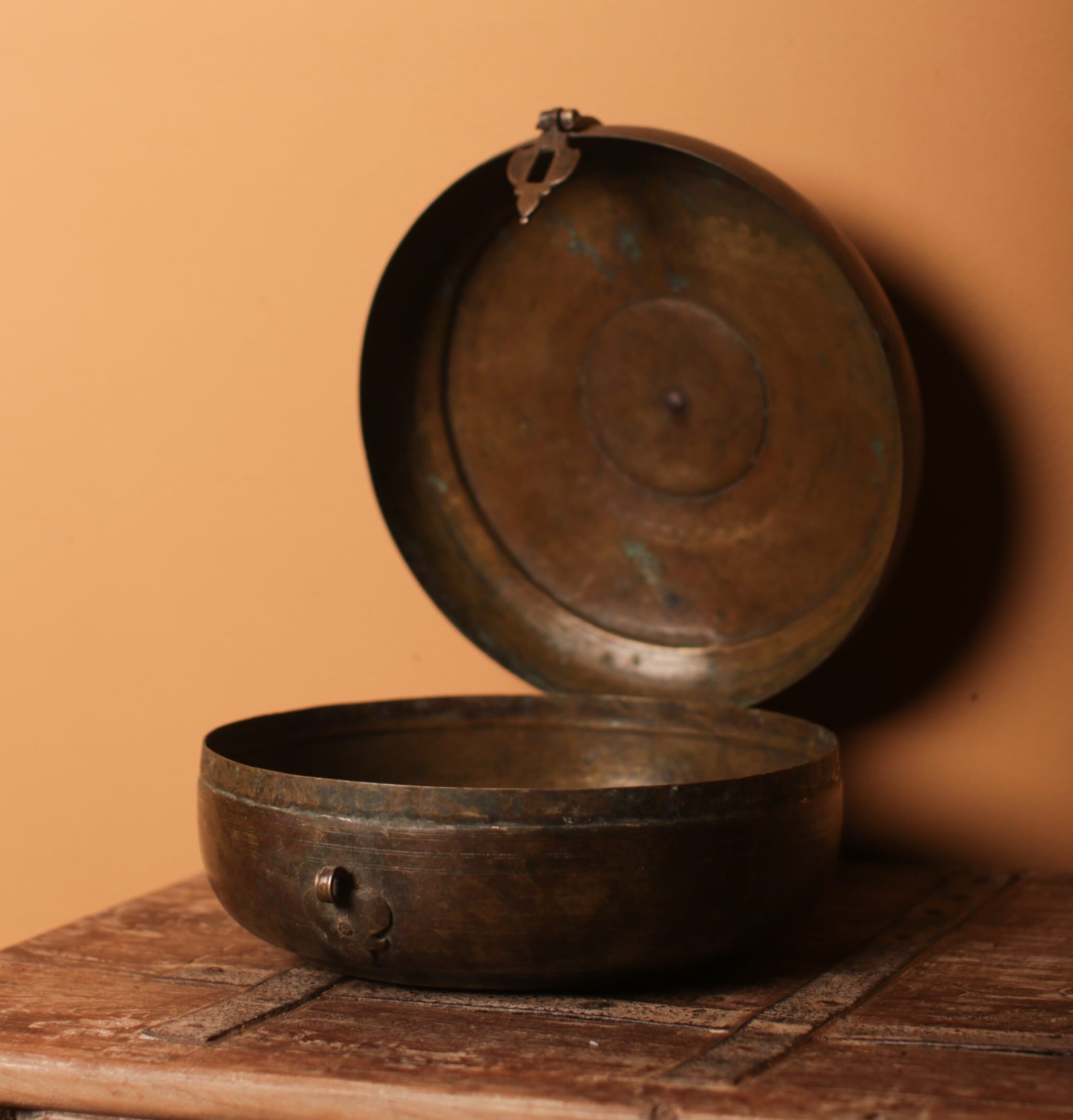 Beautifully crafted brass chapati tin, originally used for storing and serving hot chapatis, featuring exquisite carvings. Its robust and elegant design makes it versatile for functional storage and as a decorative piece.