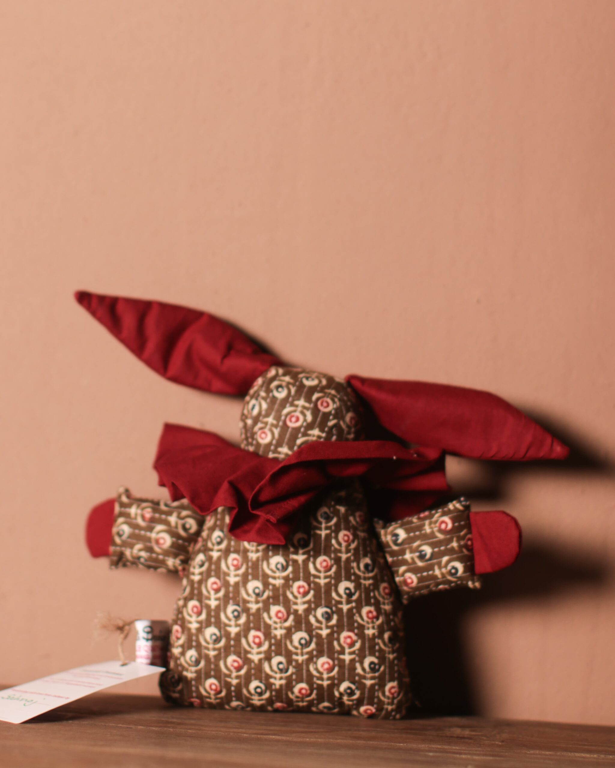 Introducing these charming Toy Bunnies, a heart-warming creation from the talented women of the Sambhali Trust. Crafted with love and care, this Bunny is handmade from soothing brown fabric thoughtfully selected from local markets to bring a splash of colour and cheer. The toy features playful red accents on its ears and limbs and a striking red ruffle around its neck.