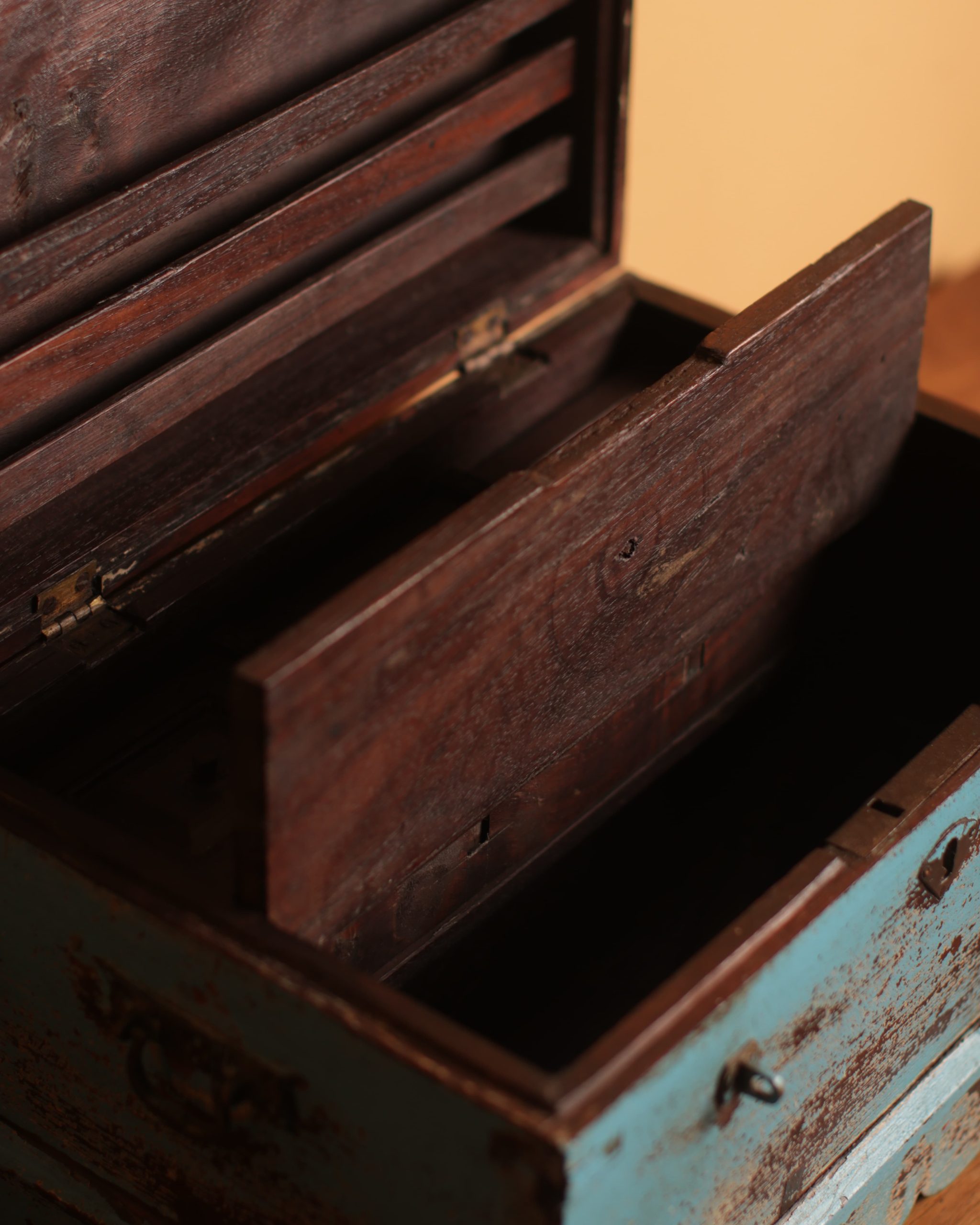 Organise your space with this vintage Cash Box, originally used in Indian shops; it features a light blue finish & practical compartments.
