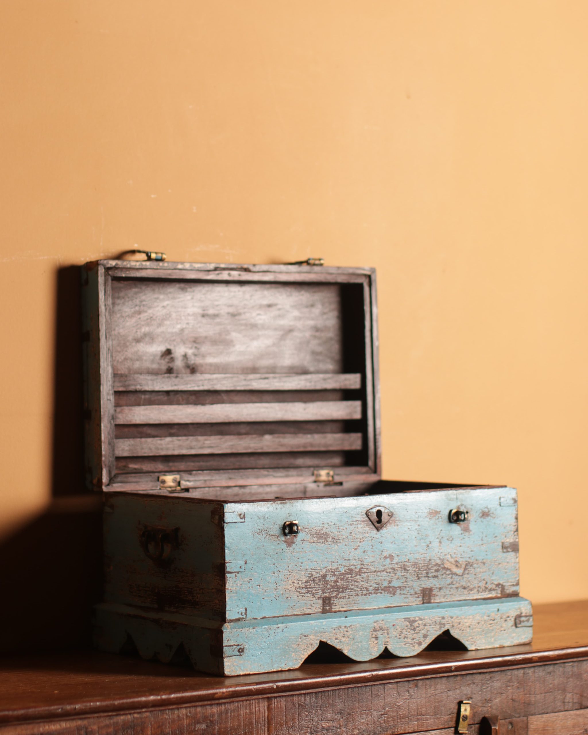 Rich with history and purpose, this Cash Box was originally used in Indian shops to safeguard money and important papers behind the desk. This beautifully handcrafted box is more than just a functional item; it’s a piece of history.
