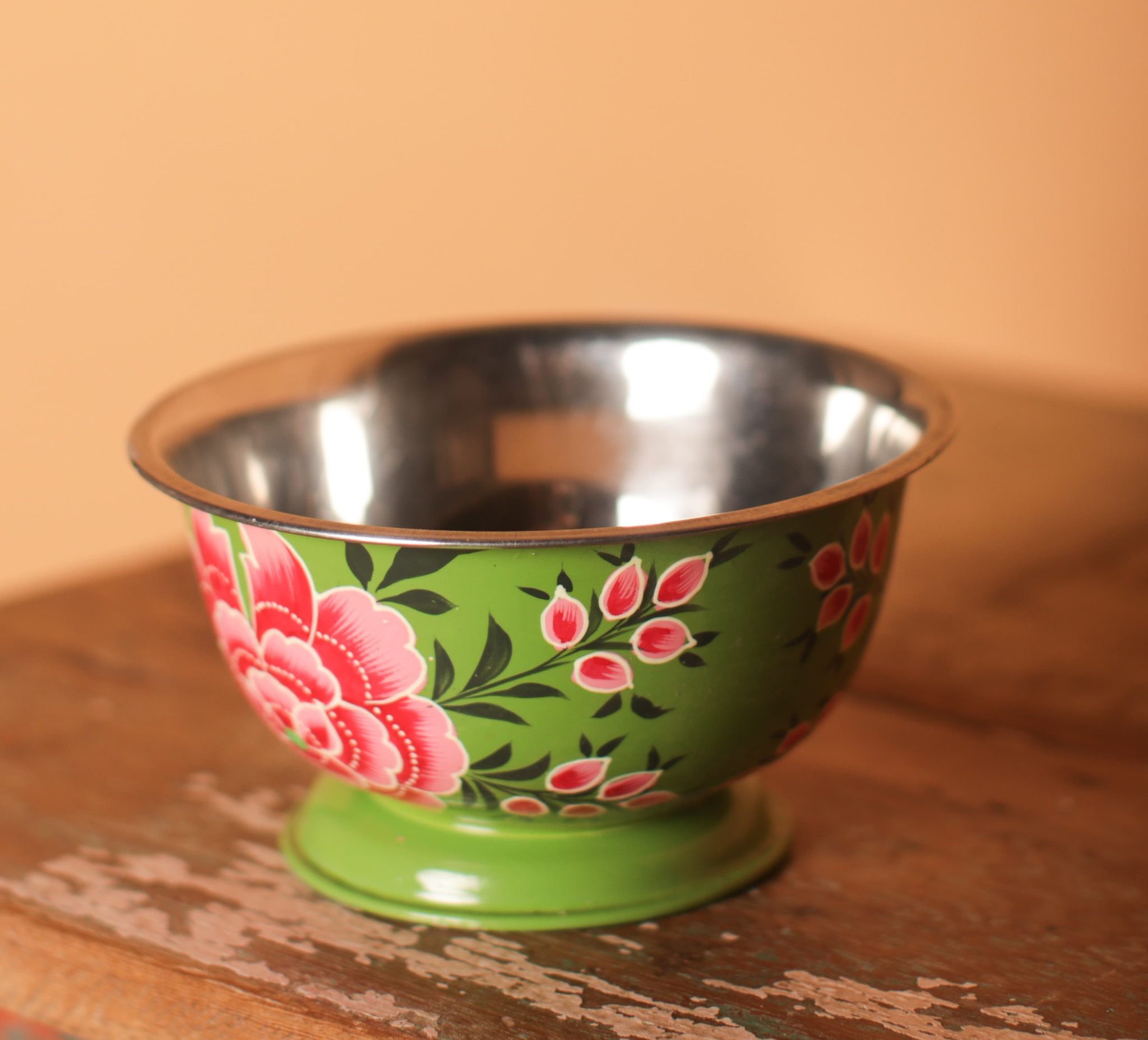 Hand-painted bowl from Kashmir showcasing traditional craftsmanship with vibrant floral patterns that reflect the region’s artistic skills. The bowl is adorned with bright  painted large pink blossoms surrounded by leafy vines. Whether used to serve snacks or as a decorative storage piece, this bowl will add charm to any setting.