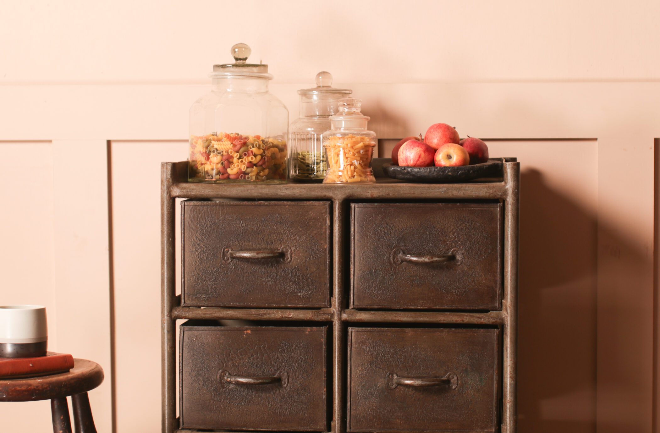 This cabinet offers six sliding drawers that provide ample storage space, making it an ideal solution for organising tools, kitchen supplies, tools or stationary. Each drawer is equipped with a sleek handle that complements the cabinet’s overall industrial aesthetic. The flat top of the cabinet serves as an additional display area for decorative items, plants, or kitchen containers.