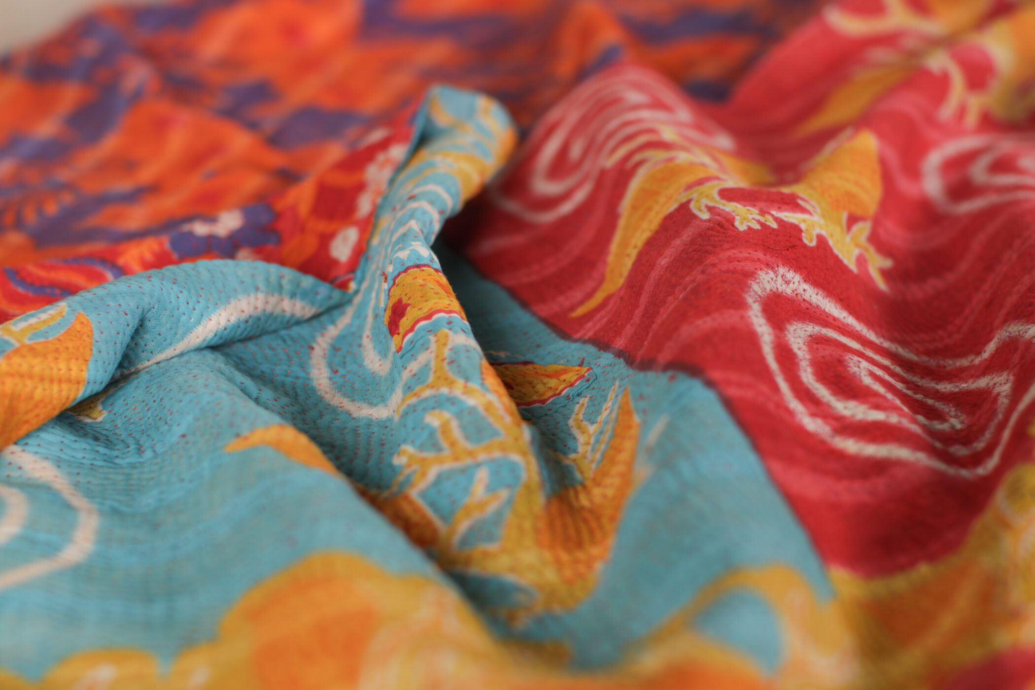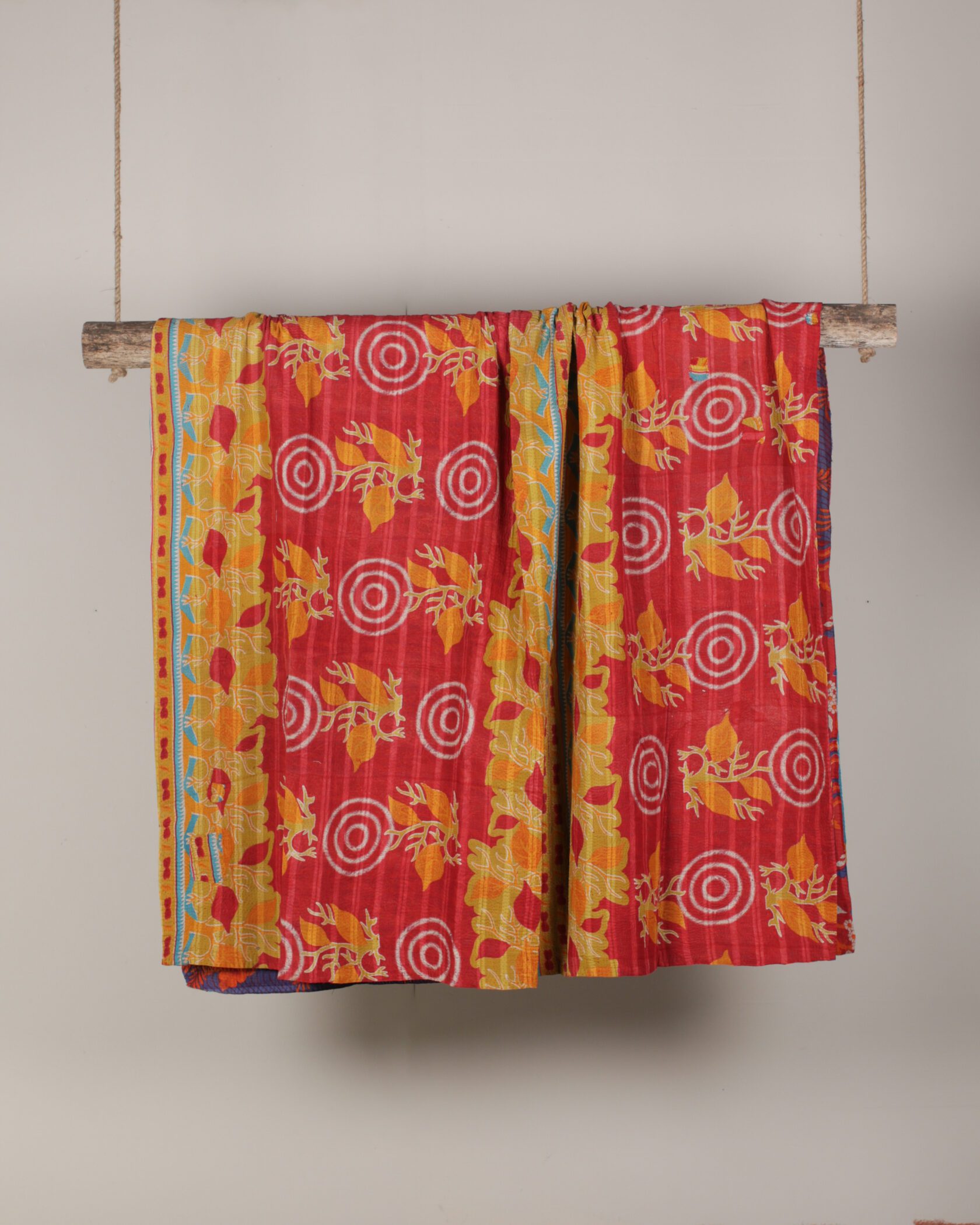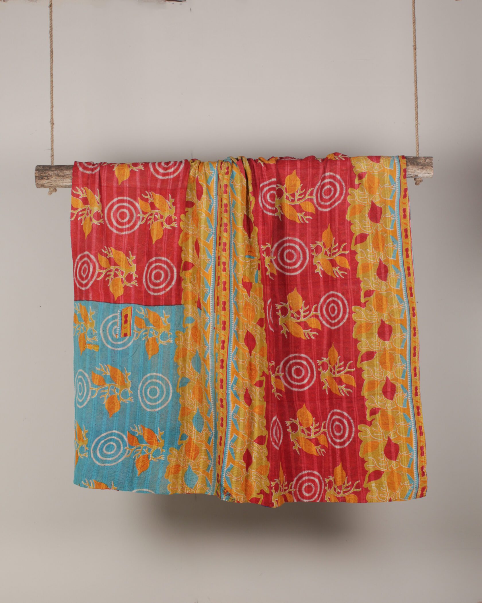 Reversible Kantha throw with bold yellow, red & orange patterns on both sides.