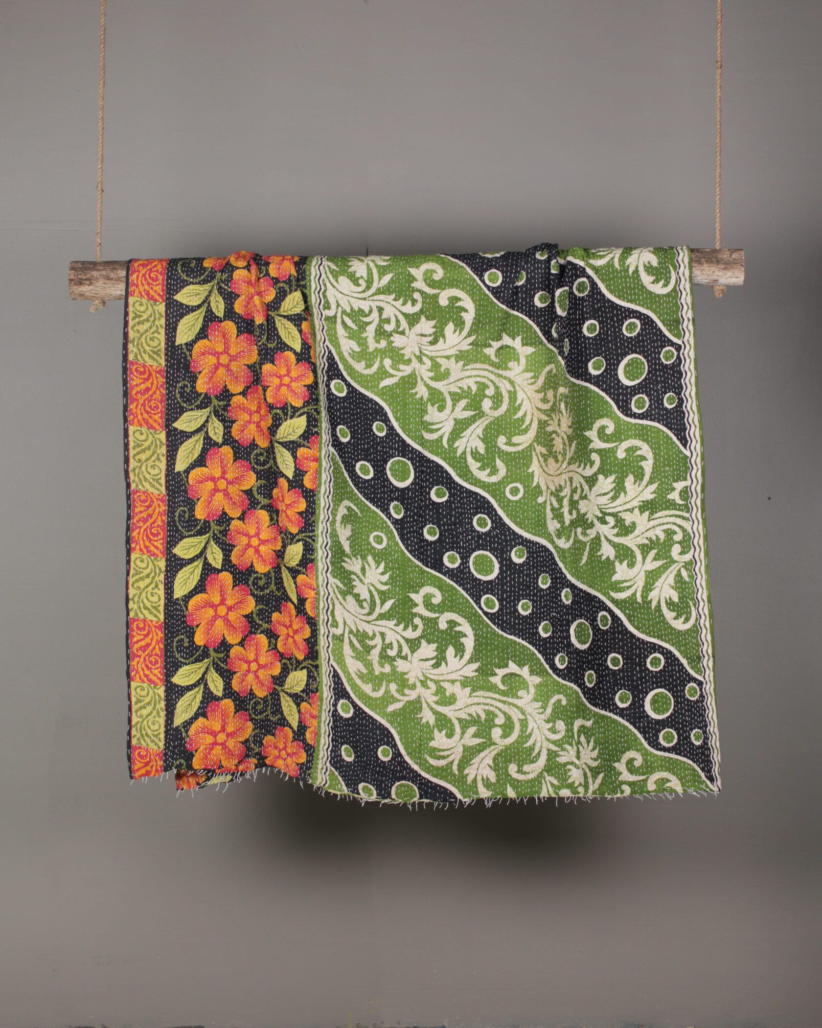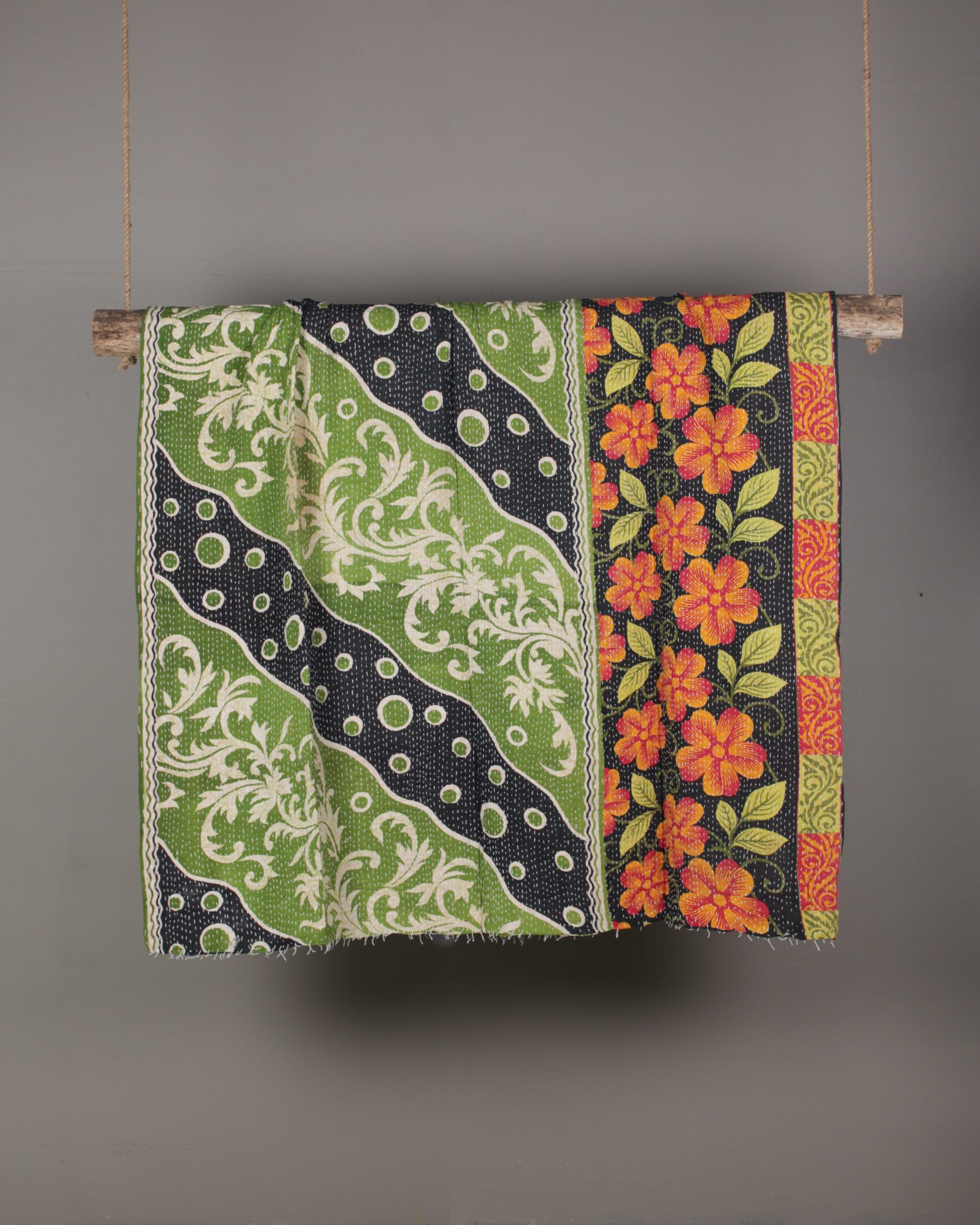 Kantha throw with vibrant green & black floral patterns, crafted from reclaimed fabric.