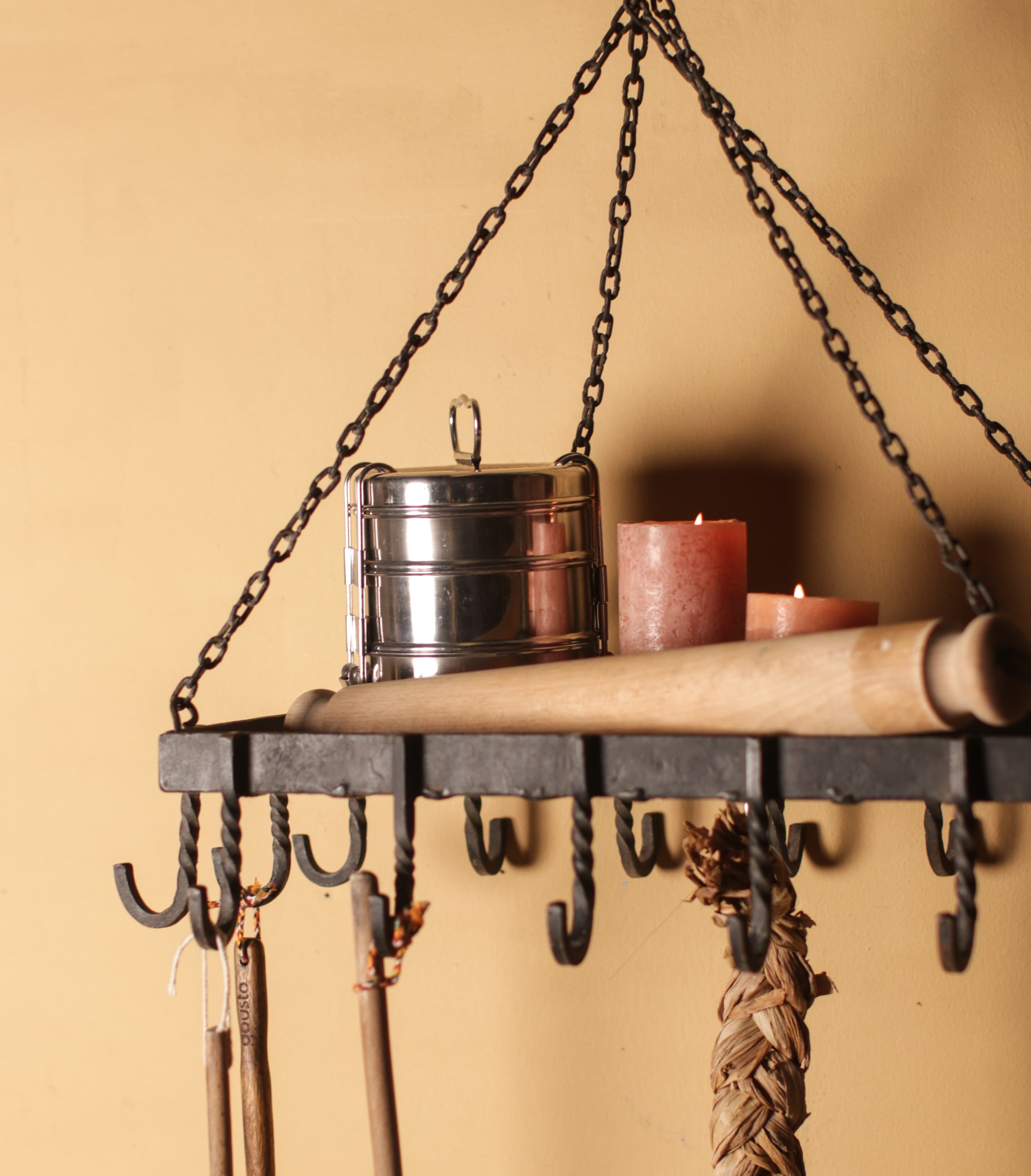 Sturdy hand-forged metal utensil hanger with multiple hooks, ideal for organising the kitchen.