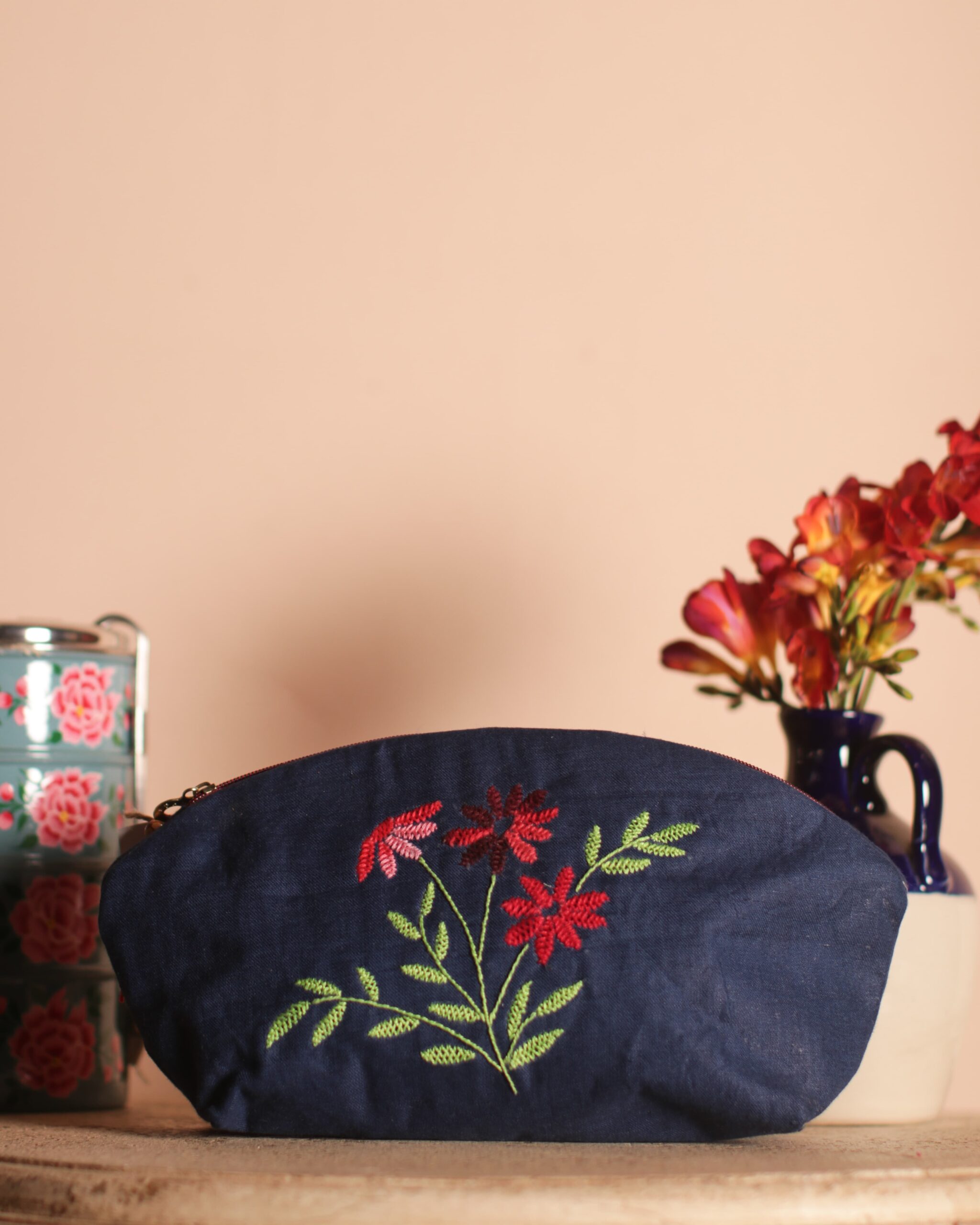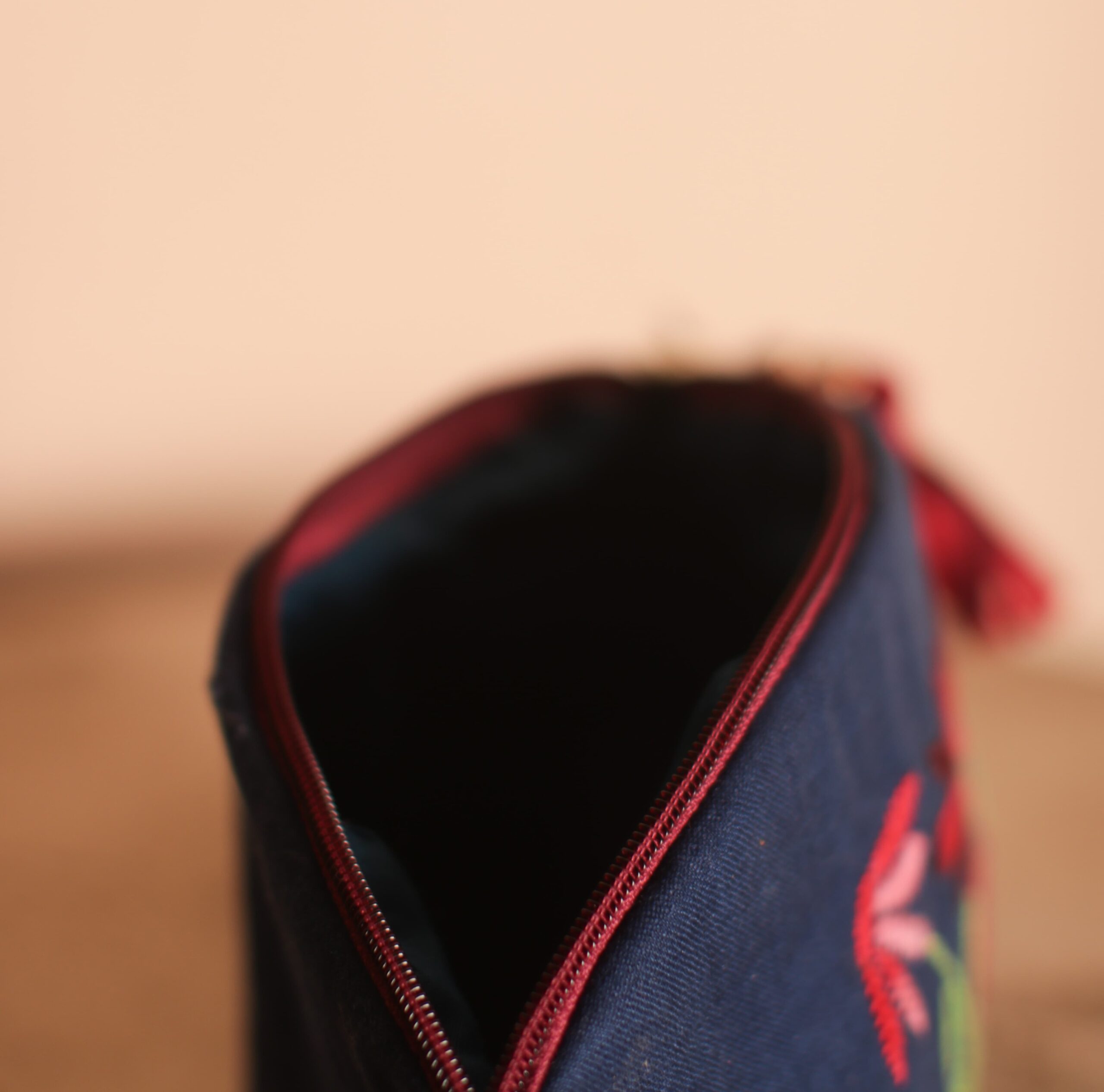 Discover the delicate charm of this Hand-Embroidered Pouch, lovingly crafted by the skilled women of the Sambhali Trust. Each stitch is handcrafted, ensuring that no two pouches are exactly alike, adding to its unique appeal. This versatile pouch is perfect for storing a variety of personal items such as makeup, jewellery, or even everyday essentials.