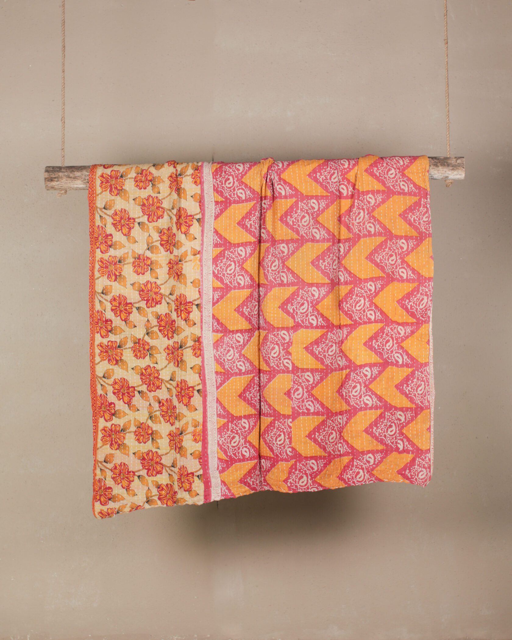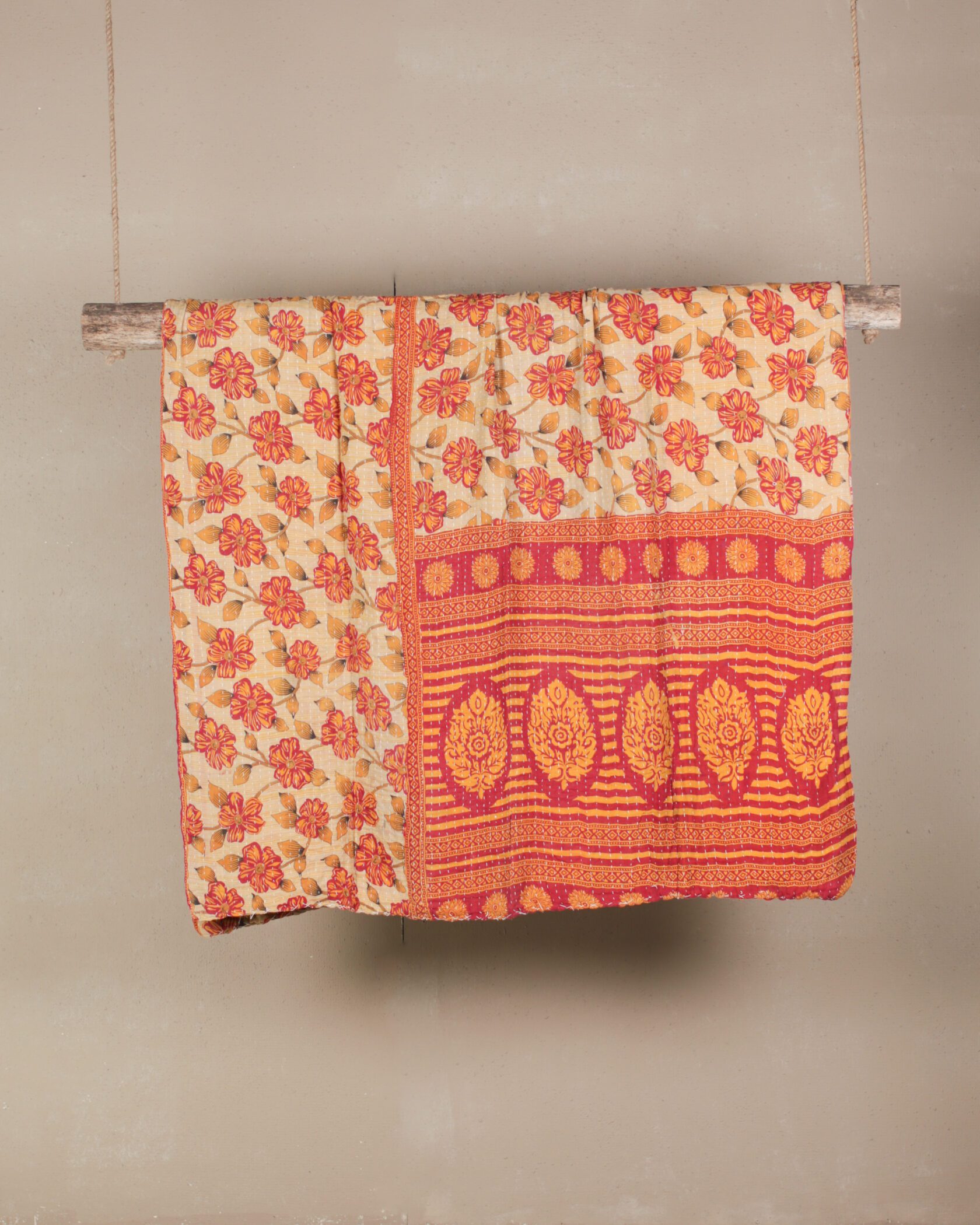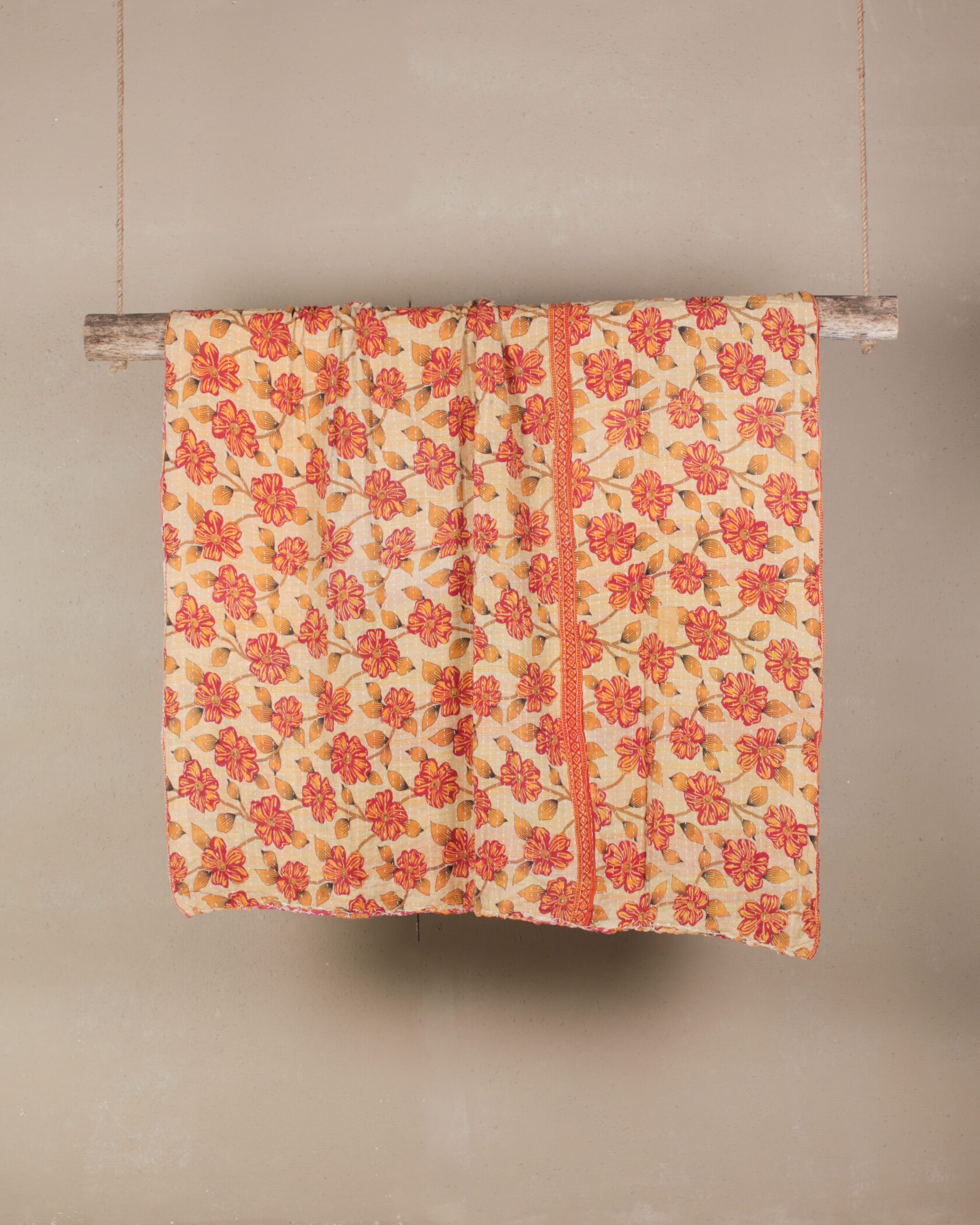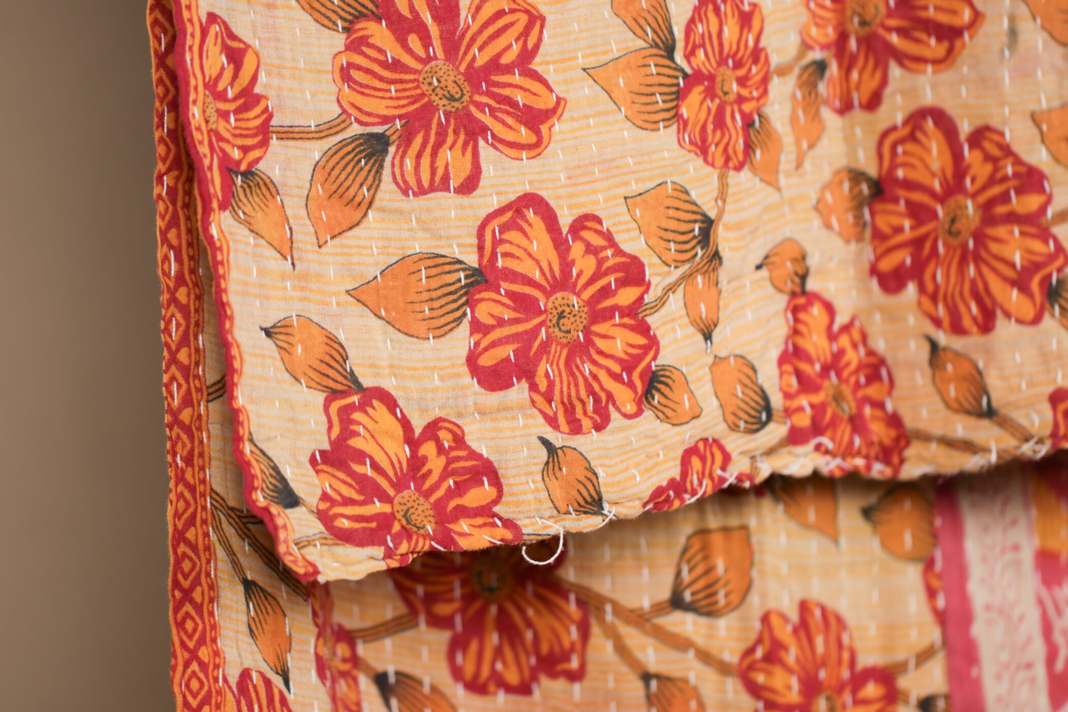 Double-sided Kantha throw with vibrant floral patterns in shades of orange and red on a cream background.