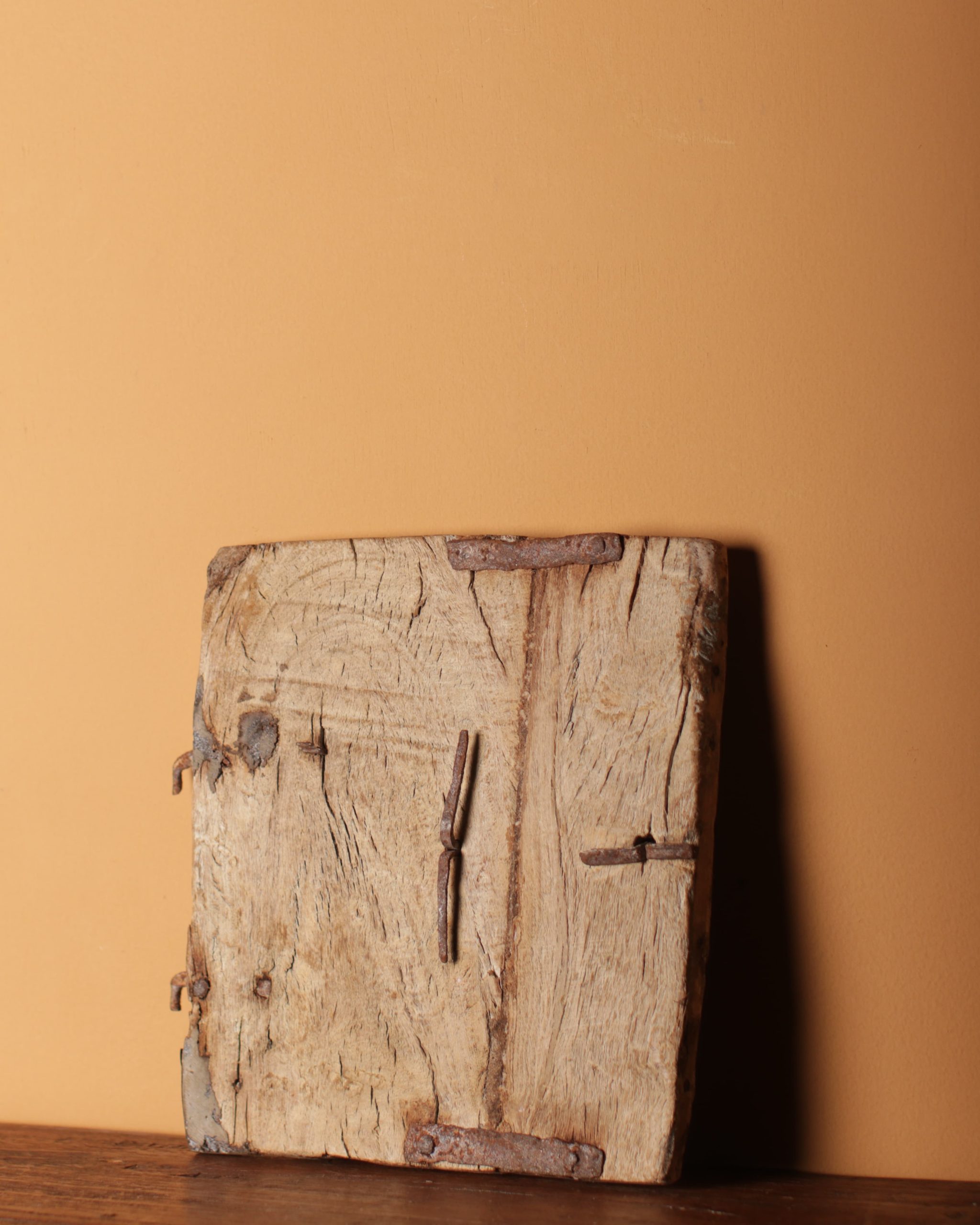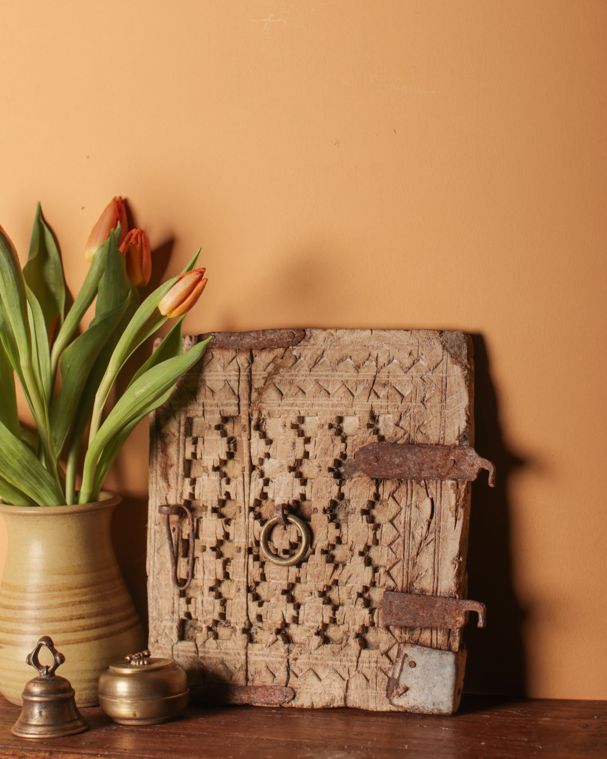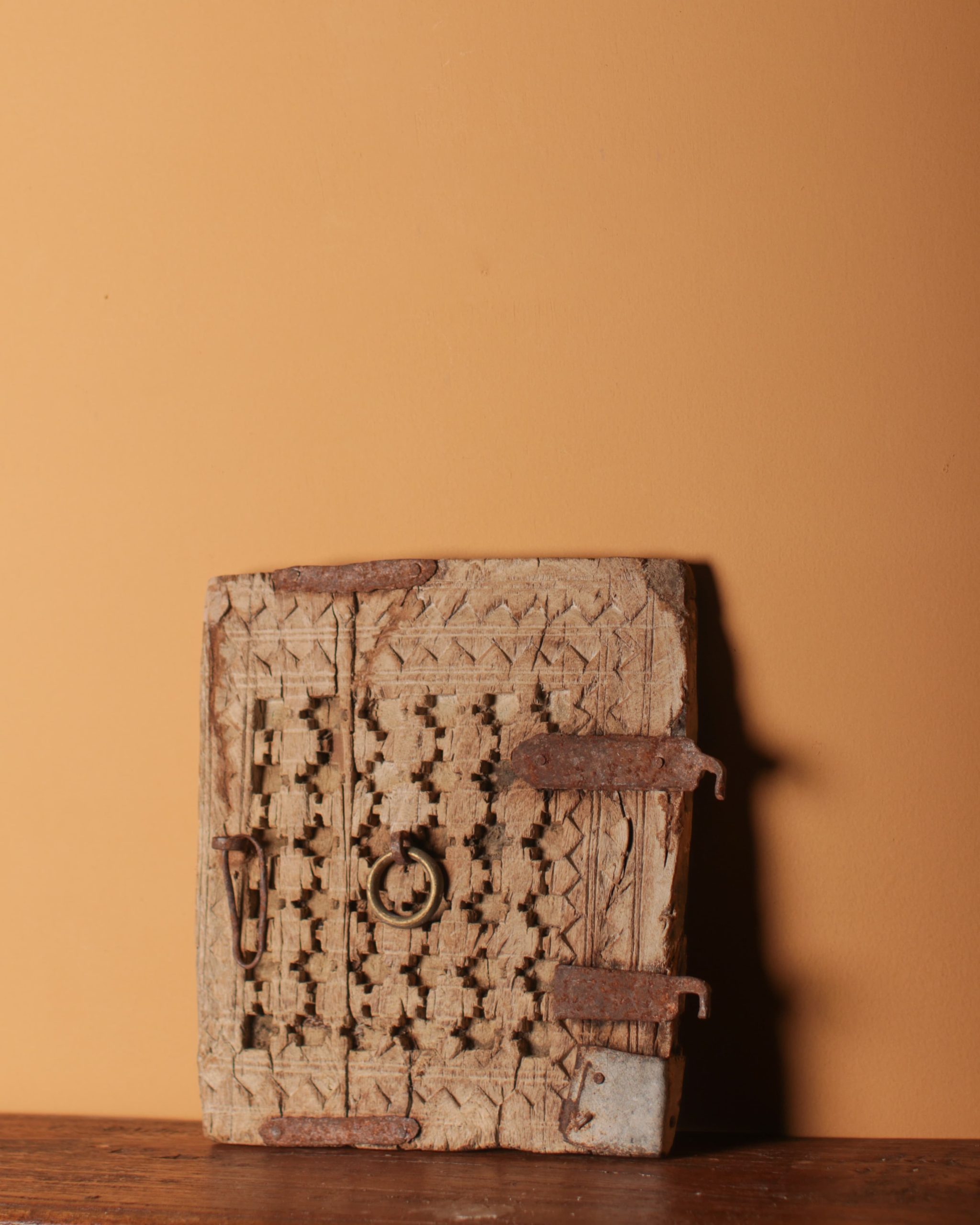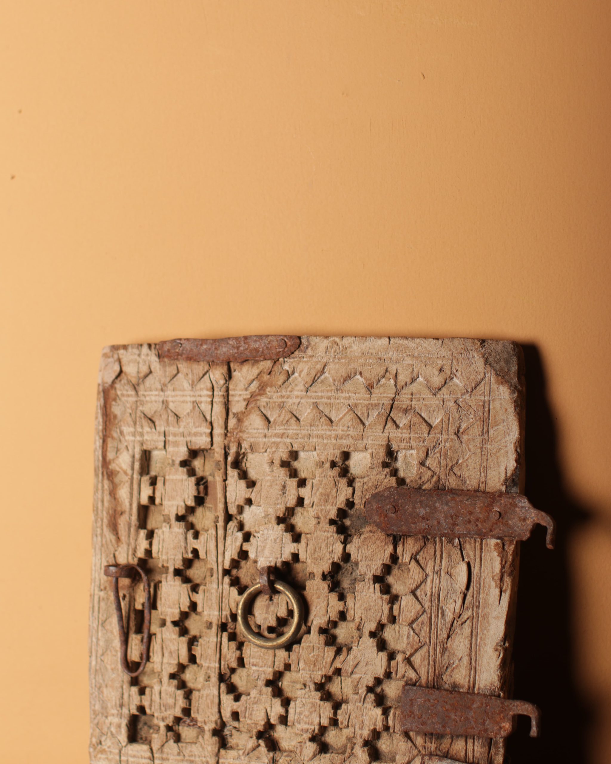 Repurposed from an old cupboard, this intricately carved Kuch door features original metal hardware & a natural light wood finish.
