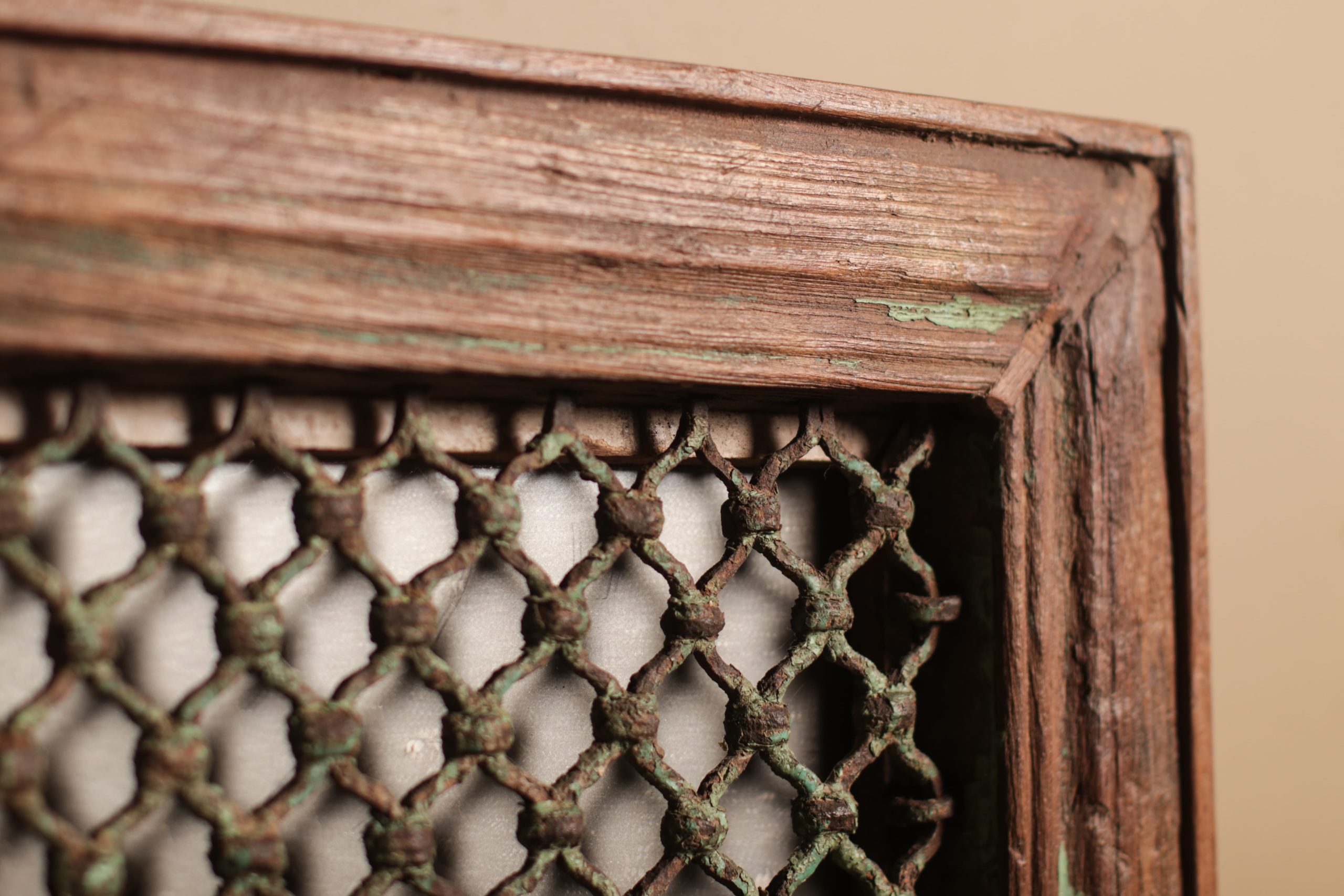 Crafted with a sturdy teak frame, the mirror showcases light brushes of bright green paint, distressed by its age. The frame is adorned with a meticulously worked metal jali featuring an intricate lattice design. This traditional pattern allows light to play around its geometric shapes, casting dynamic shadows and bouncing light around a room.