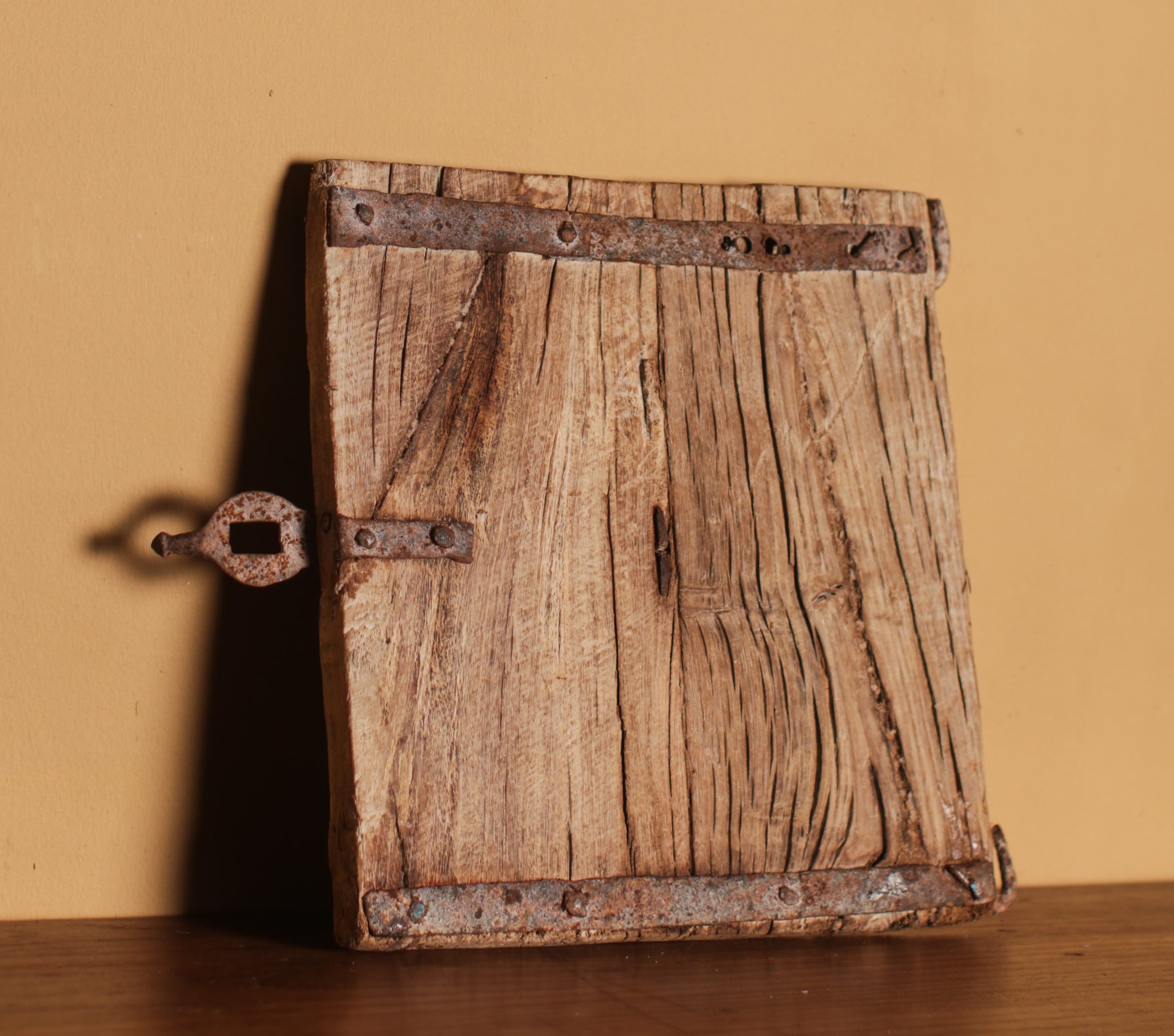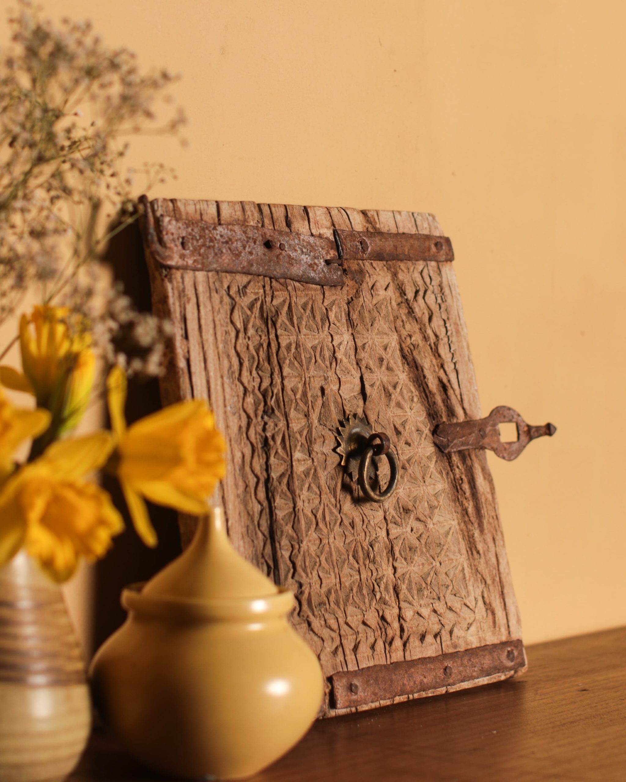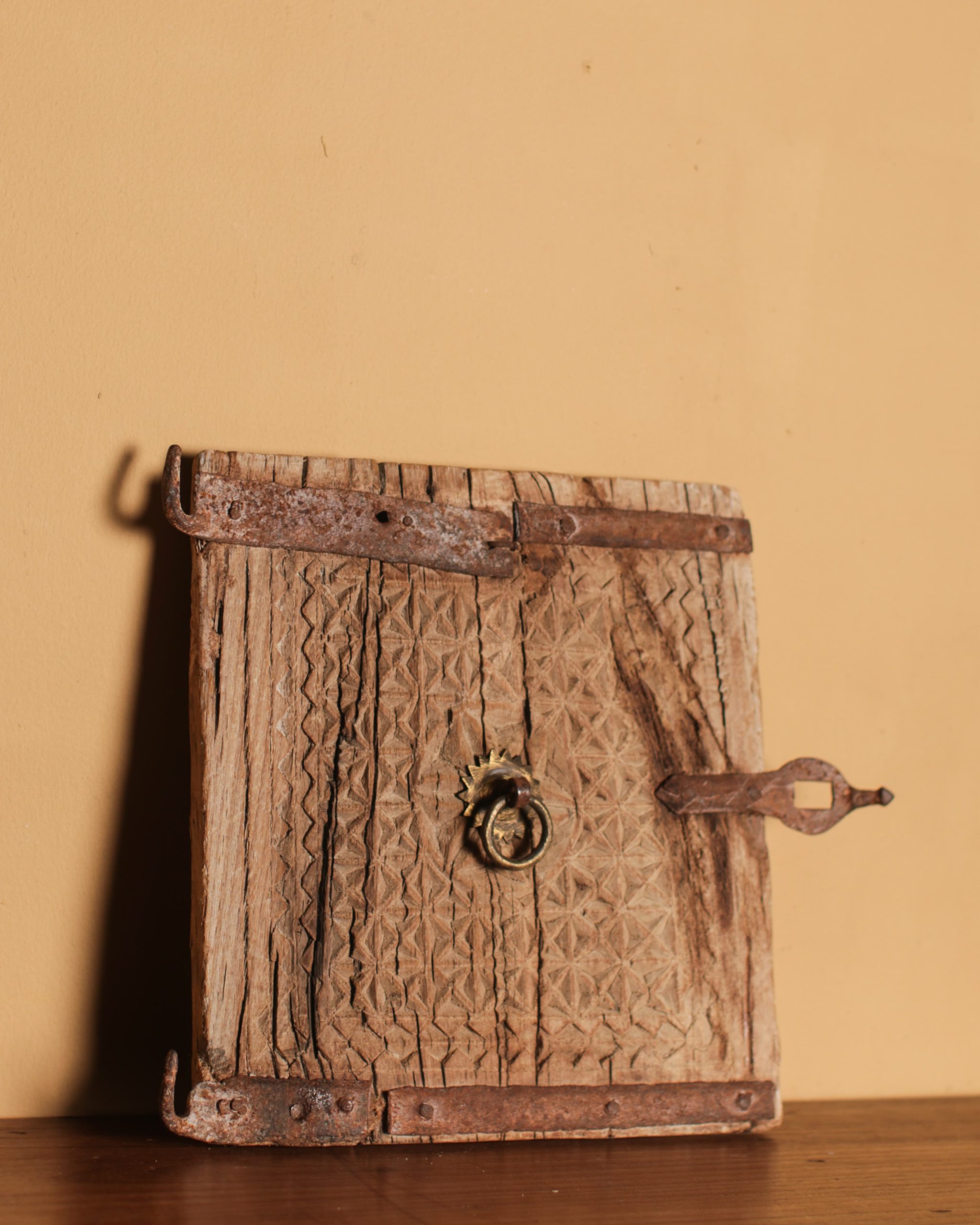Intricately carved Kuch door, repurposed from an old cupboard, features original metal hardware & a natural light wood finish.