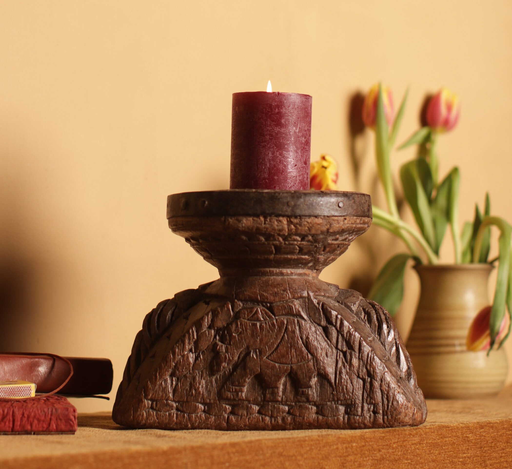 Celebrate Indian craftsmanship with this Original Maharashtra Wood Candle Holder, repurposed from traditional agriculture to become a practical & attractive piece.