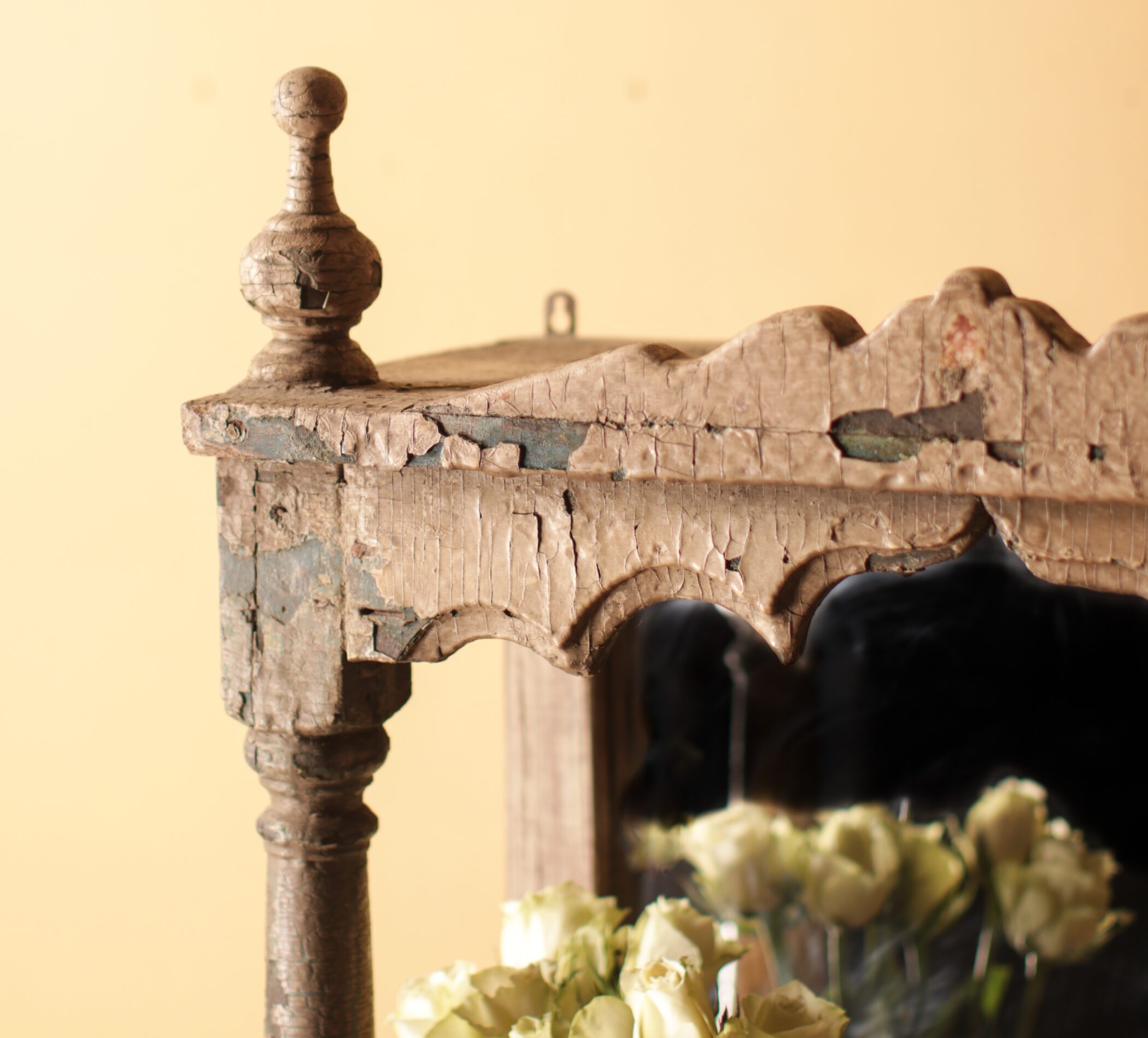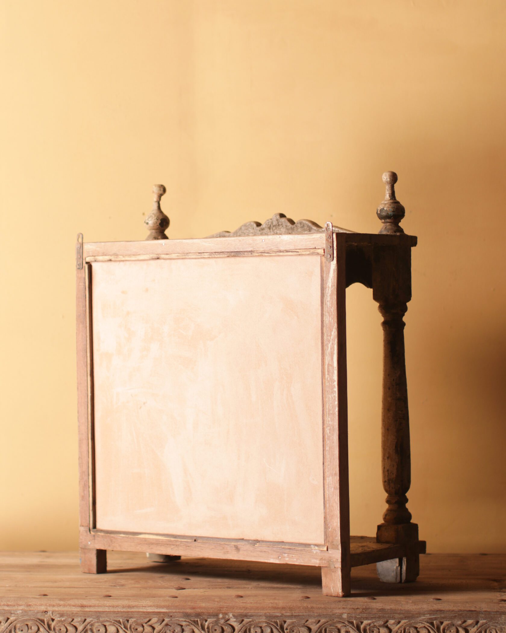 Embrace the timeless beauty of this Original Rajasthan Mirror Shelf, a repurposed antique that brings the grandeur of Rajasthani heritage into your home. Once used as a small temple shrine, this graceful piece has had a new large mirror placed on the back. The wooden frame has a distressed finish, highlighting the intricate carvings and an aged patina that tells tales of its past.