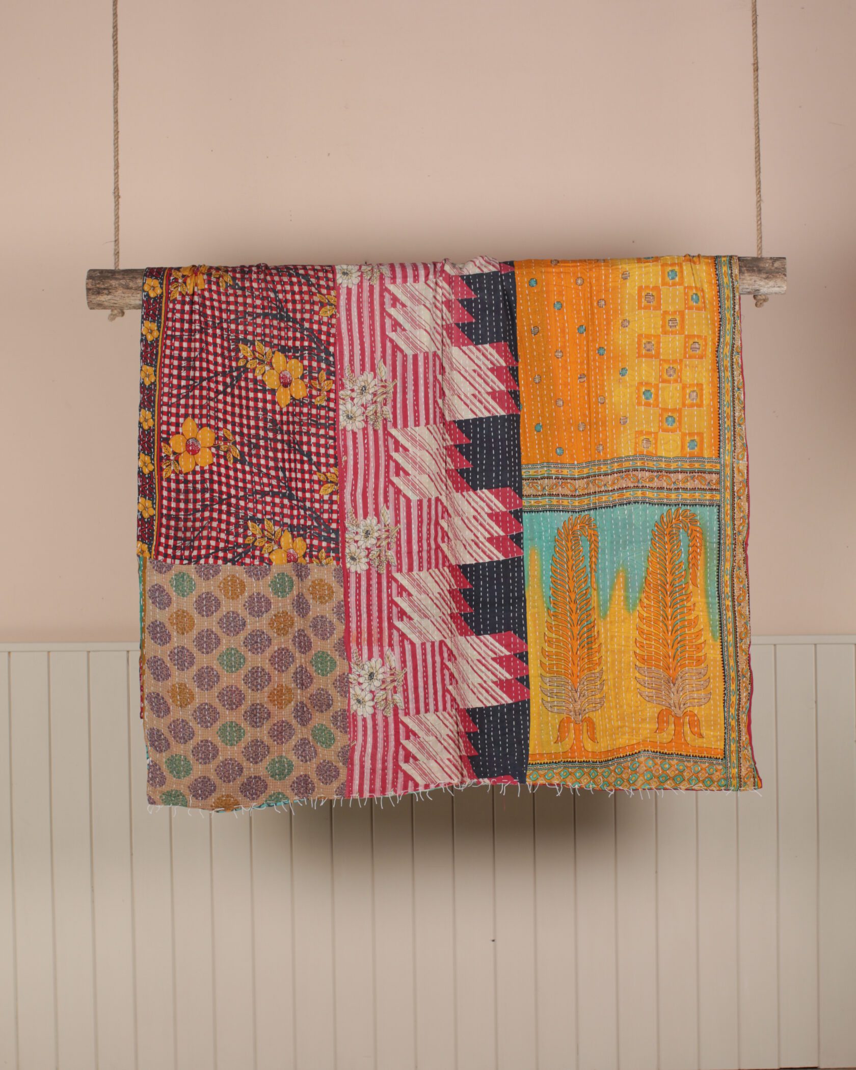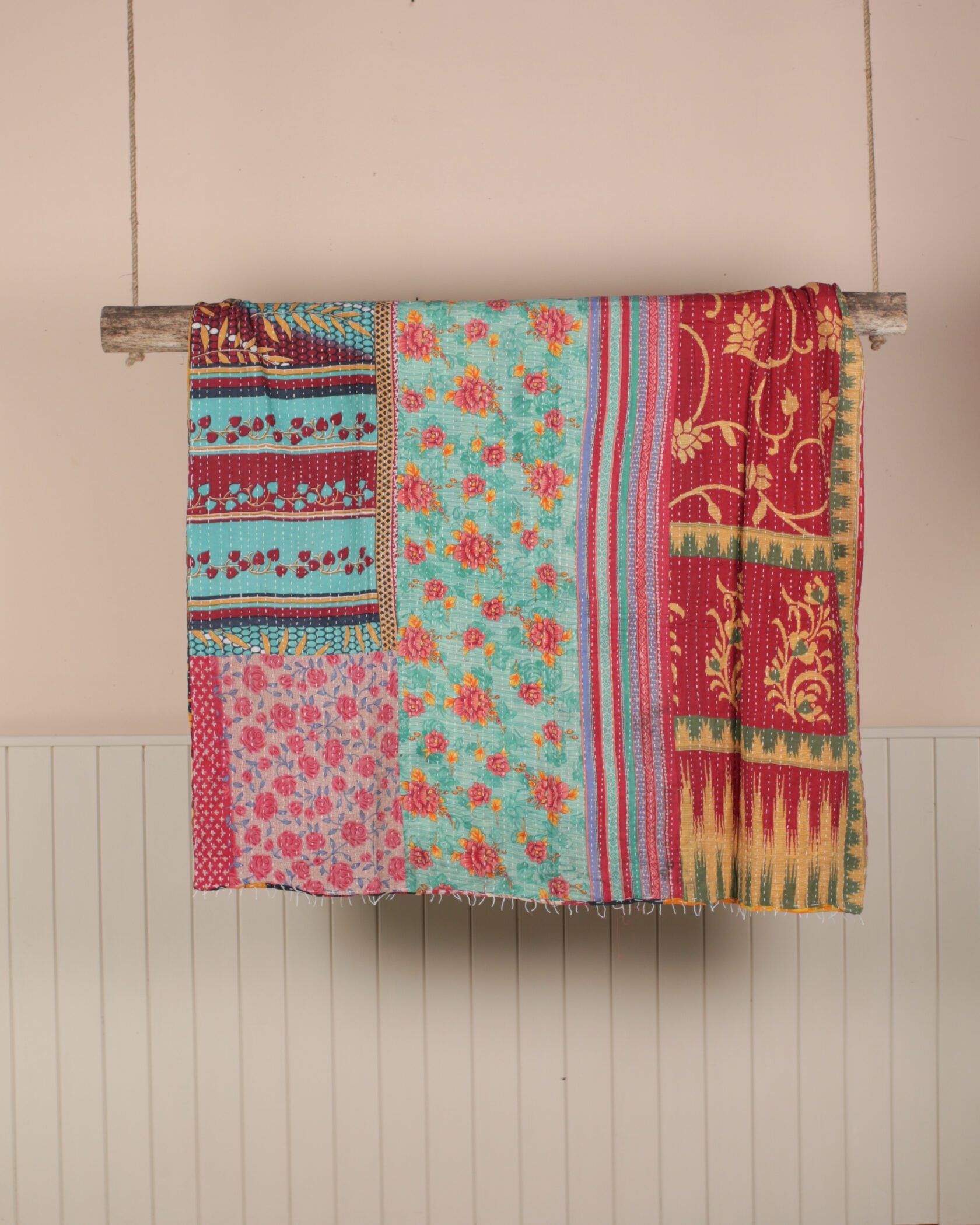 Reversible Patchwork Kantha throw with vibrant floral & geometric patterns.