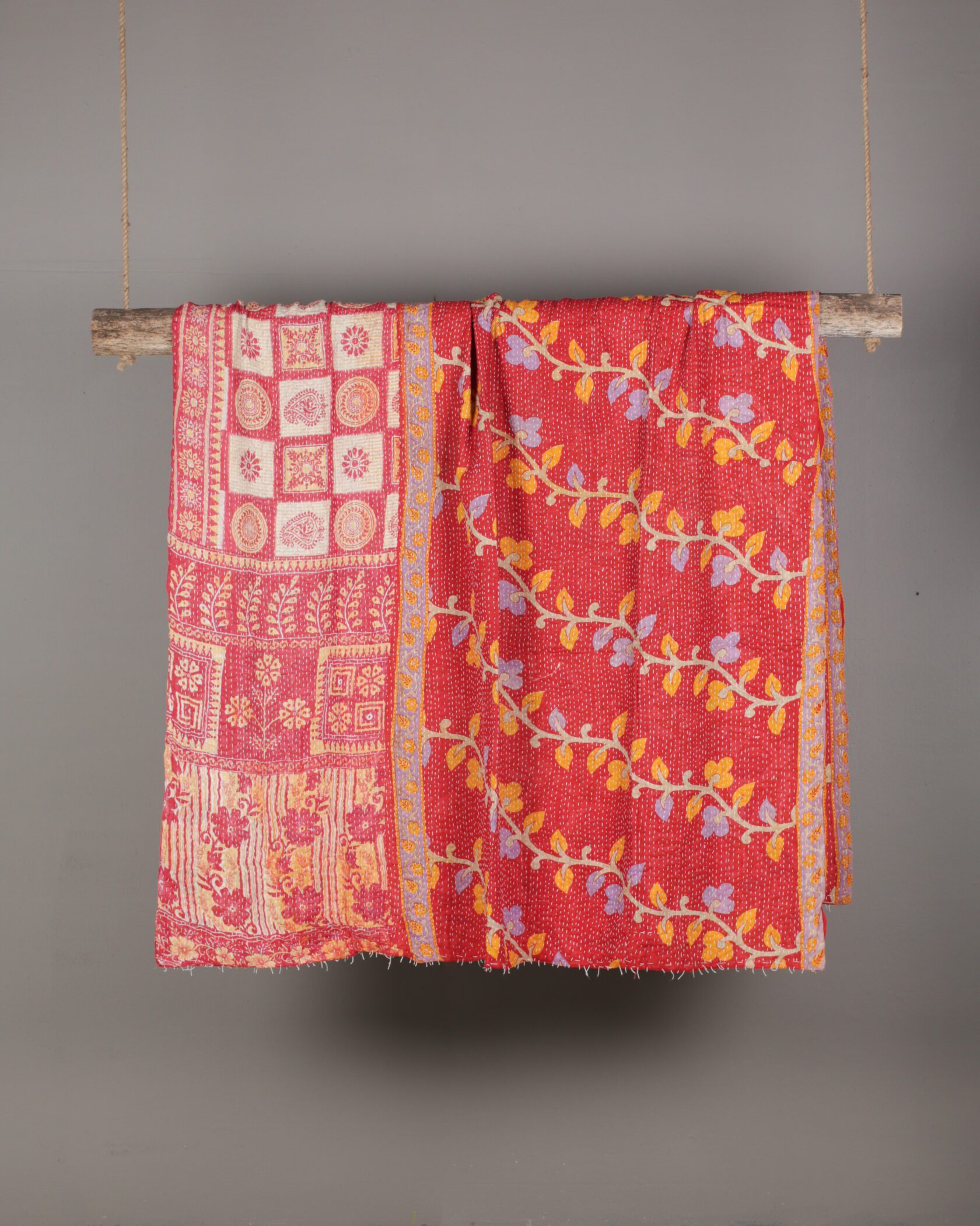 Double-sided Kantha throw with vibrant red & pink backgrounds, featuring intricate patterns.