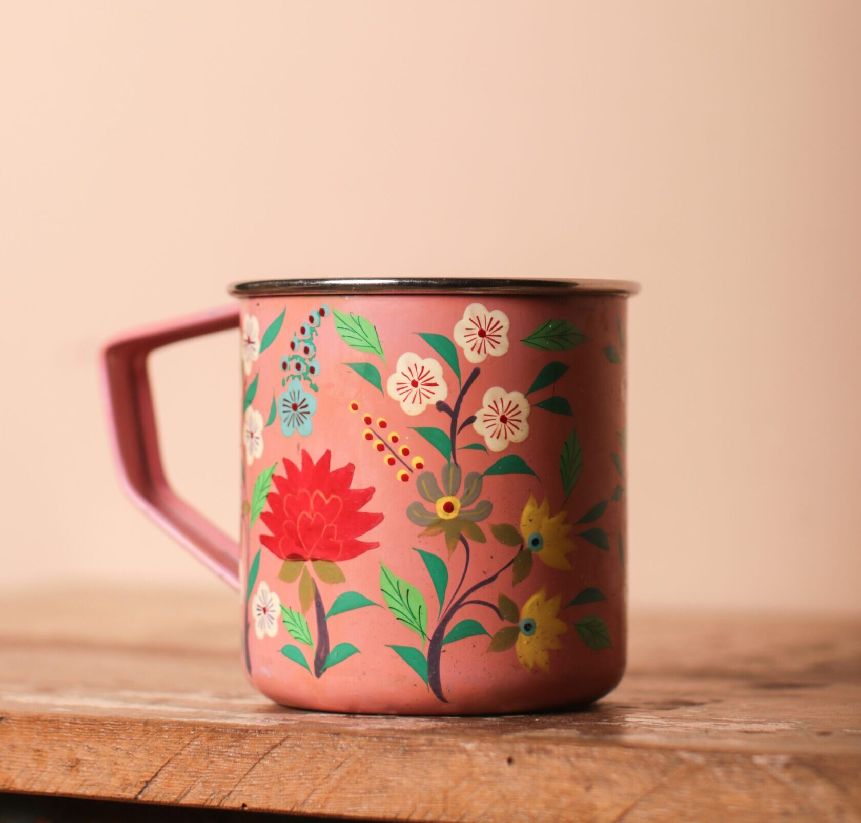 Discover the beauty and function of this Pink Flower Hand Painted Mug. Crafted from durable metal and adorned with traditional Kashmiri enamel artwork. Adorned with a vibrant array of flowers in reds, yellows, and greens, the design pops beautifully against the mugs soft pink background. Perfect for sipping your favorite hot beverage, this mug brings a piece of Kashmiri craftsmanship to your kitchen. The handle is designed for comfortable holding, and the mugs size is ideal for a hearty cup of coffee or tea.