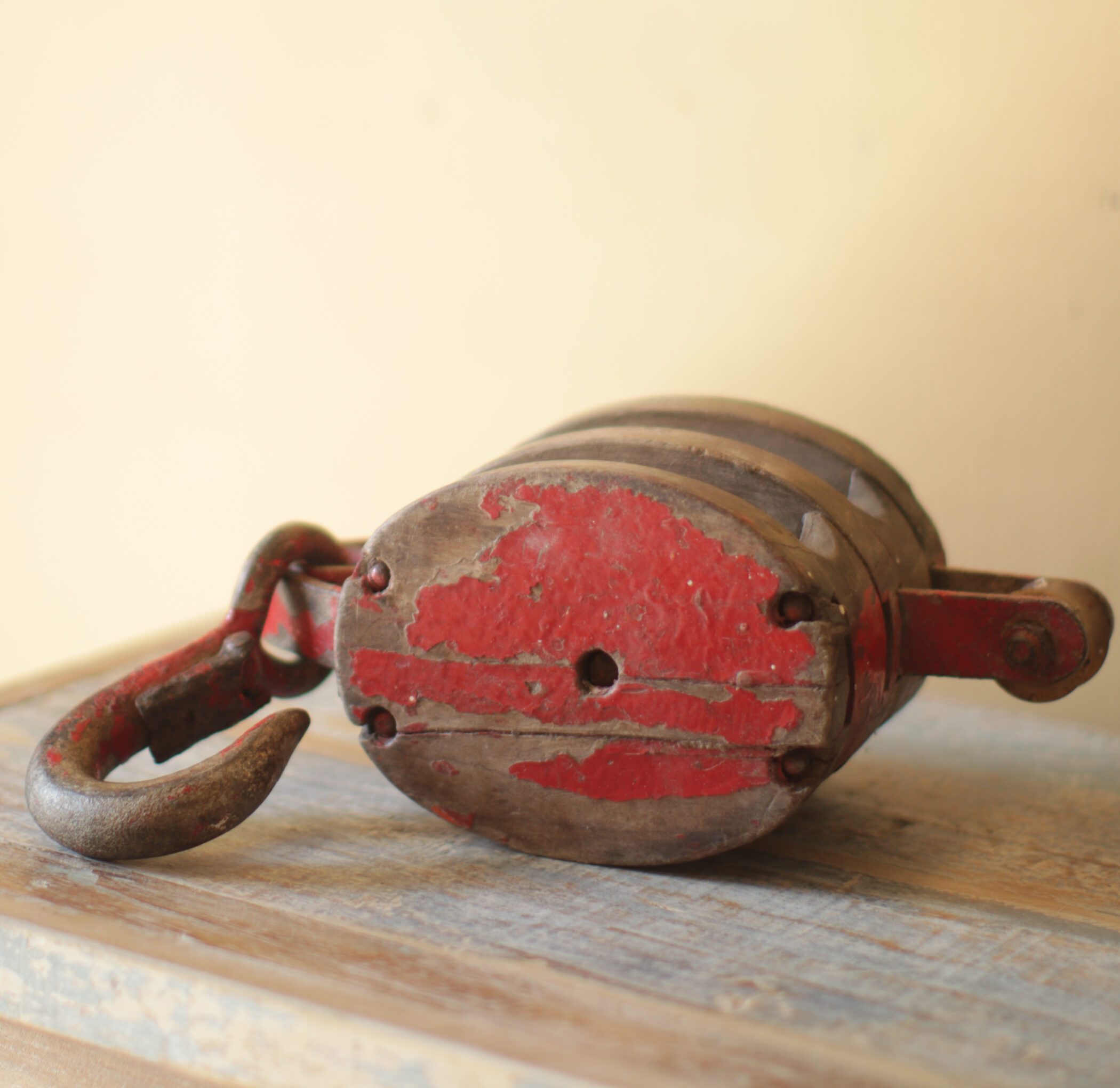 Wooden pulley with a well-worn patina & sturdy metal design, perfect for workshops or as a rustic decorative piece.