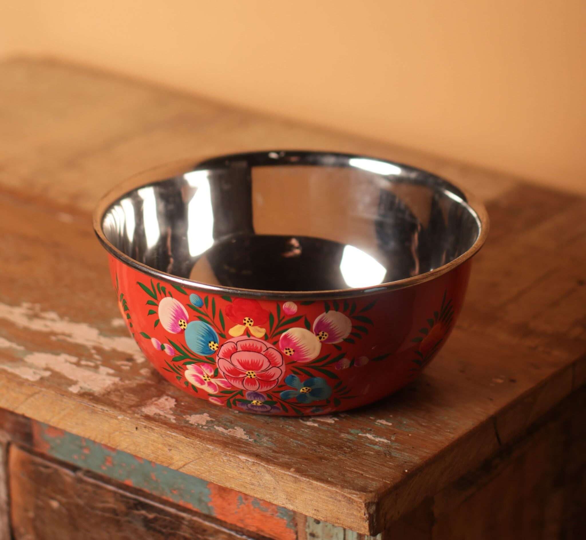 Beautiful, hand-painted Kashmiri bowl with a bright red background with colourful flowers, perfect for serving snacks or decorative storage.