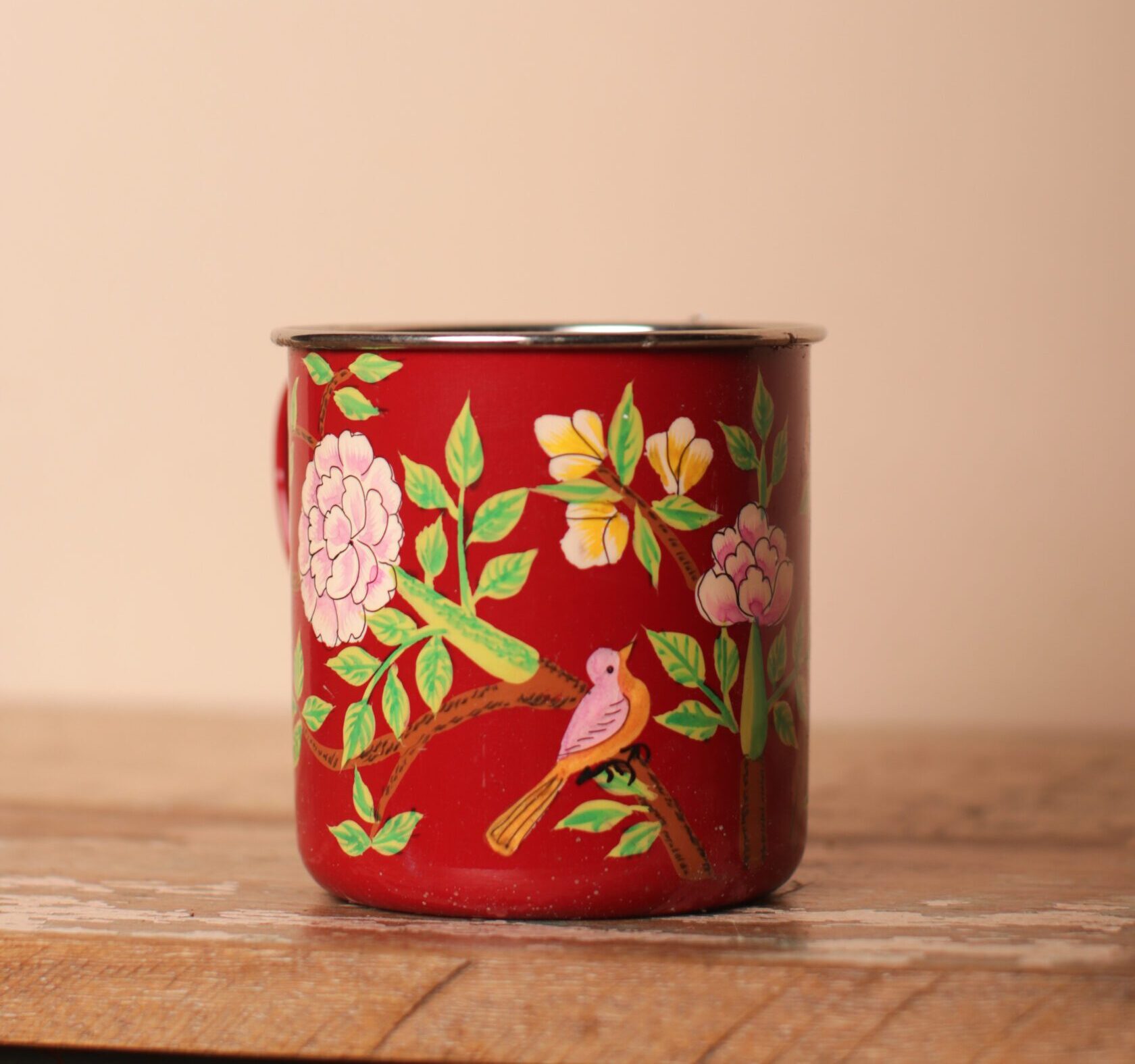 Discover the beauty and function of this Red Hand Painted Mug. Crafted from durable metal and adorned with traditional Kashmiri enamel artwork. Adorned with a lively floral pattern in shades of pink, purple, and white, which beautifully contrasts against the rich yellow background. Perfect for sipping your favorite hot beverage, this mug brings a piece of Kashmiri craftsmanship to your kitchen. The handle is designed for comfortable holding, and the mugÕs size is ideal for a hearty cup of coffee or tea.
