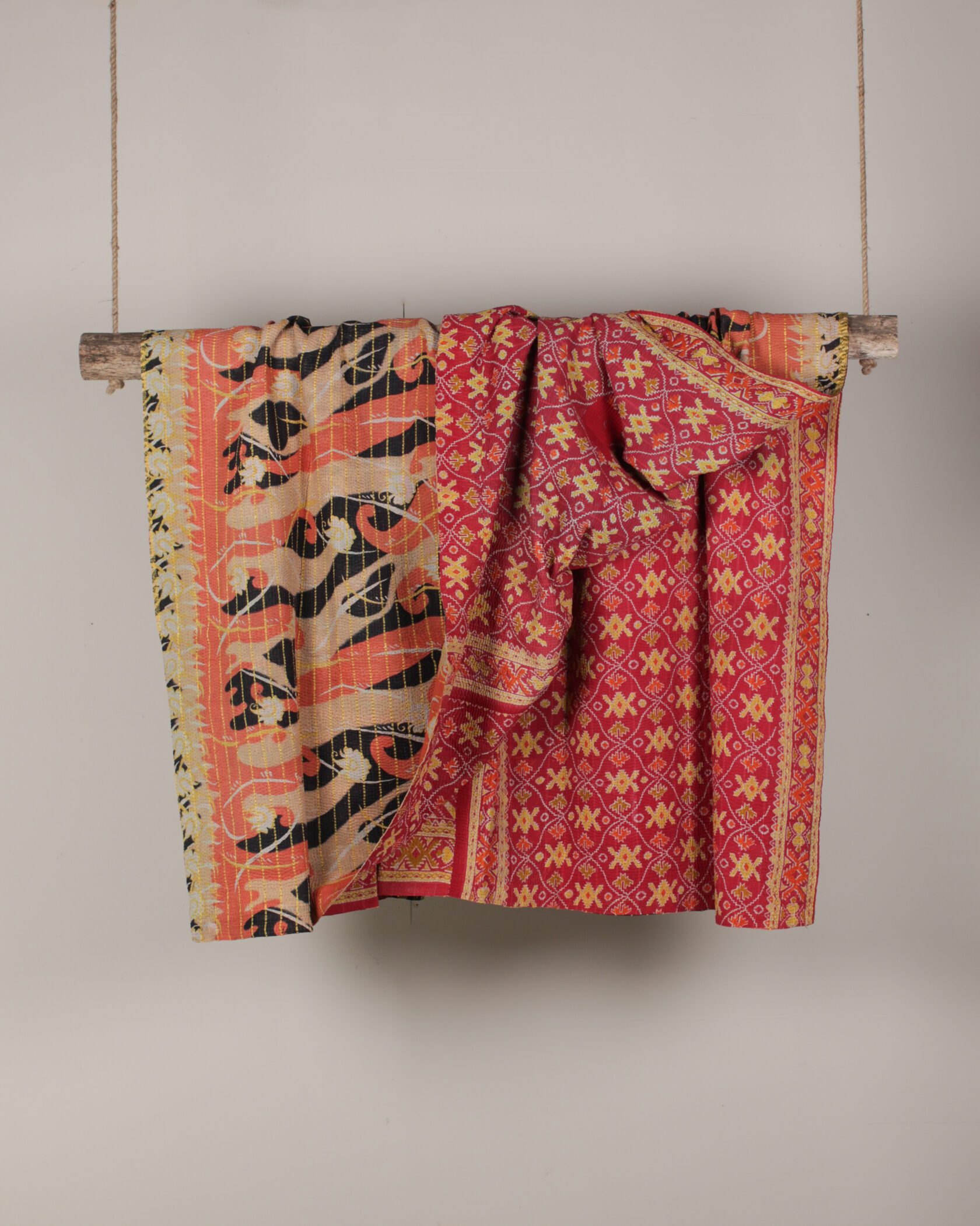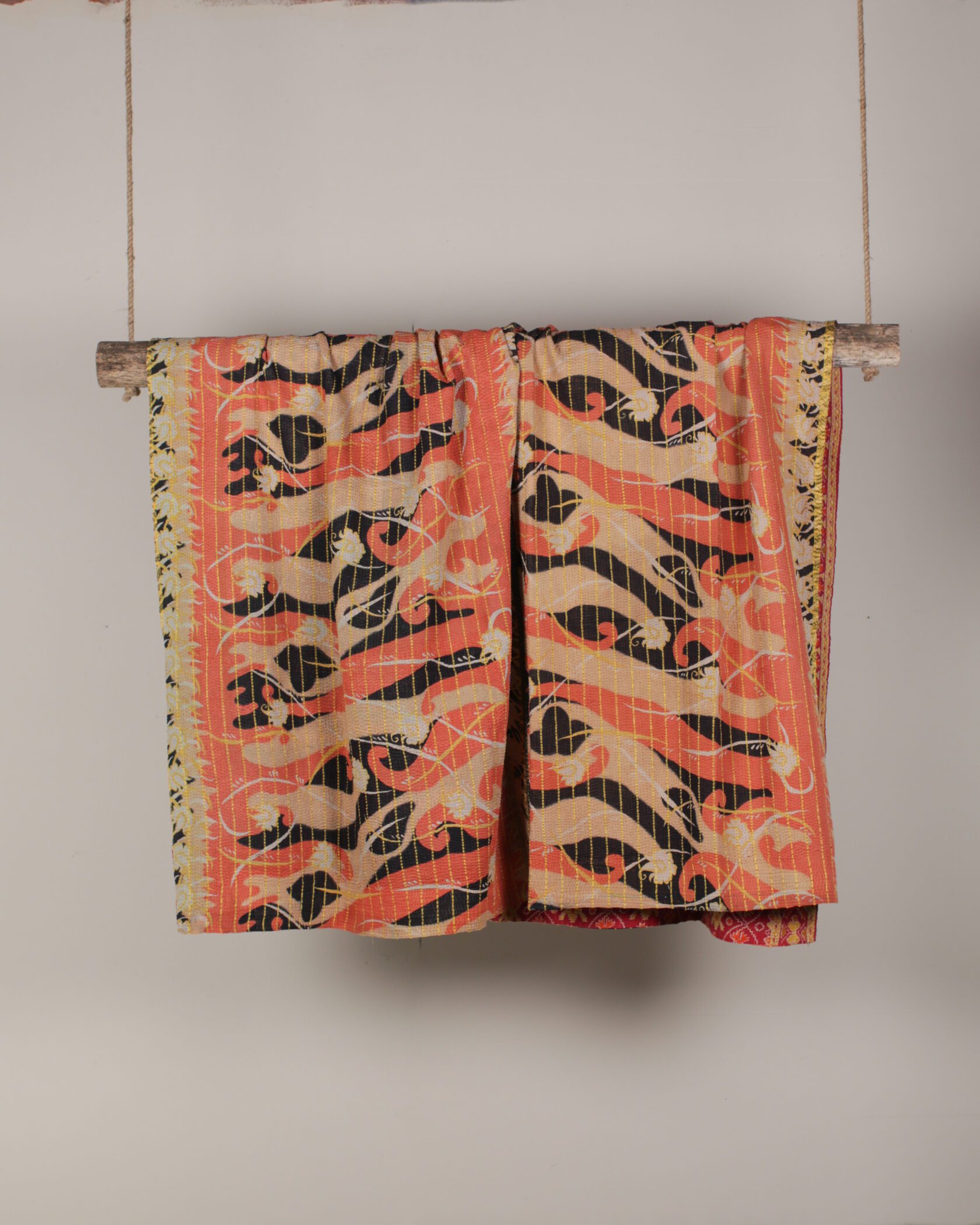 Double-sided Kantha throw featuring a bold and vibrant design. One side of the throw has a dynamic pattern of swirling black and beige motifs on an orange background, and the other contrasts with a rich red background adorned with geometric patterns.