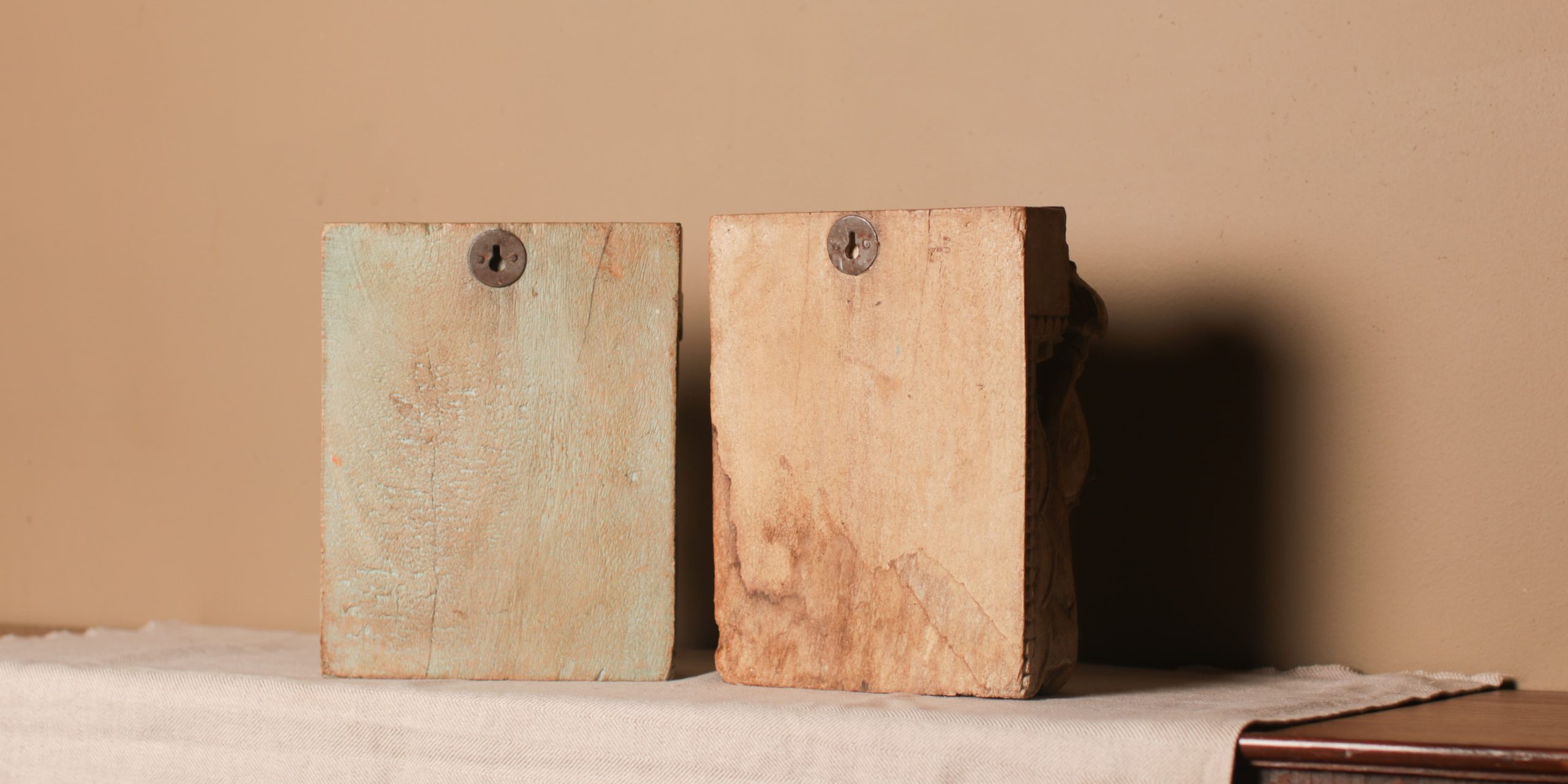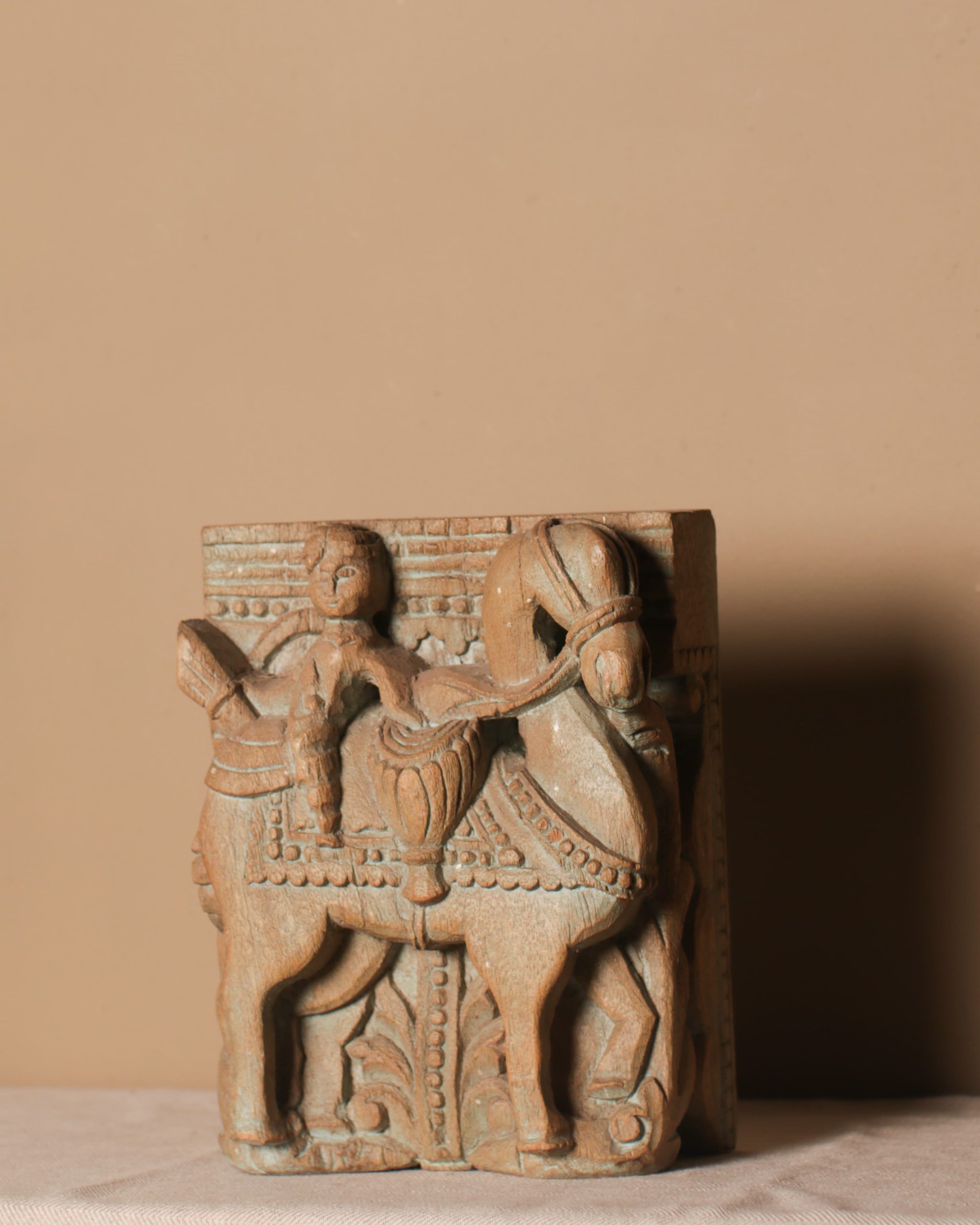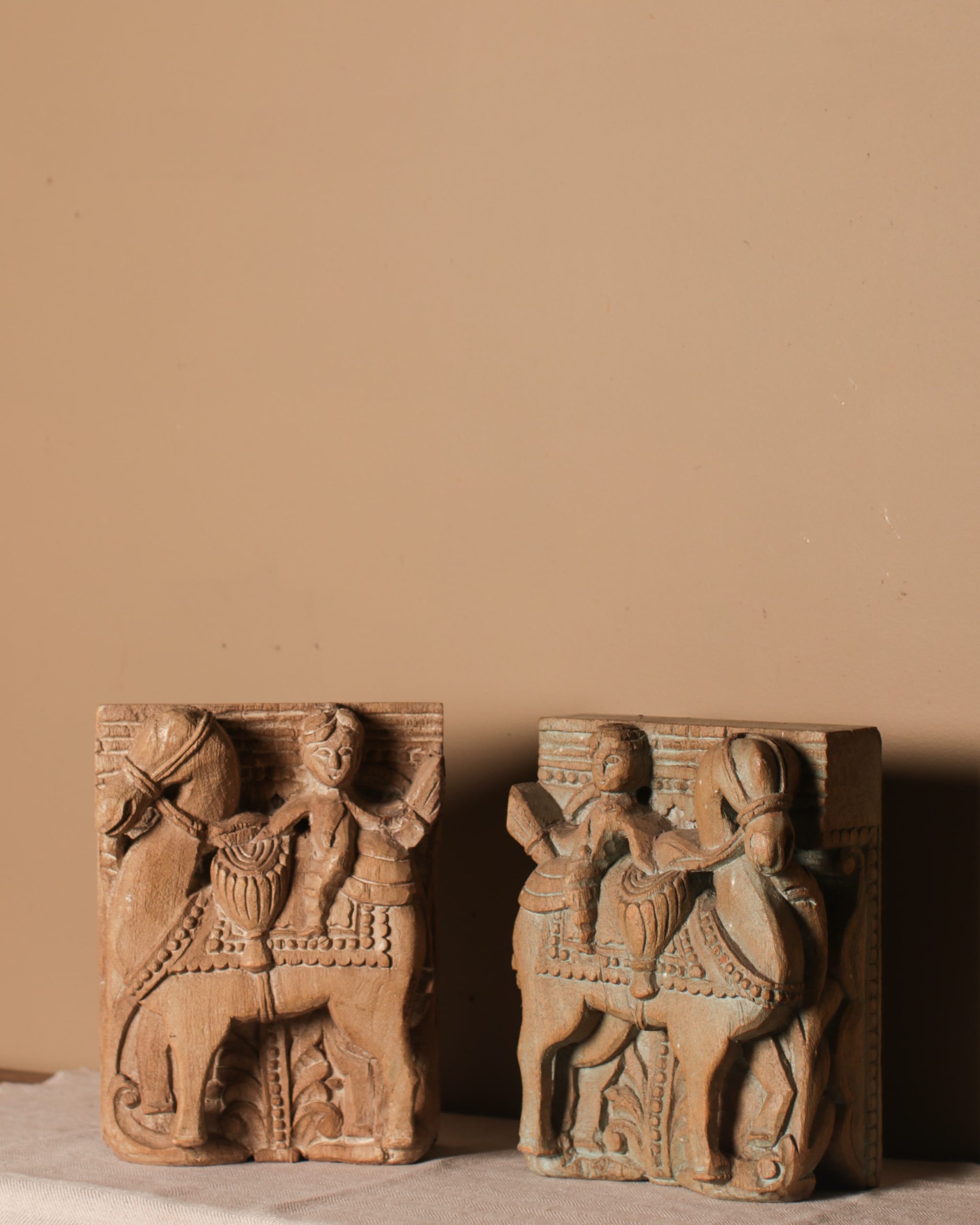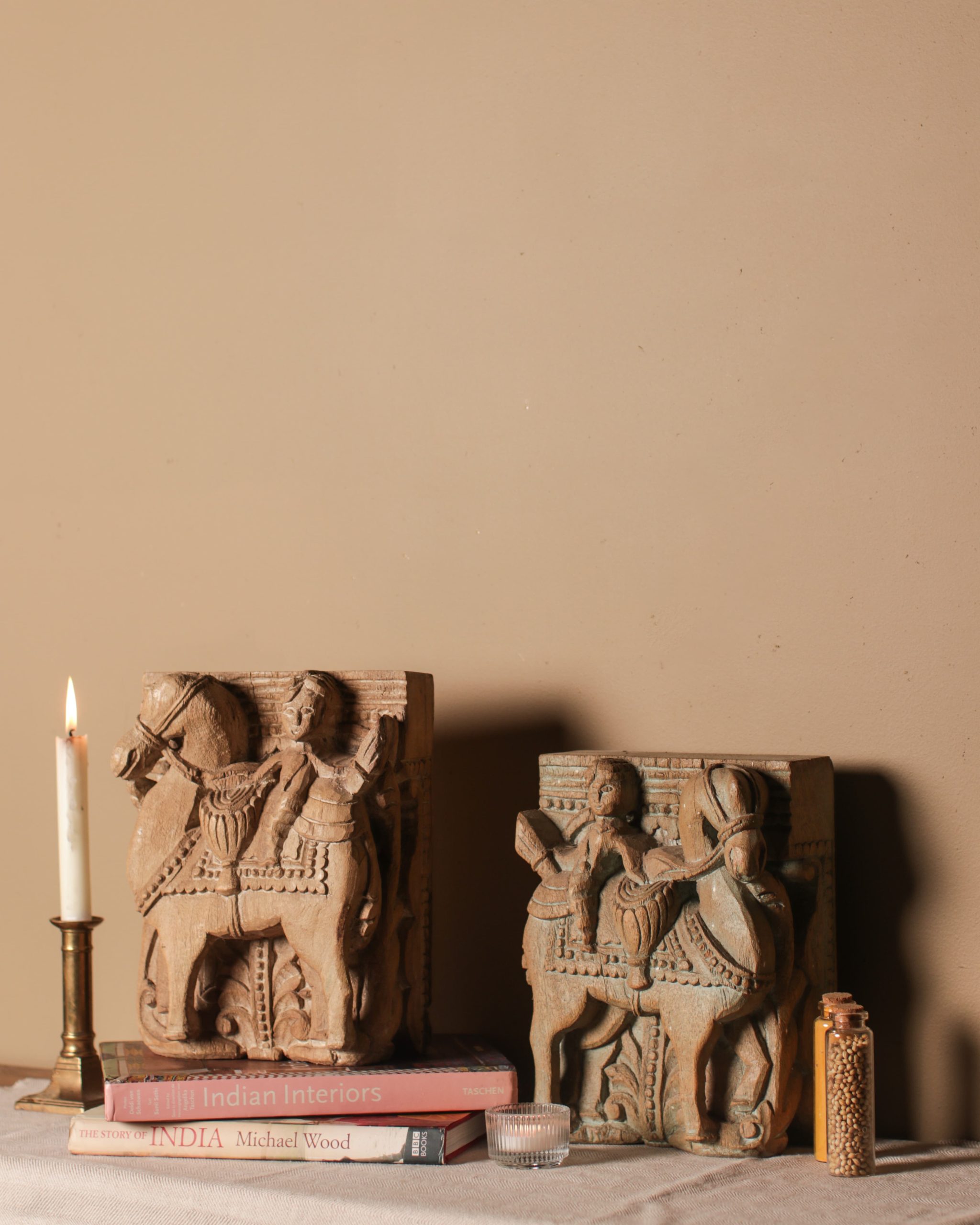 A pair of traditional horse brackets, intricately carved from light wood, embody the significance of horses in Indian culture as symbols of power and prestige. Each bracket showcases detailed craftsmanship, with unique carvings of figures riding horses dressed in ceremony accessories.