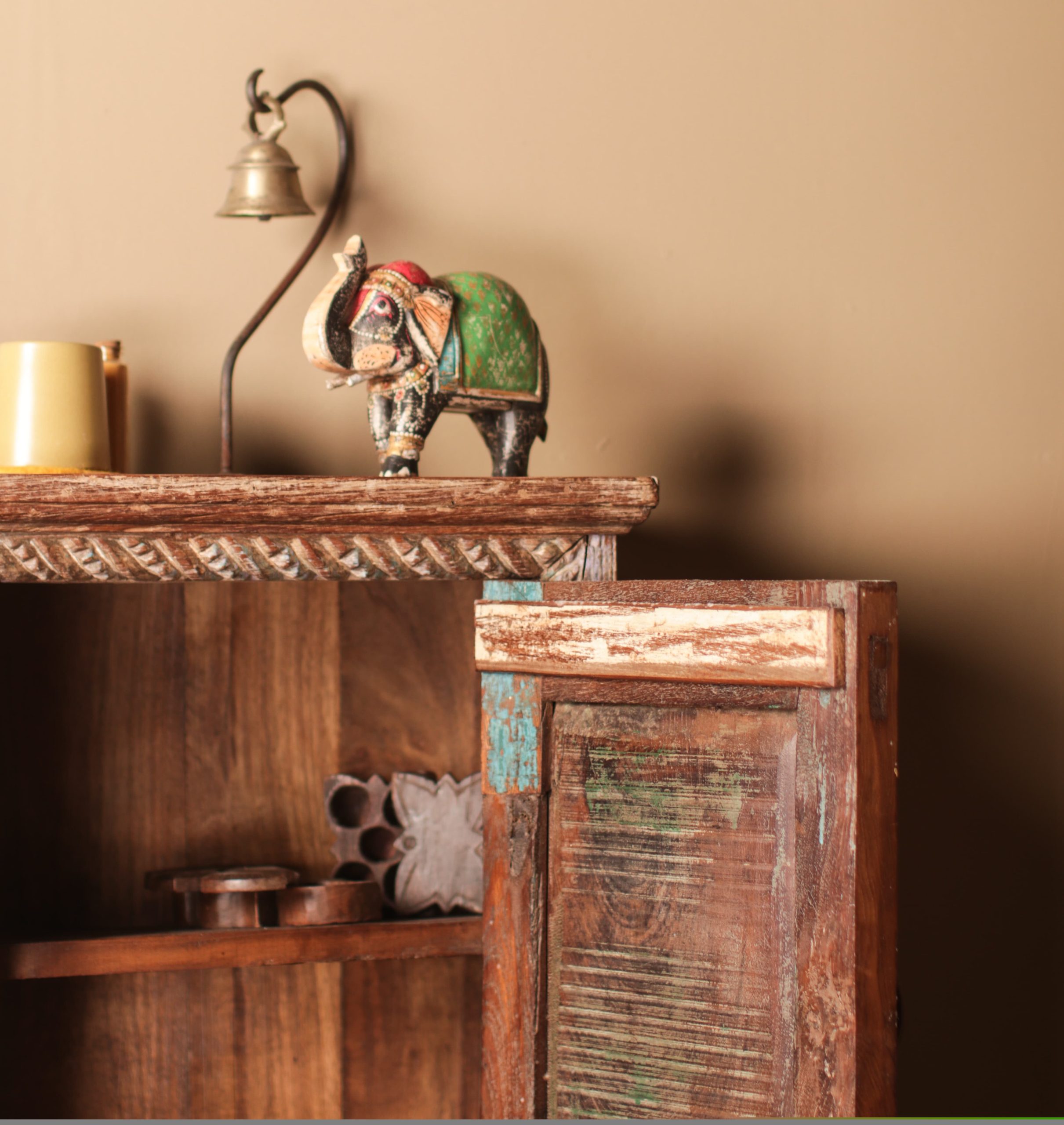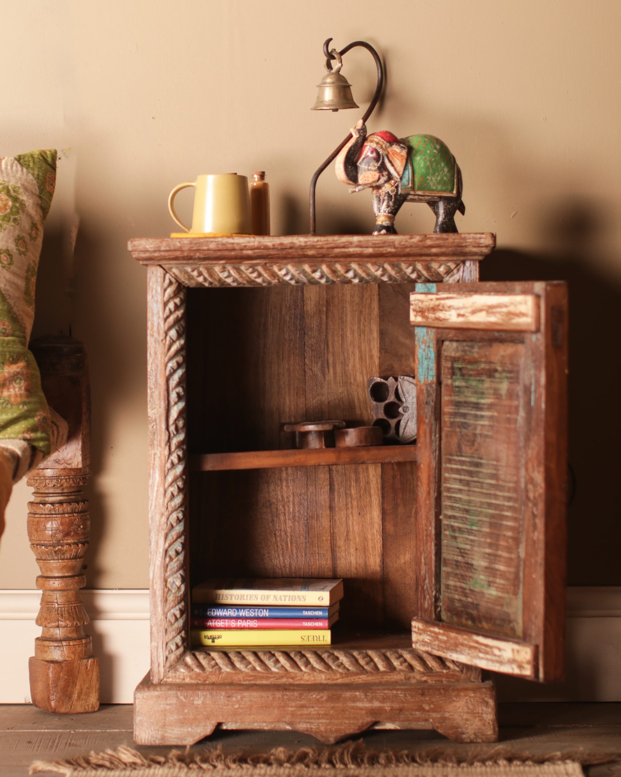 Bring a touch of artisanal charm to your home with this Small Bedside Cupboard. Crafted from reclaimed hardwood, this sturdy piece showcases the wood’s natural beauty and unique grain. The cupboard features a richly carved door adorned with traditional motifs. A practical shelf maximises the storage space inside, perfect for keeping your night-time essentials or favourite books within easy reach.