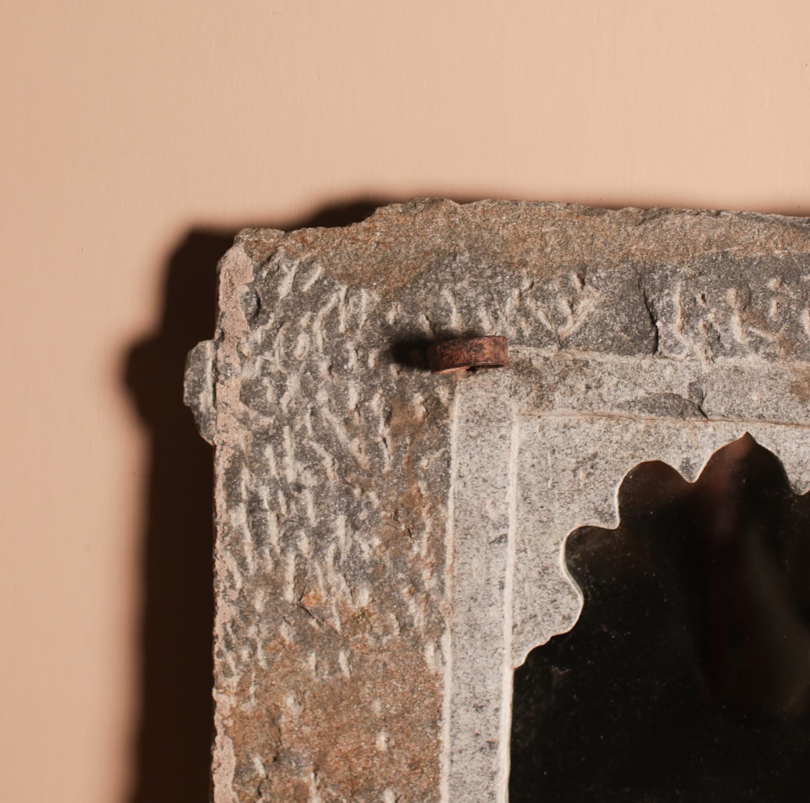 A rare piece to find, this Stone Shrine Mirror originally served as a window in a traditional Indian building. The stone frame has now been repurposed into a stunning mirror with a striking and tactile patina.