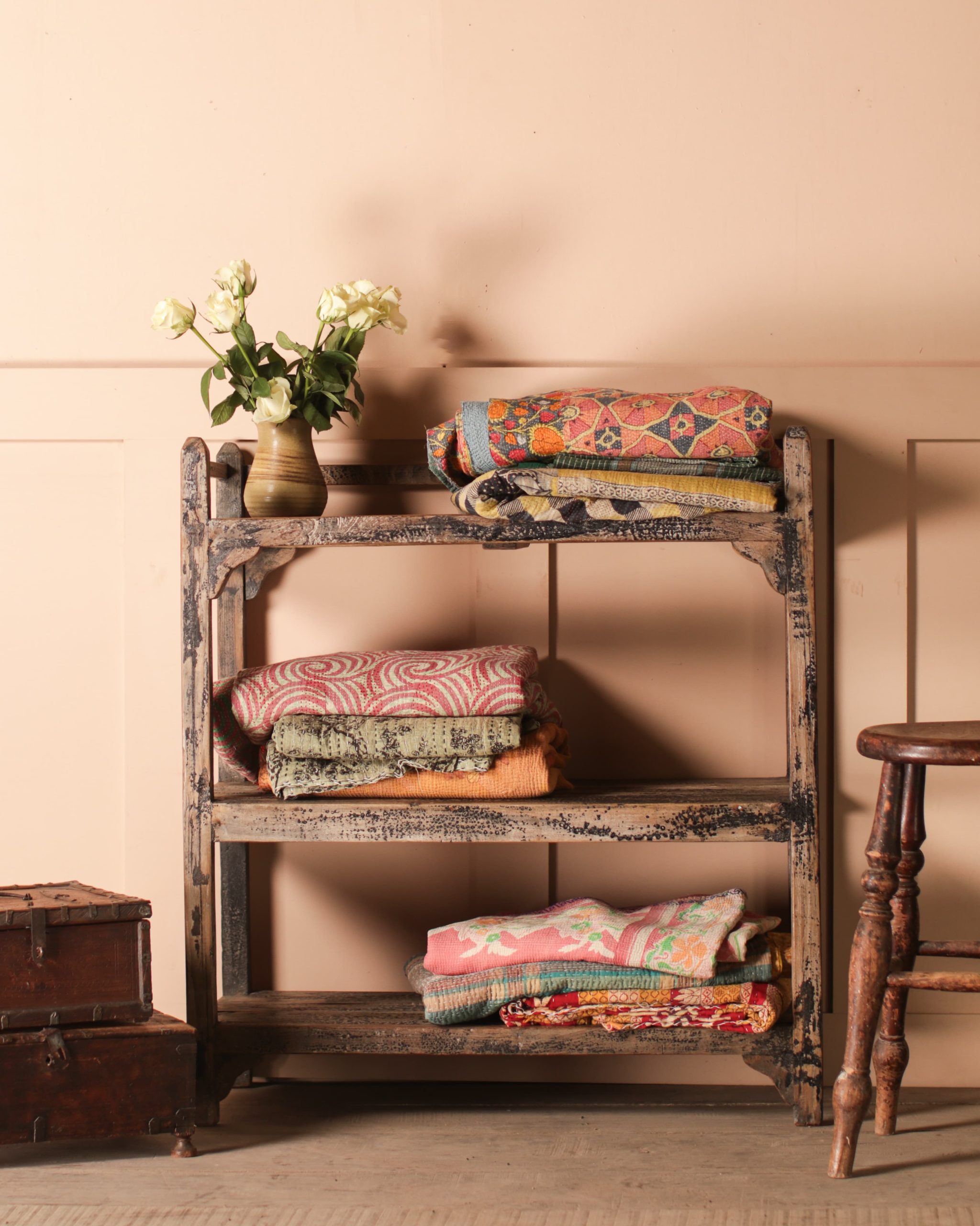 Crafted from solid teak, these Wooden Shelves have a unique, heavily distressed finish adorned with a combination of black and white paint. Handcrafted with a sturdy body, these Wooden Shelves offer generous storage space across three levels, perfect for displaying everything from cherished books to vibrant textiles. The subtle yet stylish design integrates effortlessly into both modern and traditional interiors.