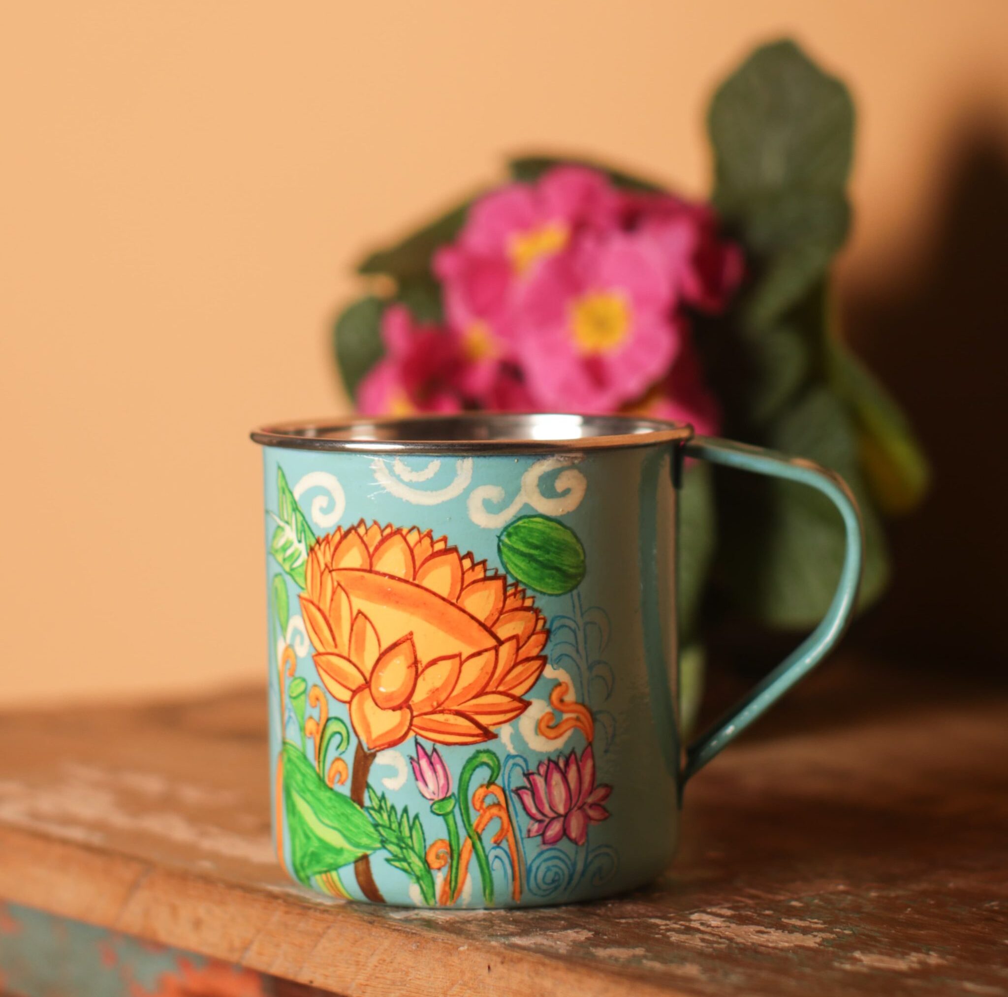 Discover the beauty and function of this Teal Floral Hand Painted Mug. Crafted from durable metal and adorned with traditional Kashmiri enamel artwork. Adorned with a radiant lotus design in vibrant shades of orange, pink, and green set against a soothing teal background. Perfect for sipping your favourite hot beverage, this mug brings a piece of Kashmiri craftsmanship to your kitchen. The handle is designed for comfortable holding, and the mugs size is ideal for a hearty cup of coffee or tea.