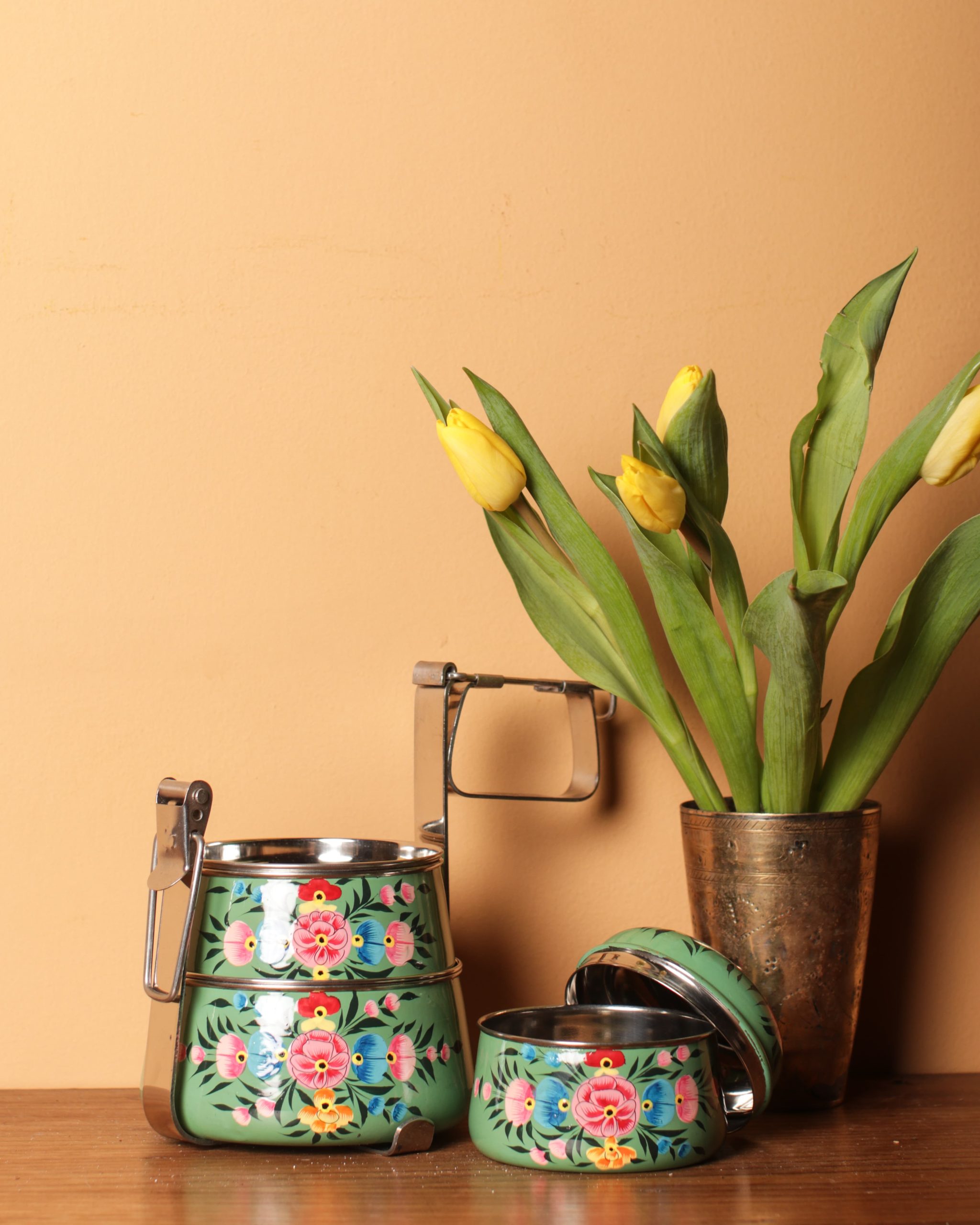Stainless steel Tiffin Tin with three hand-painted Kashmiri floral tiers.