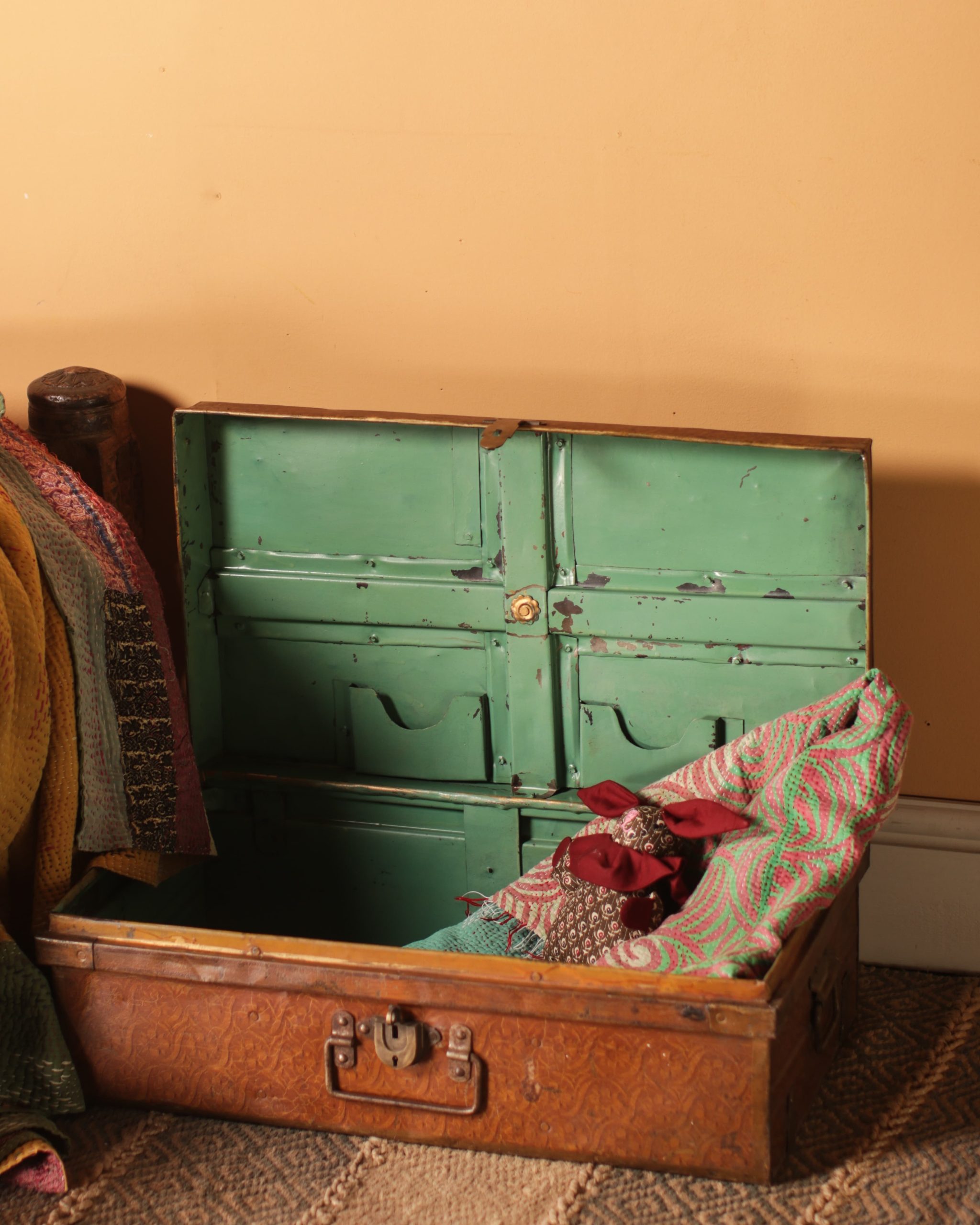 The trunk’s exterior is adorned with a charming floral motif, giving it a distinguished appearance amidst the rich brown colour. Contrastingly, the cool blue interior offers a refreshing surprise whilst providing a spacious compartment to store valuables. This trunk features sturdy brass clasps, showcasing the detailed craftsmanship that went into this unique piece.