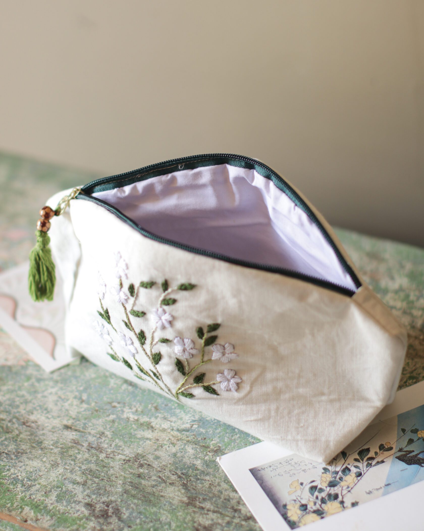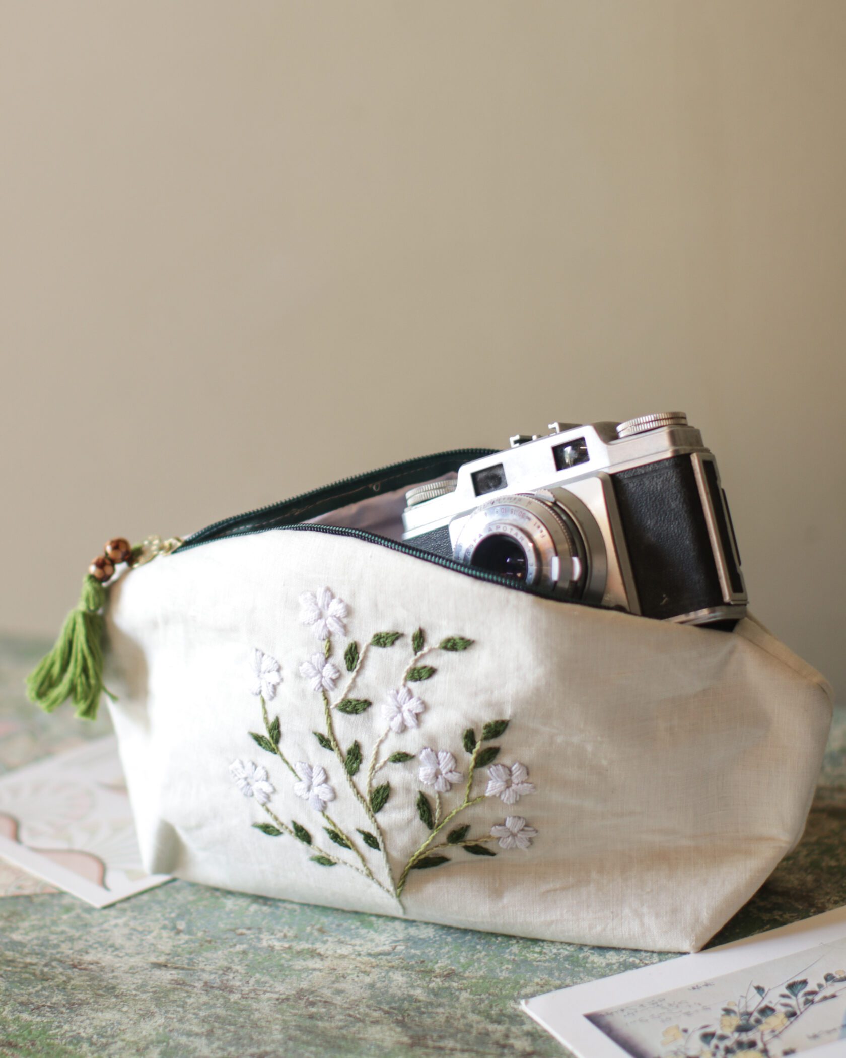 Artisanal Hand-Embroidered Pouch, a one-of-a-kind accessory supporting women’s empowerment.