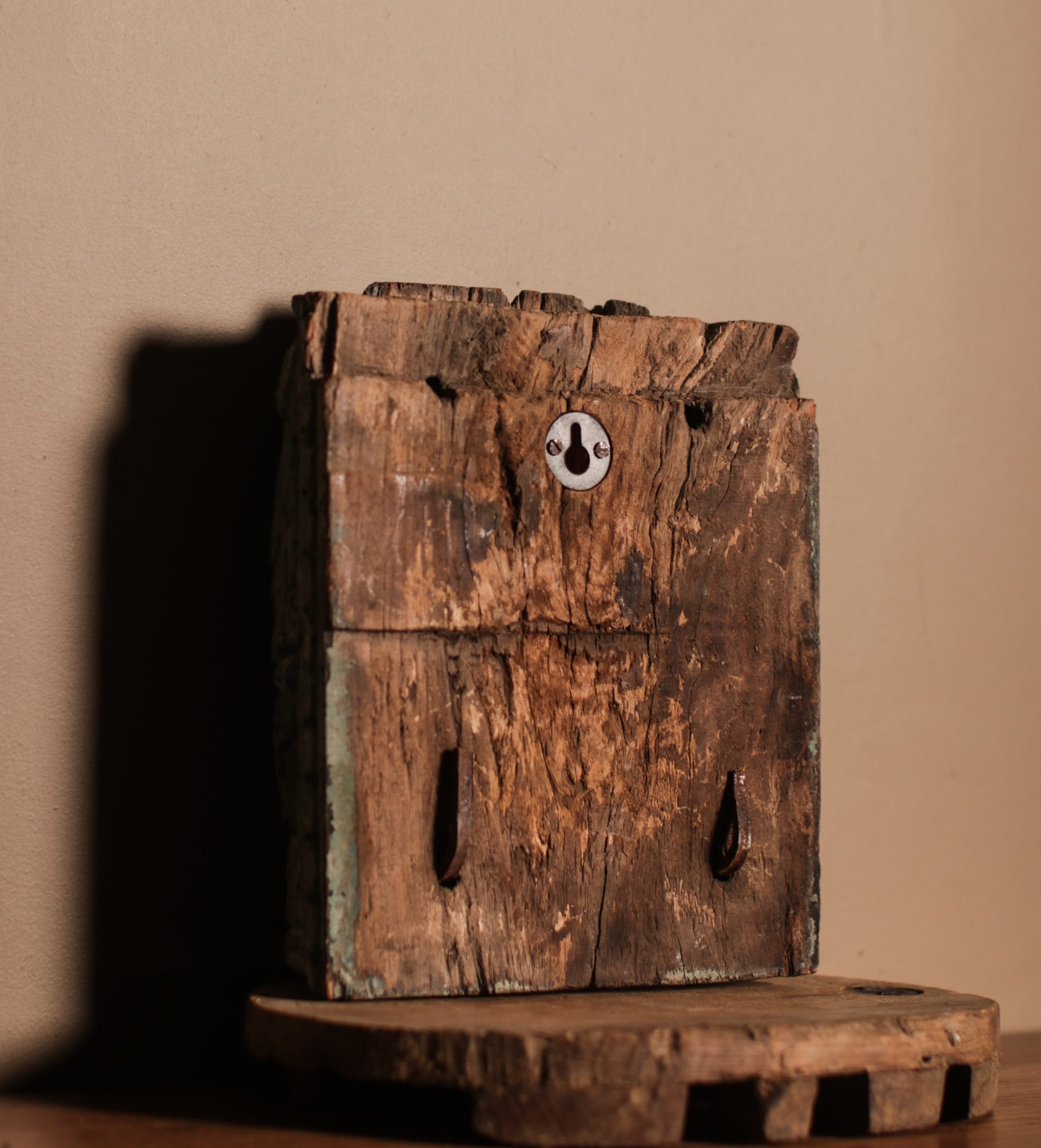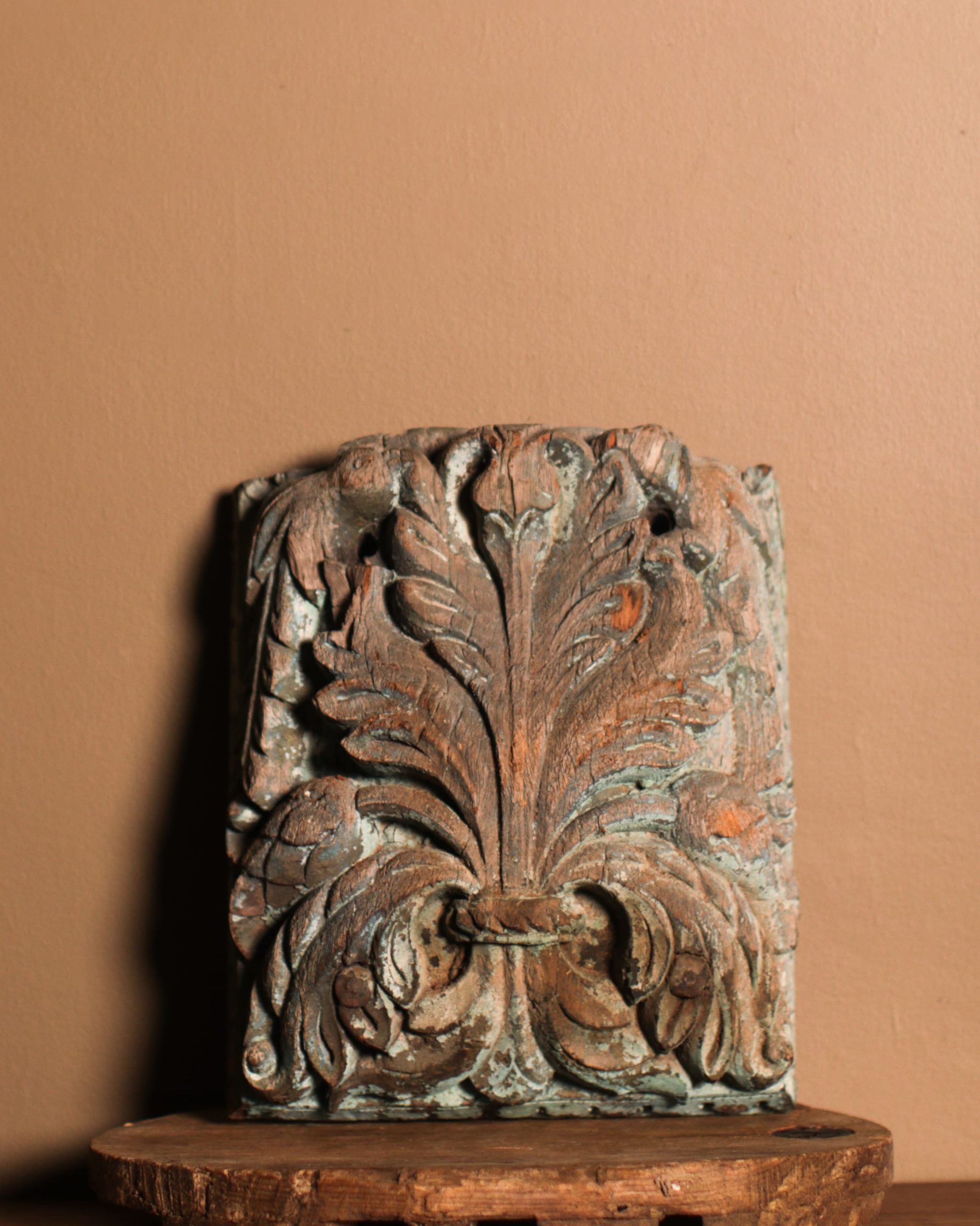 A hand-carved floral wooden panel, finished with a stunning blue patina that highlights its age and history. This piece can be freestanding or hung on the wall using the back keyhole hook.