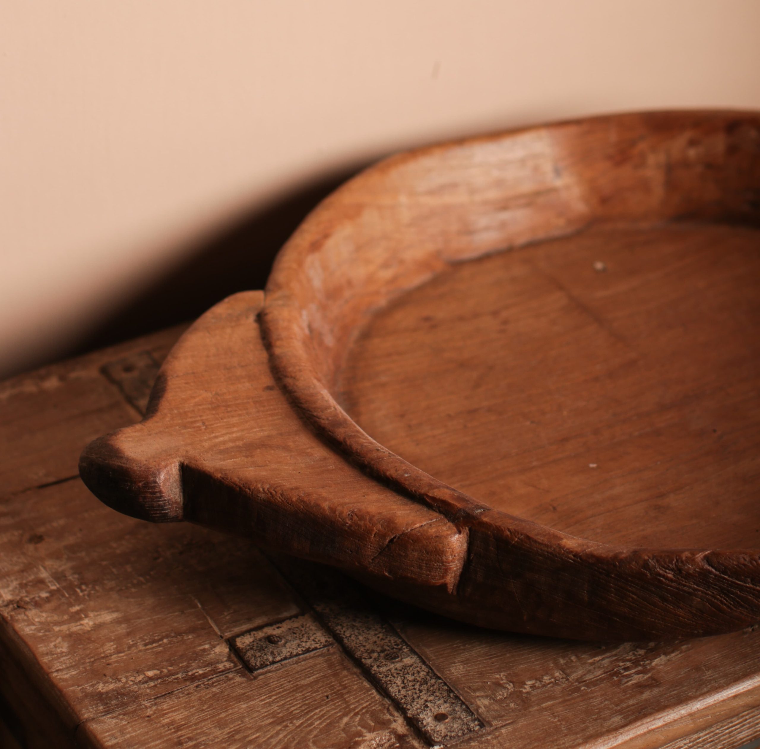 Originally used in India for kneading dough or serving Rotis, this hand-carved vintage wooden parat bowl features a deep, rounded basin and thick edges. With handles carved directly into the sides for easy lifting, this bowl makes the perfect fruit bowl. Its finish is aged, giving it a rich, weathered patina that adds to its rustic charm.