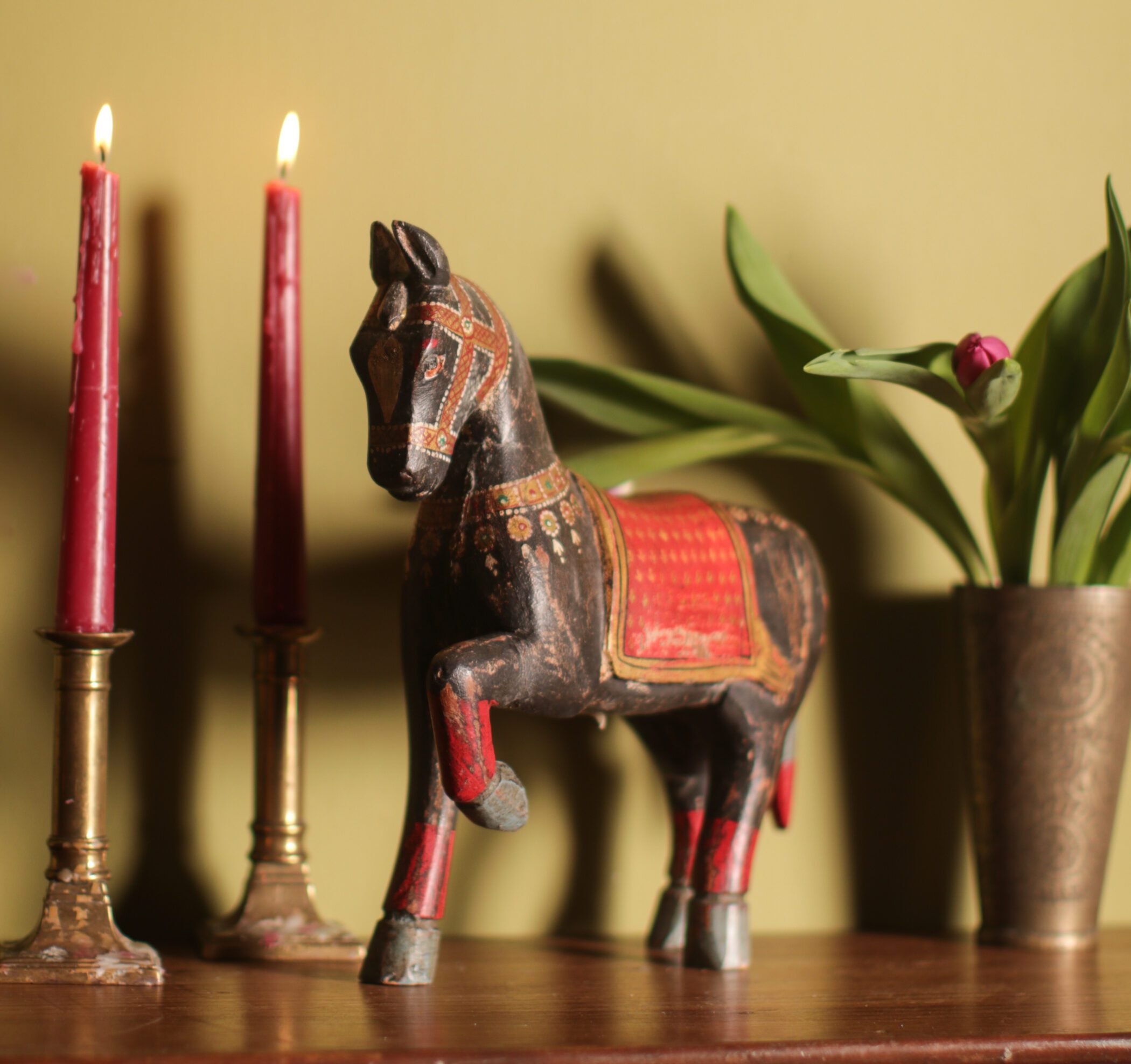 Hand-painted wooden horse with intricate details & vibrant colours.