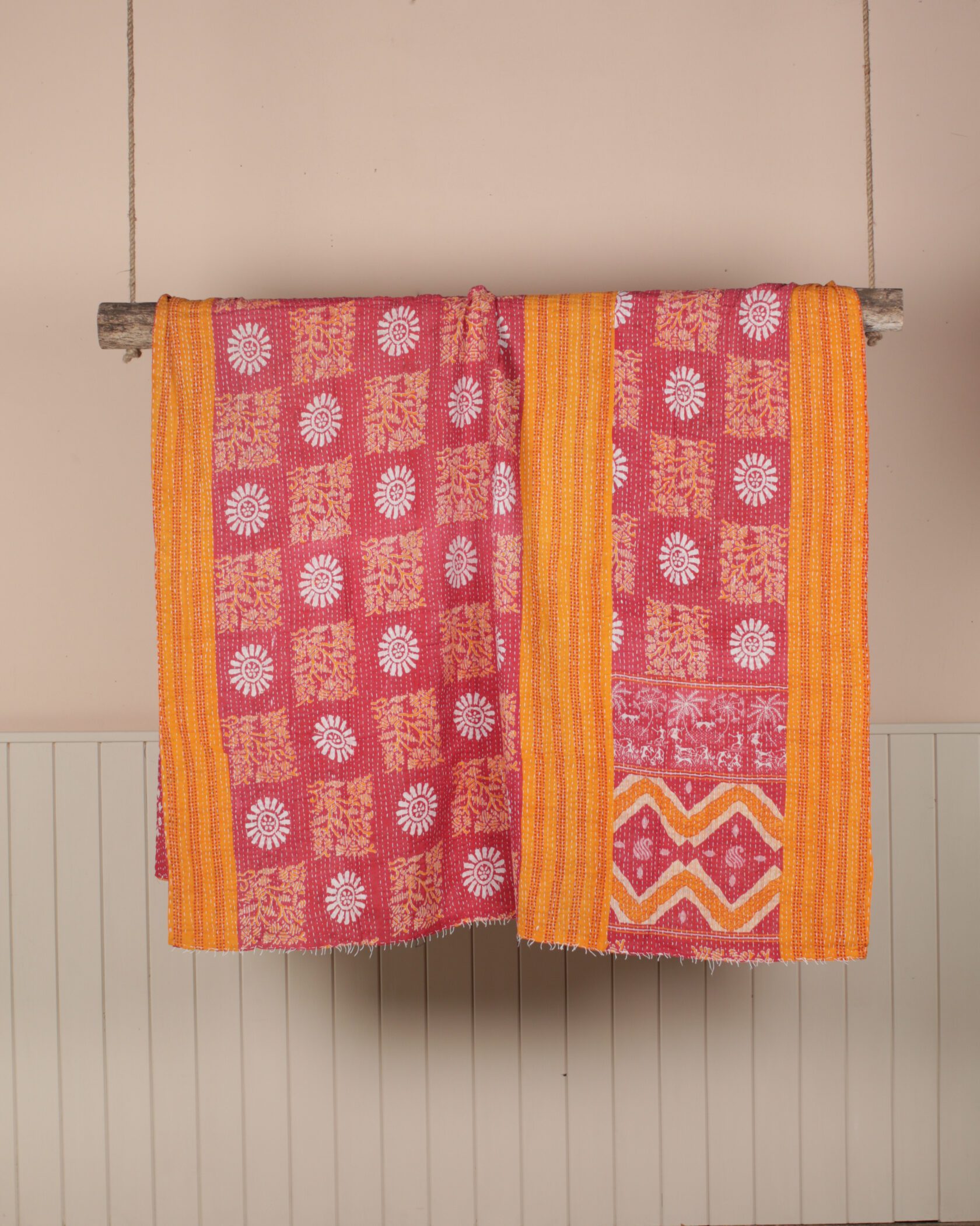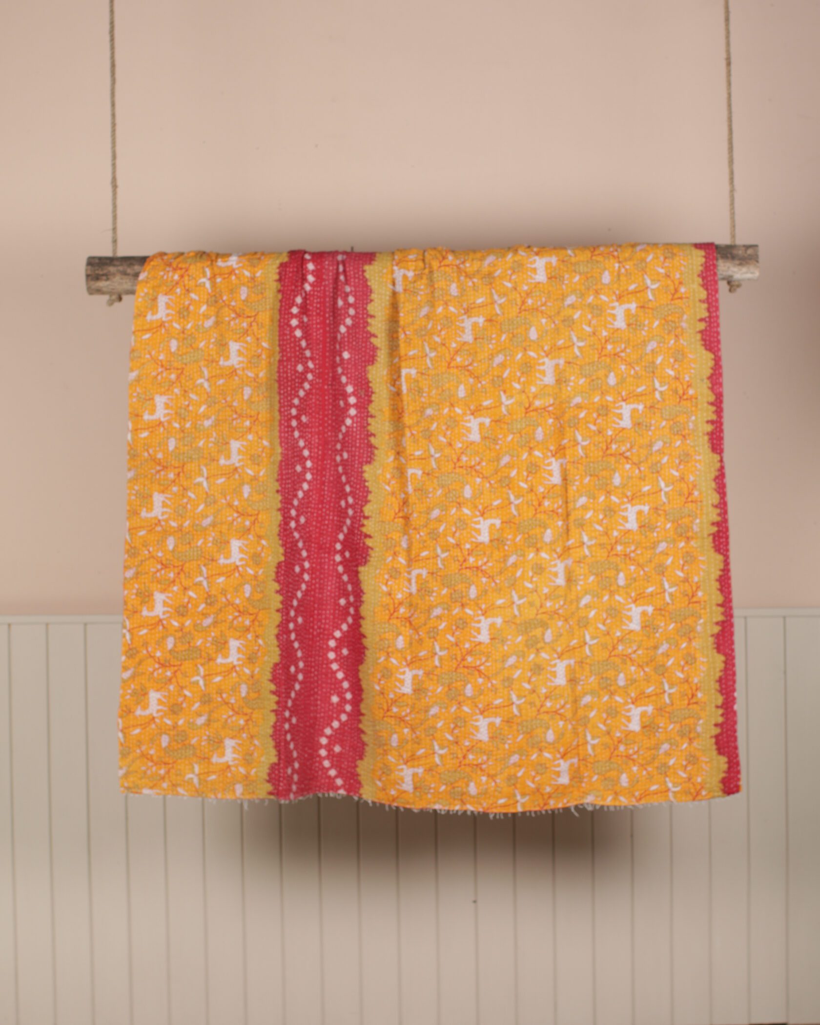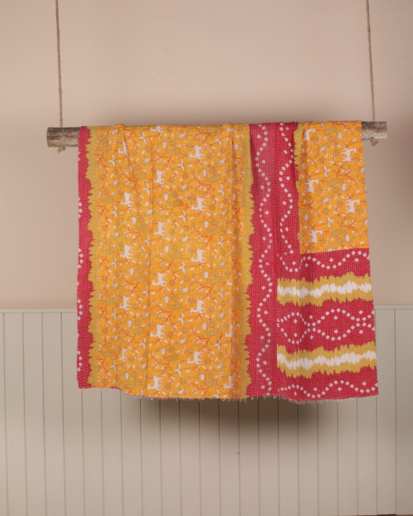 A bold reversible Kantha throw that combines vibrant yellow and red fabric with a deer pattern on one side and deep reds and oranges with an intricate floral motif on the other.