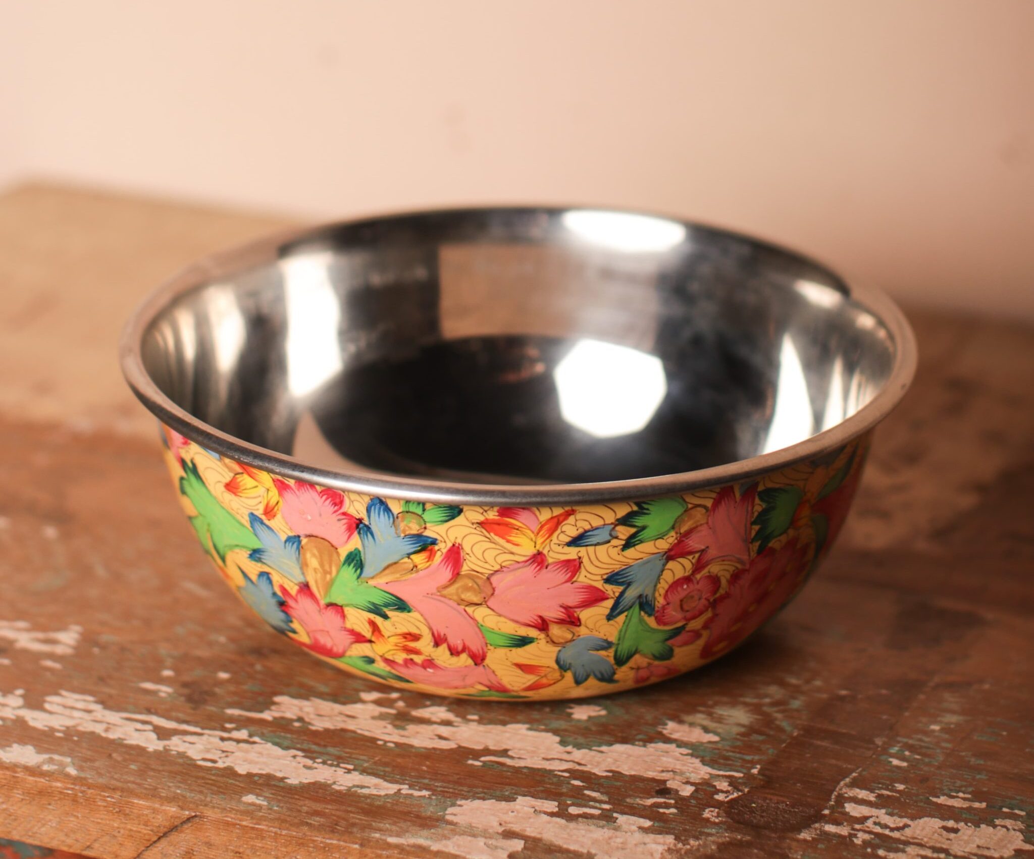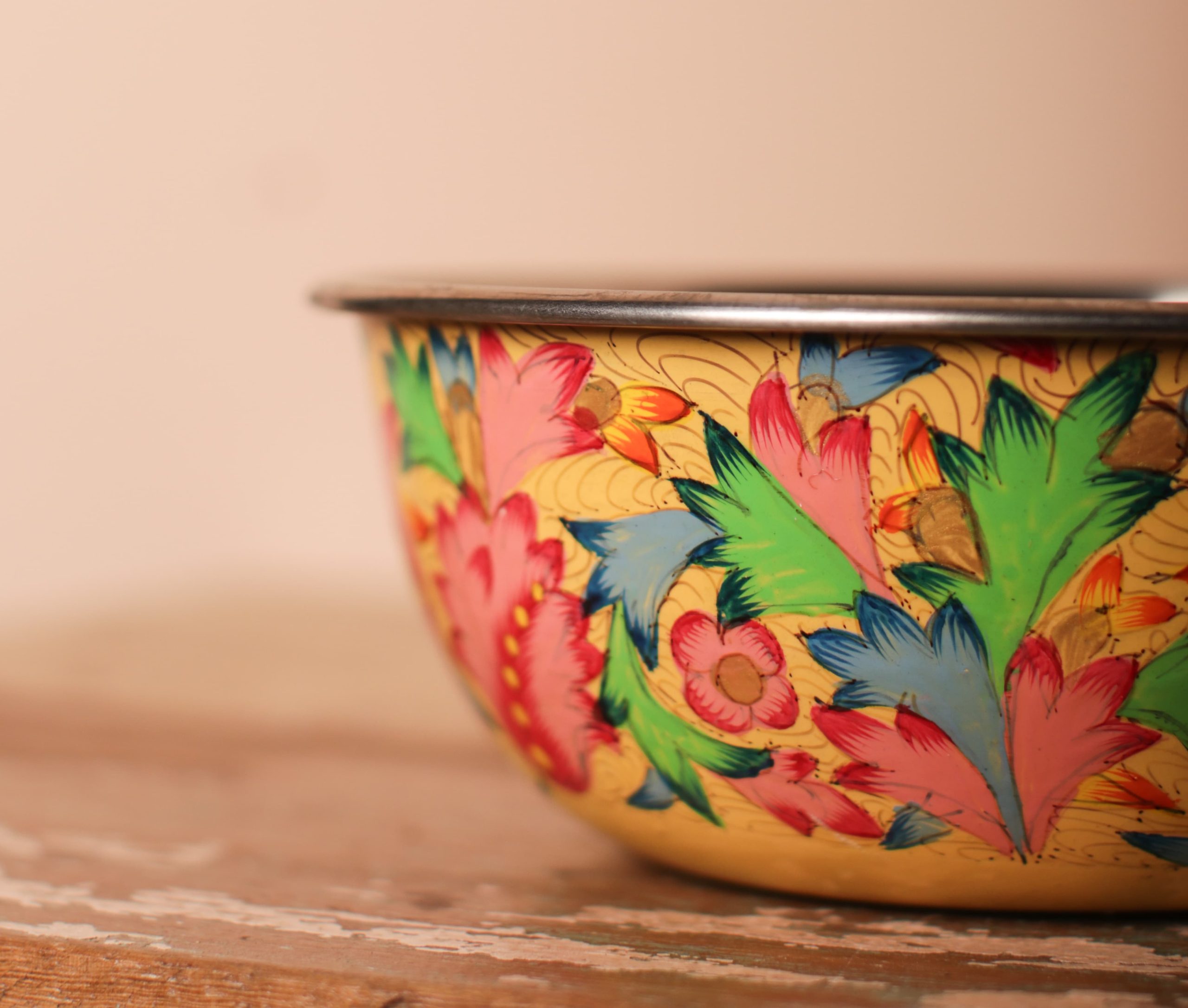 Hand-painted bowl from Kashmir showcasing traditional craftsmanship with vibrant floral patterns that reflect the region’s artistic skills. The bowl showcases a lively pattern of blue and pink flowers set against a bright yellow background. Whether used to serve snacks or as a decorative storage piece, this bowl will add charm to any setting.