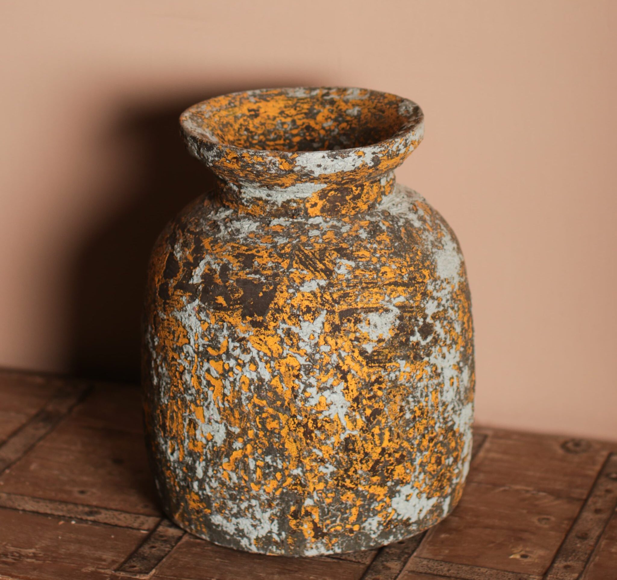 Traditionally used to store ghee in Indian kitchens, this pot showcases a vibrant Pollock design. Ghee, a vital ingredient in Indian cooking, would have been stored in such pots. Now, with its striking yellow and blue speckled finish, this pot will add a splash of colour to any space.